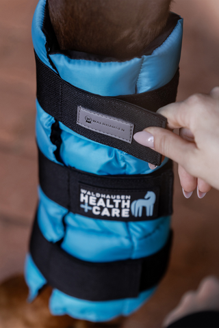 Med detta täcke kan vatten sparas och hästens kroppstemperatur sänkas jämnt samtidigt. Täcket har en praktisk påse som sänks ned i en hink med vatten tillsammans med täcket.