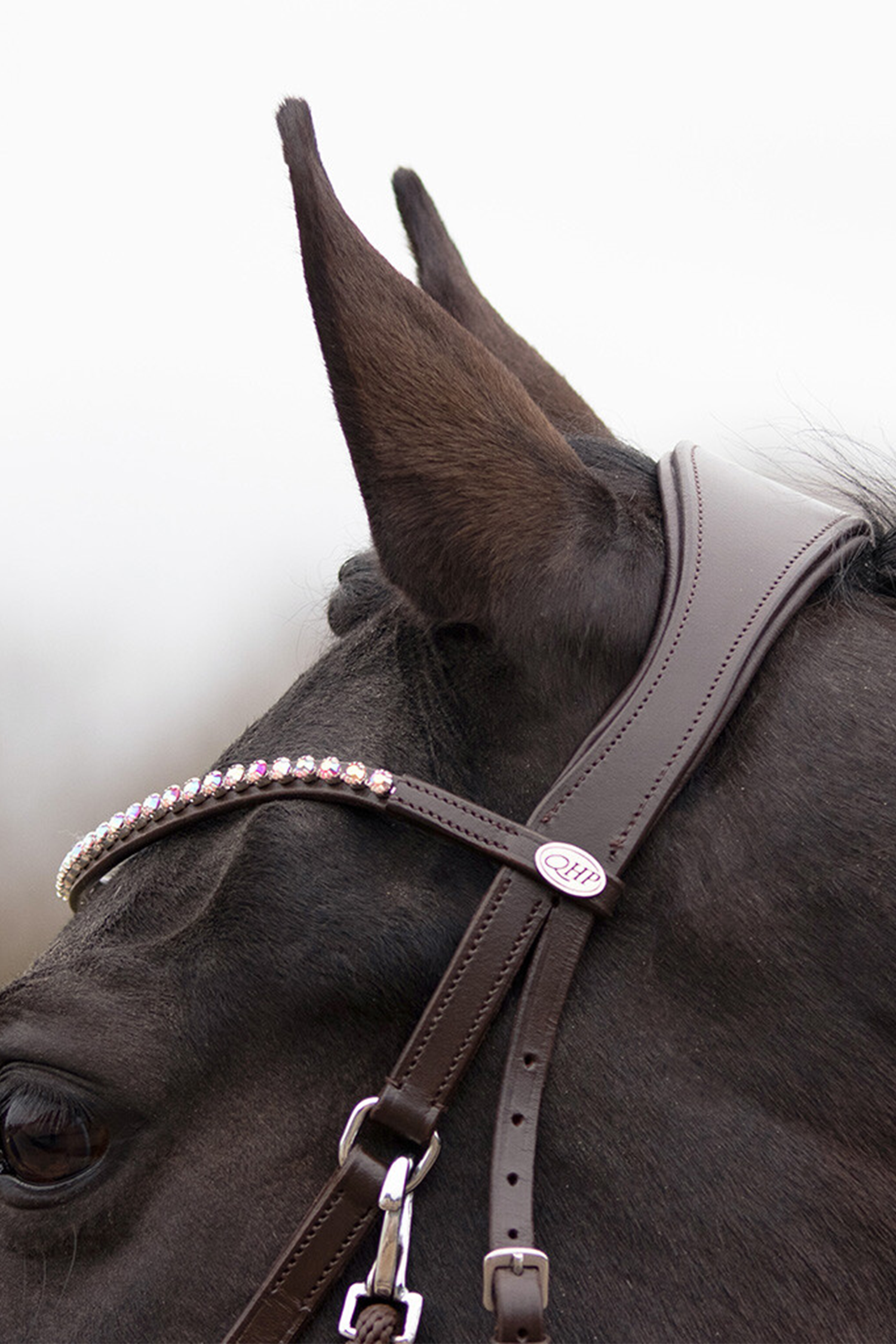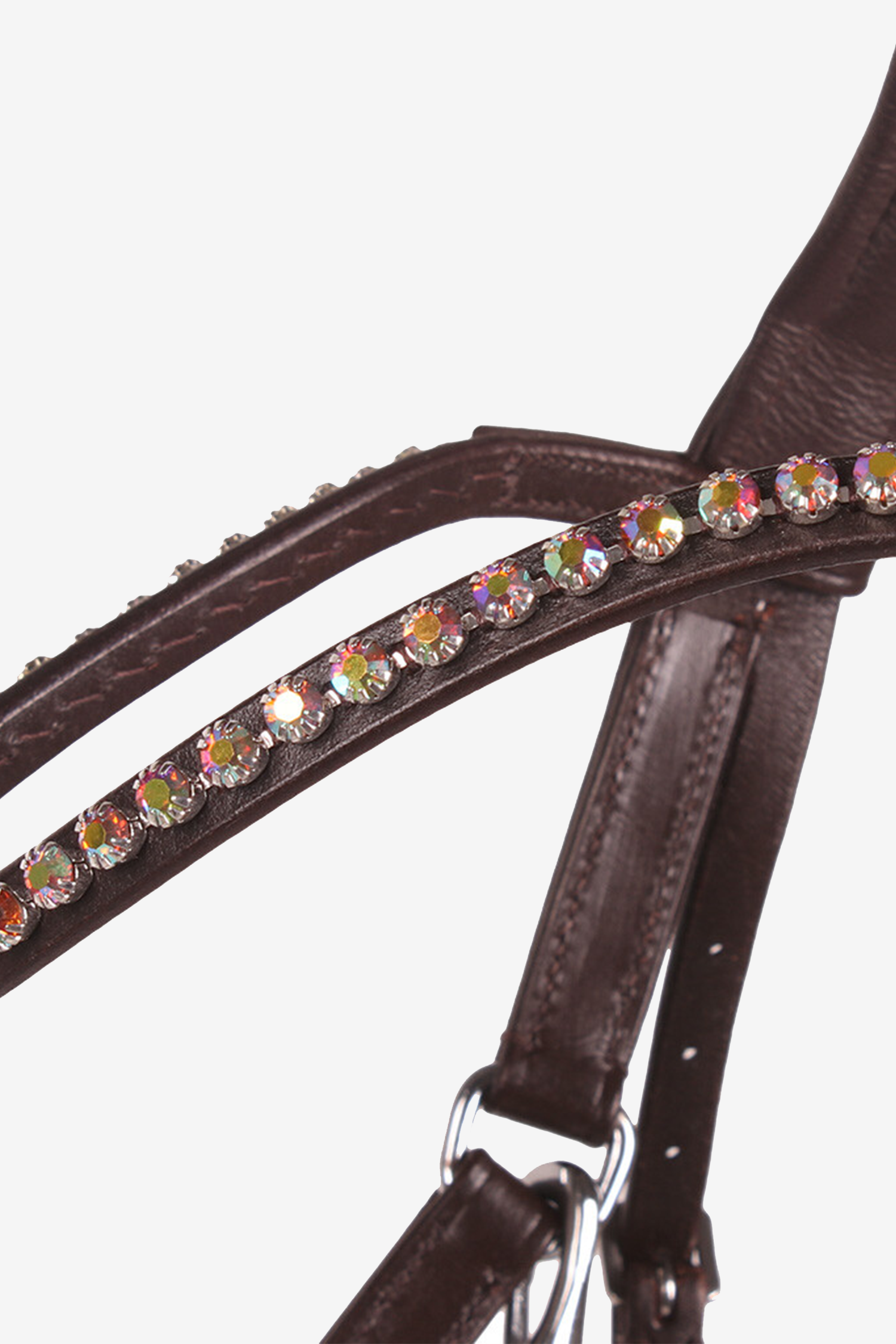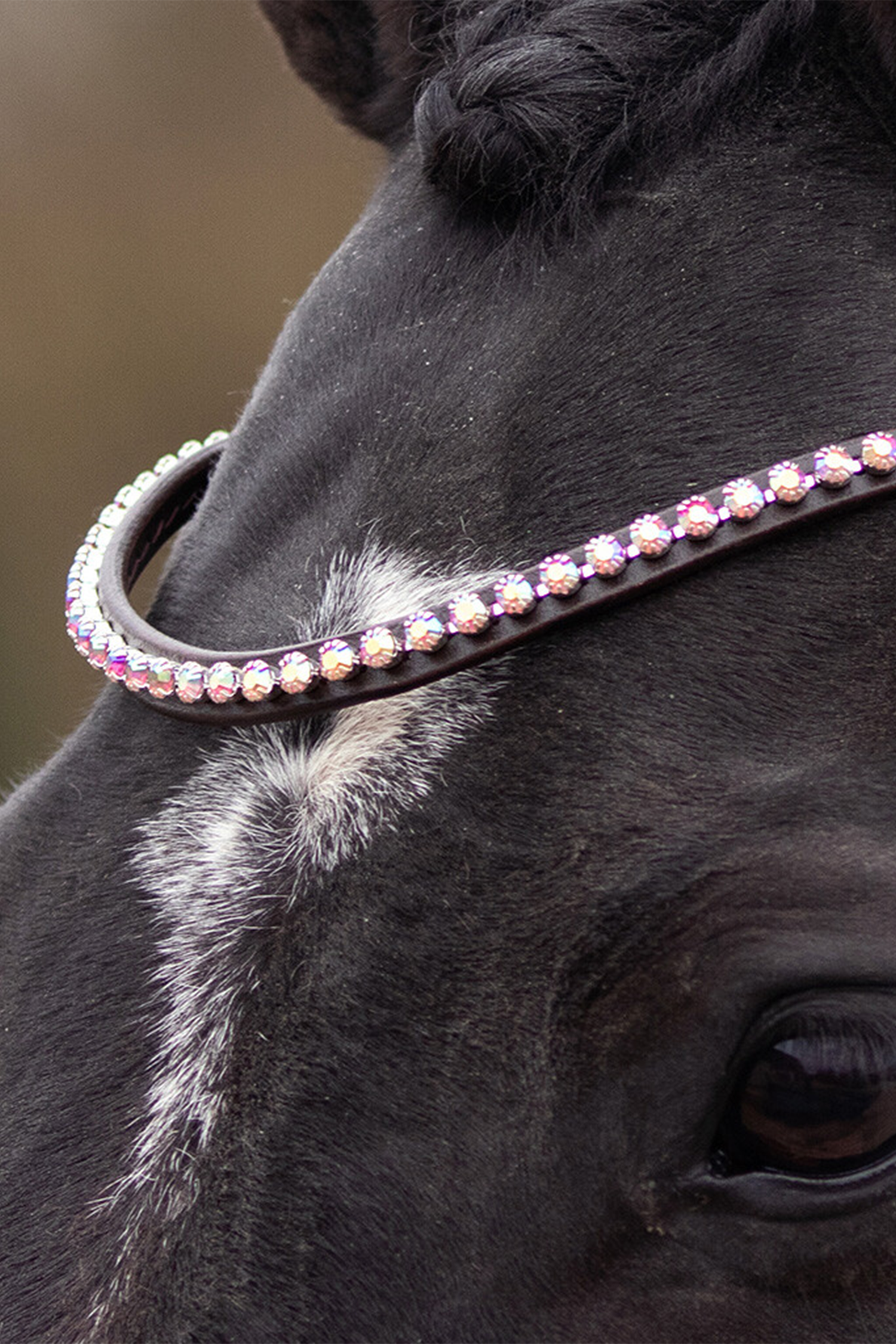 Upptäck ett träns som kombinerar funktion, komfort och elegans – ett bettlöst träns i läder med ett stilfullt pannband dekorerat med gnistrande rhinestones i regnbågsskimrande färger. Perfekt för dig som vill rida bettlöst och samtidigt ha möjlighet att variera mellan olika alternativ.