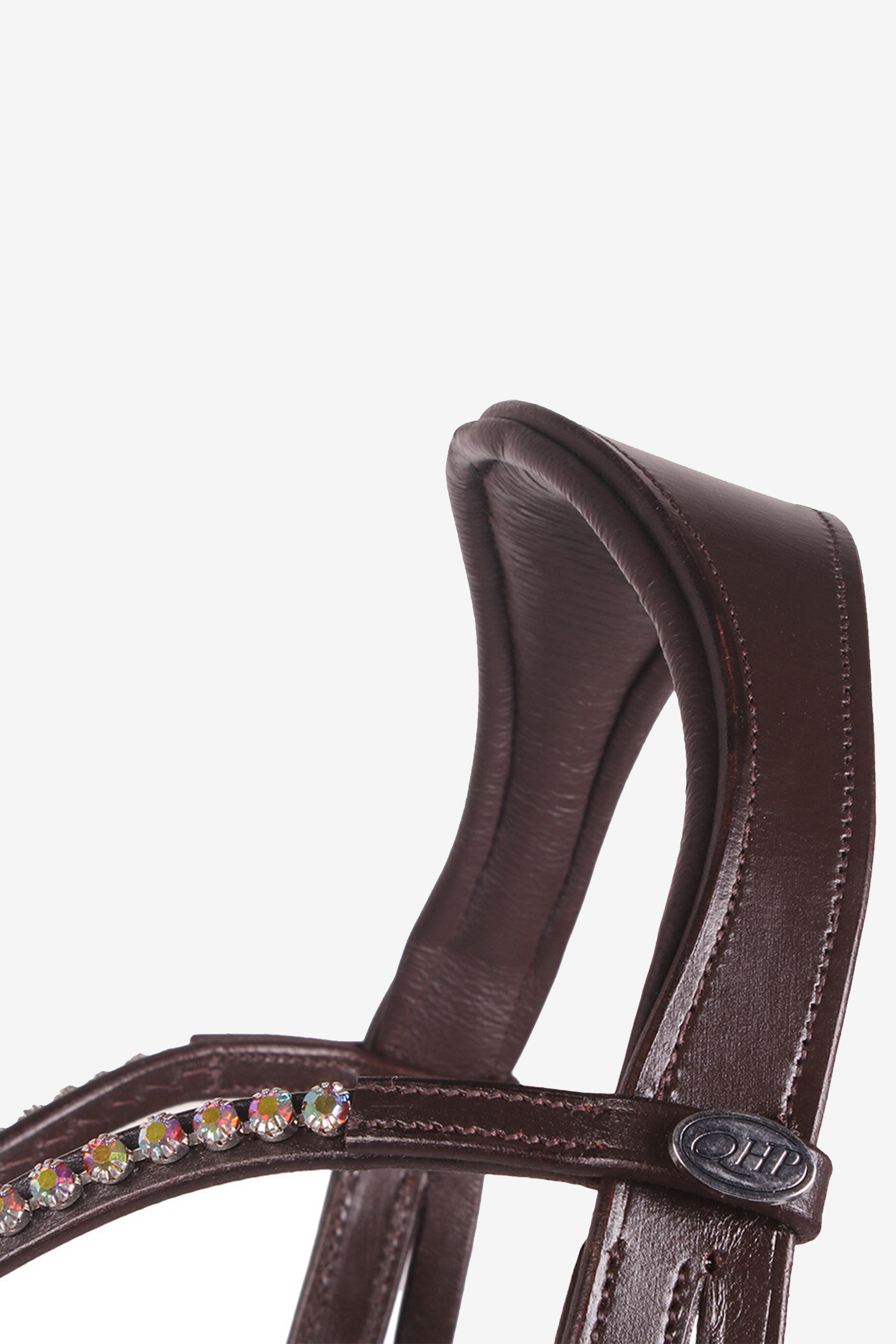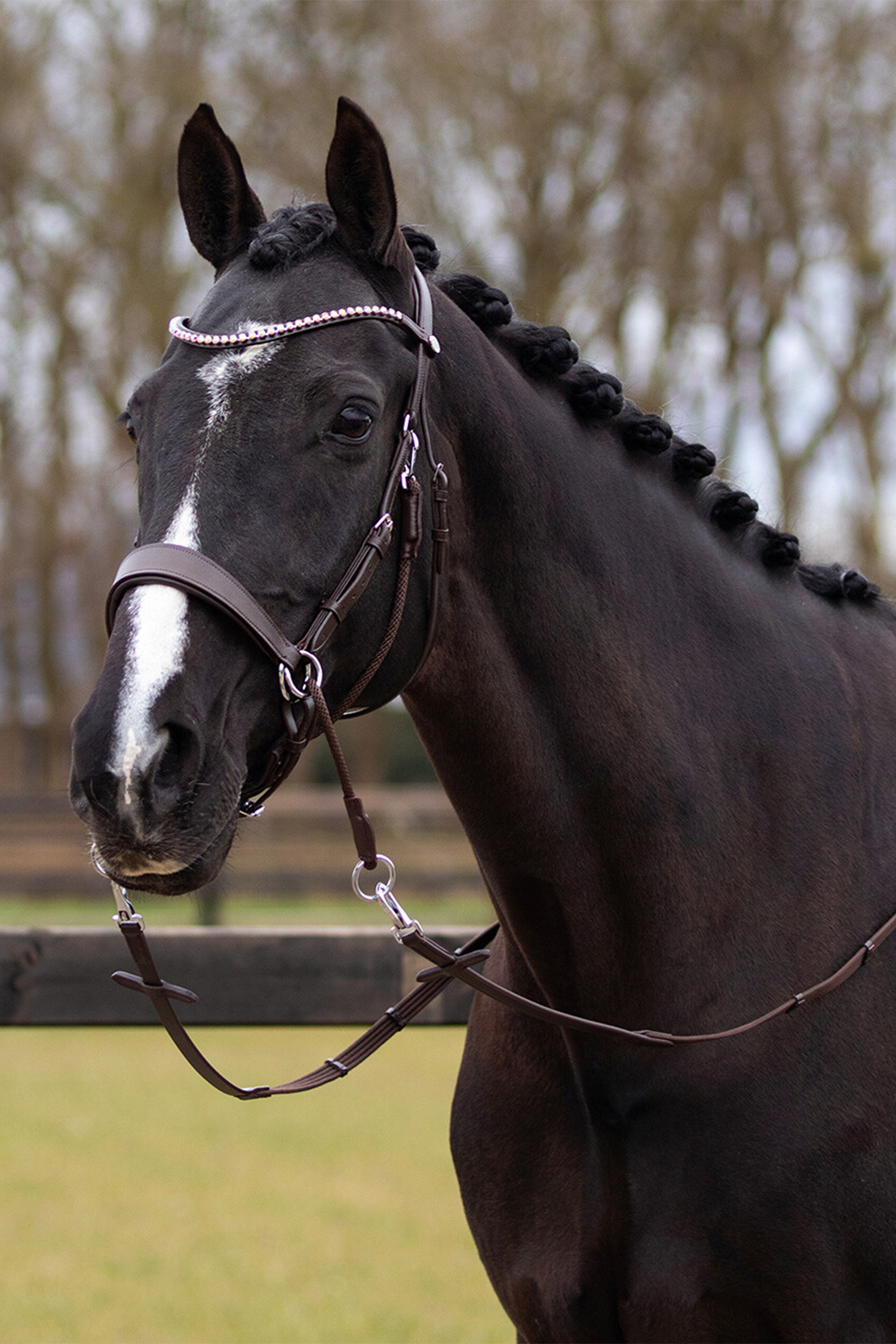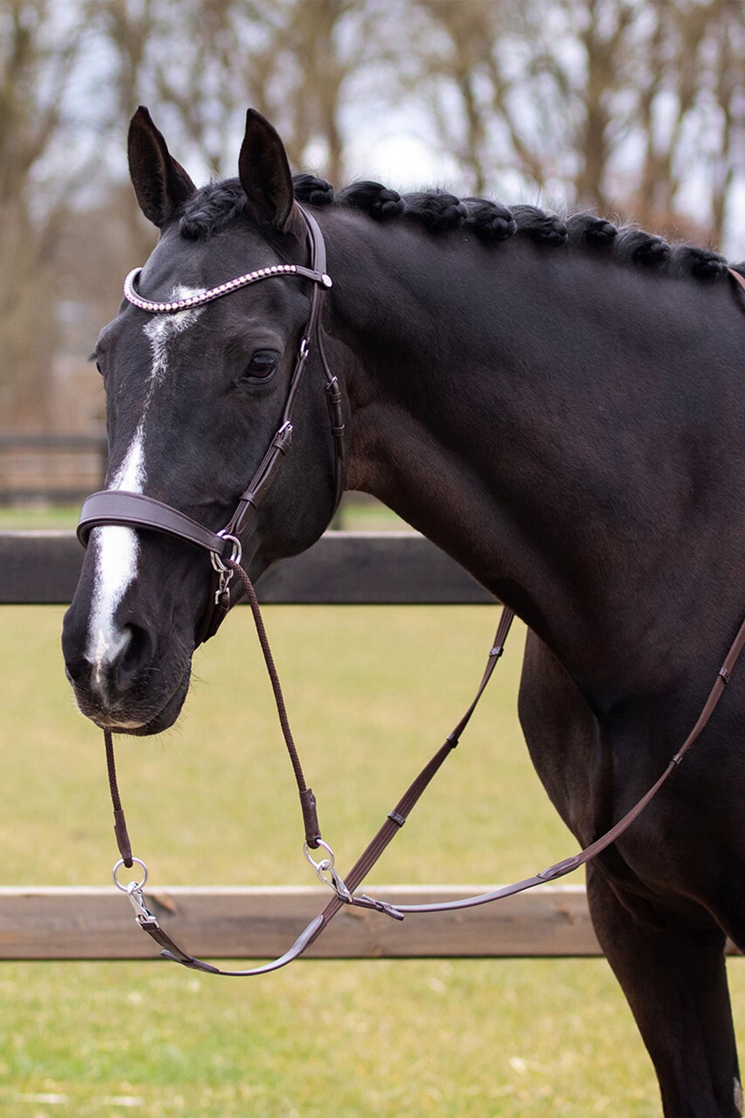Upptäck ett träns som kombinerar funktion, komfort och elegans – ett bettlöst träns i läder med ett stilfullt pannband dekorerat med gnistrande rhinestones i regnbågsskimrande färger. Perfekt för dig som vill rida bettlöst och samtidigt ha möjlighet att variera mellan olika alternativ.