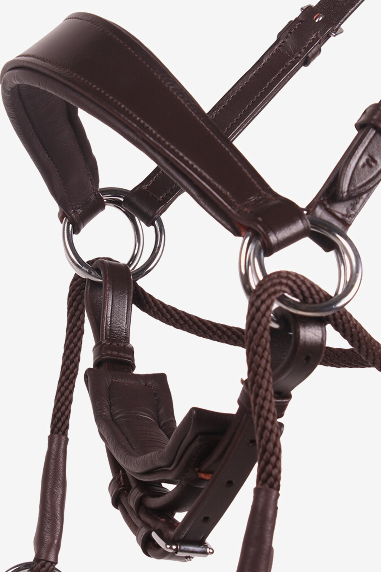 Detta träns kan användas som sidepull, chin crossed eller jaw crossed, vilket gör det till en mångsidig lösning både för ryttare som vill testa olika varianter och för den som behöver flexibilitet i sin ridning. De praktiska klämmorna på remmar och tyglar gör det enkelt att snabbt ställa om och anpassa efter behov.