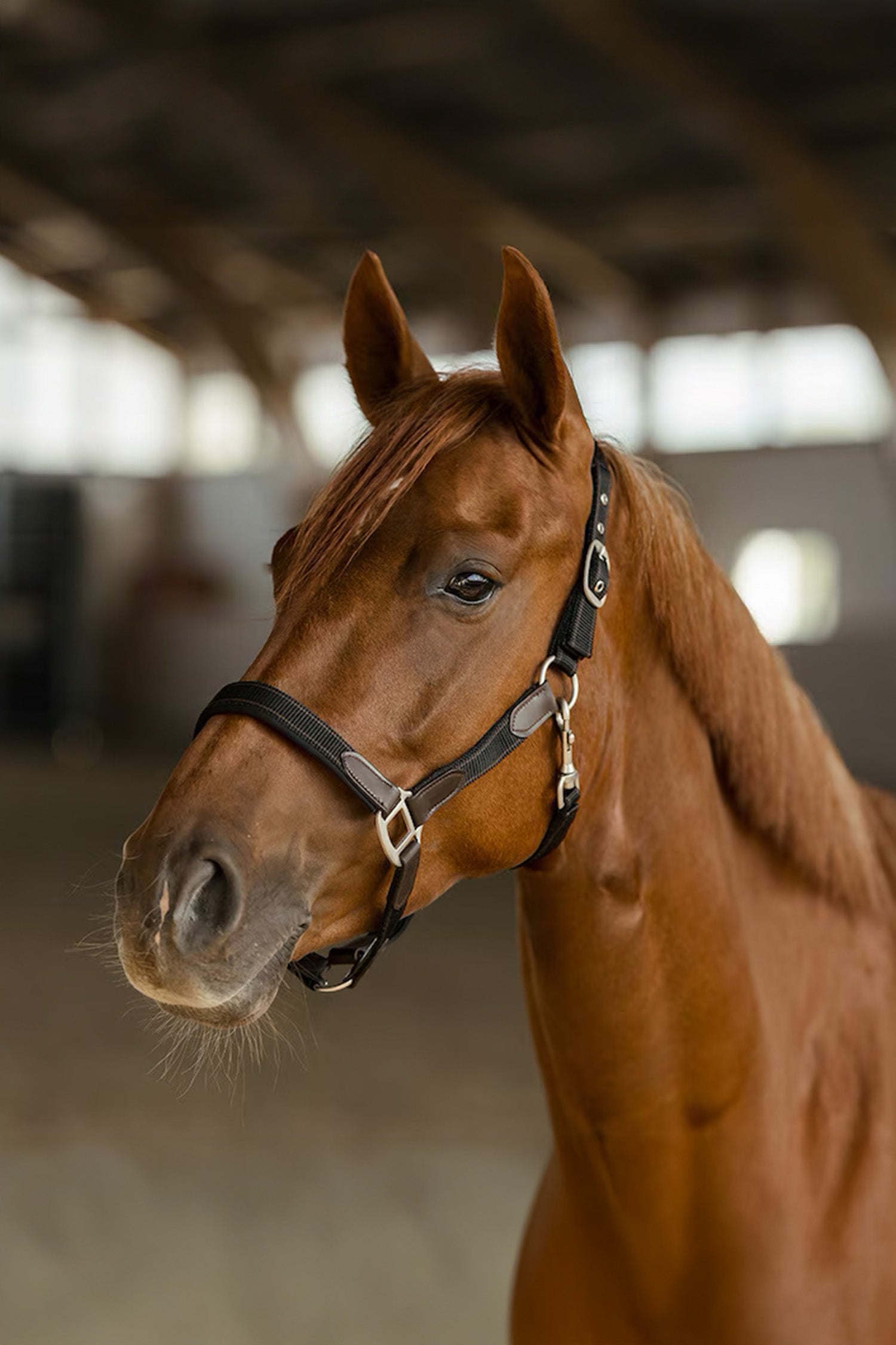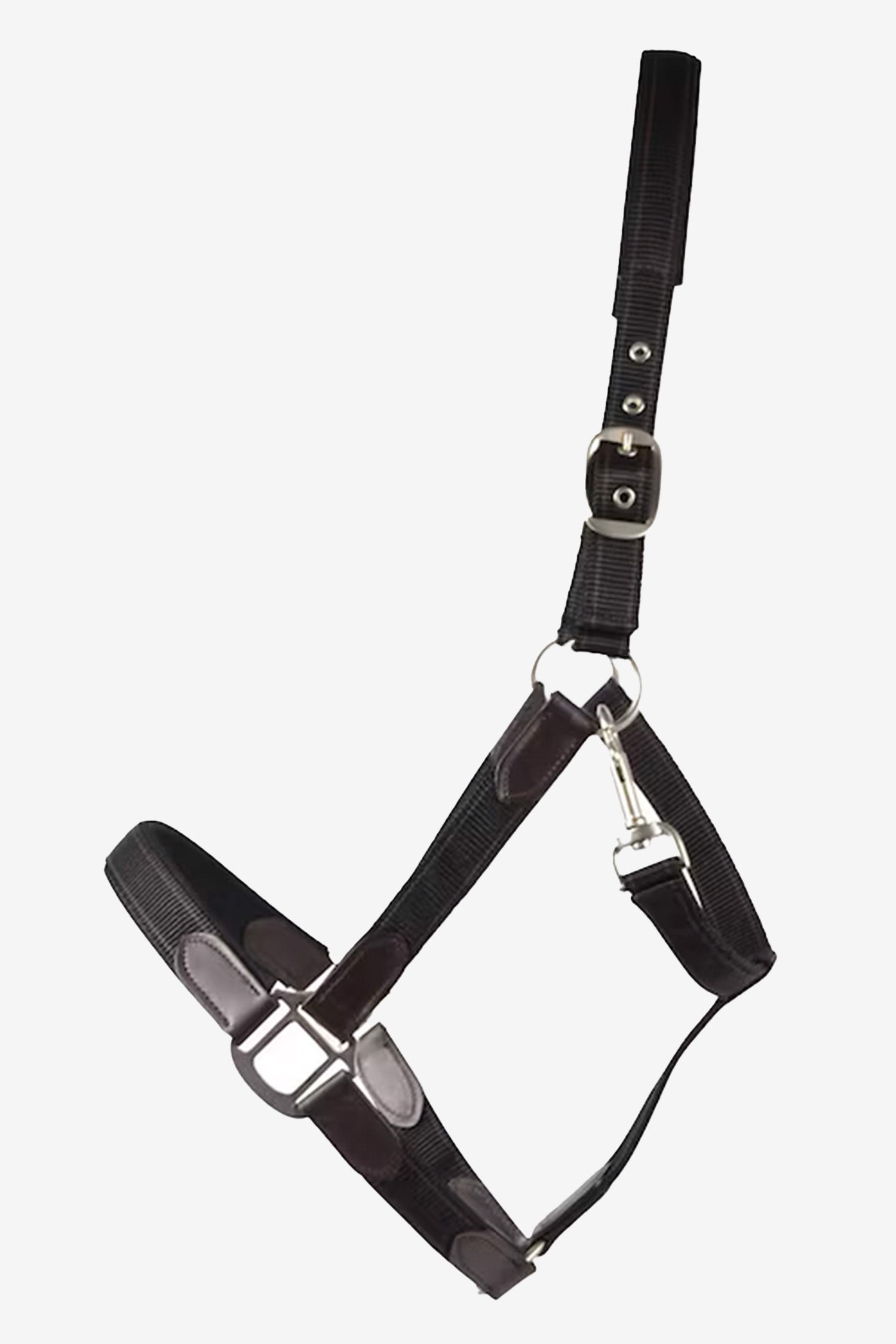 En snygg och bekväm grimma för vardag och tävling. Den är tillverkad i mjukt, slitstarkt nylon med vadderad nos- och nackrem för att minimera tryck och skav.