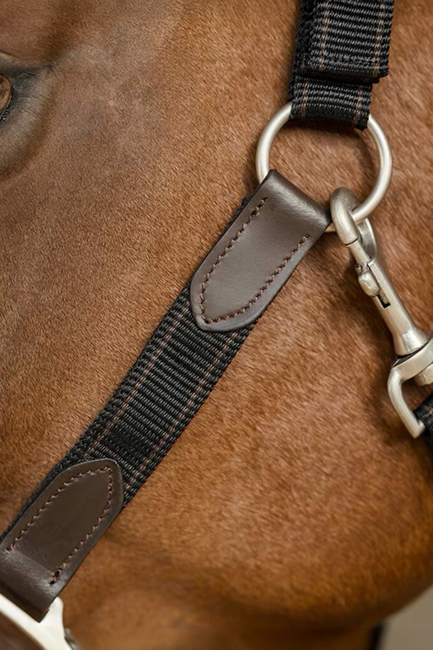 Grimman har justerbar passform på både nack- och nosrem samt kraftiga metallspännen som ger säker och stabil användning. Den snygga designen gör att grimman passar lika bra i stallet som på tävlingsplatsen.