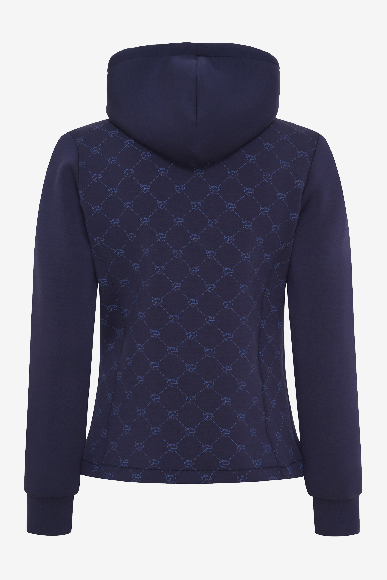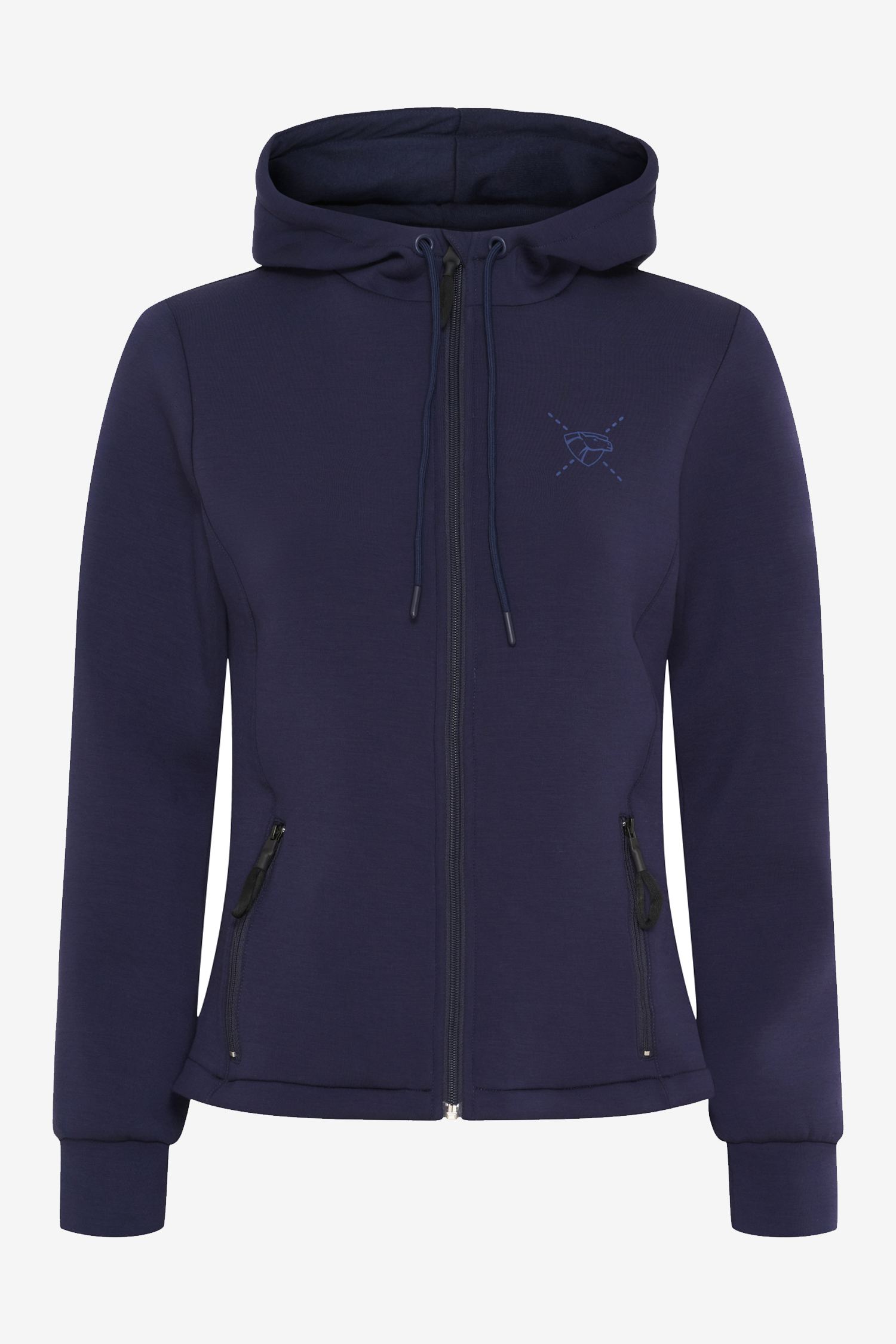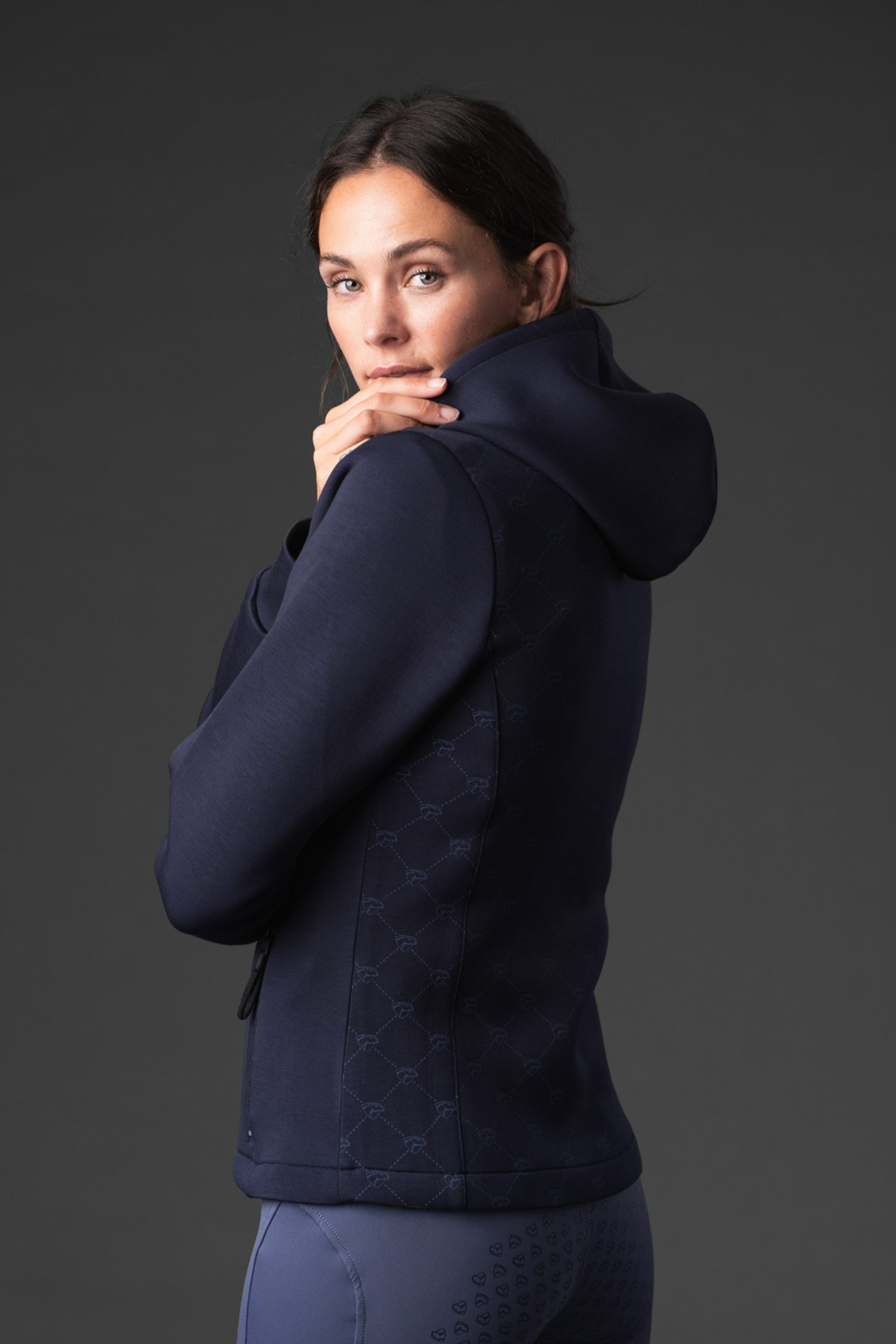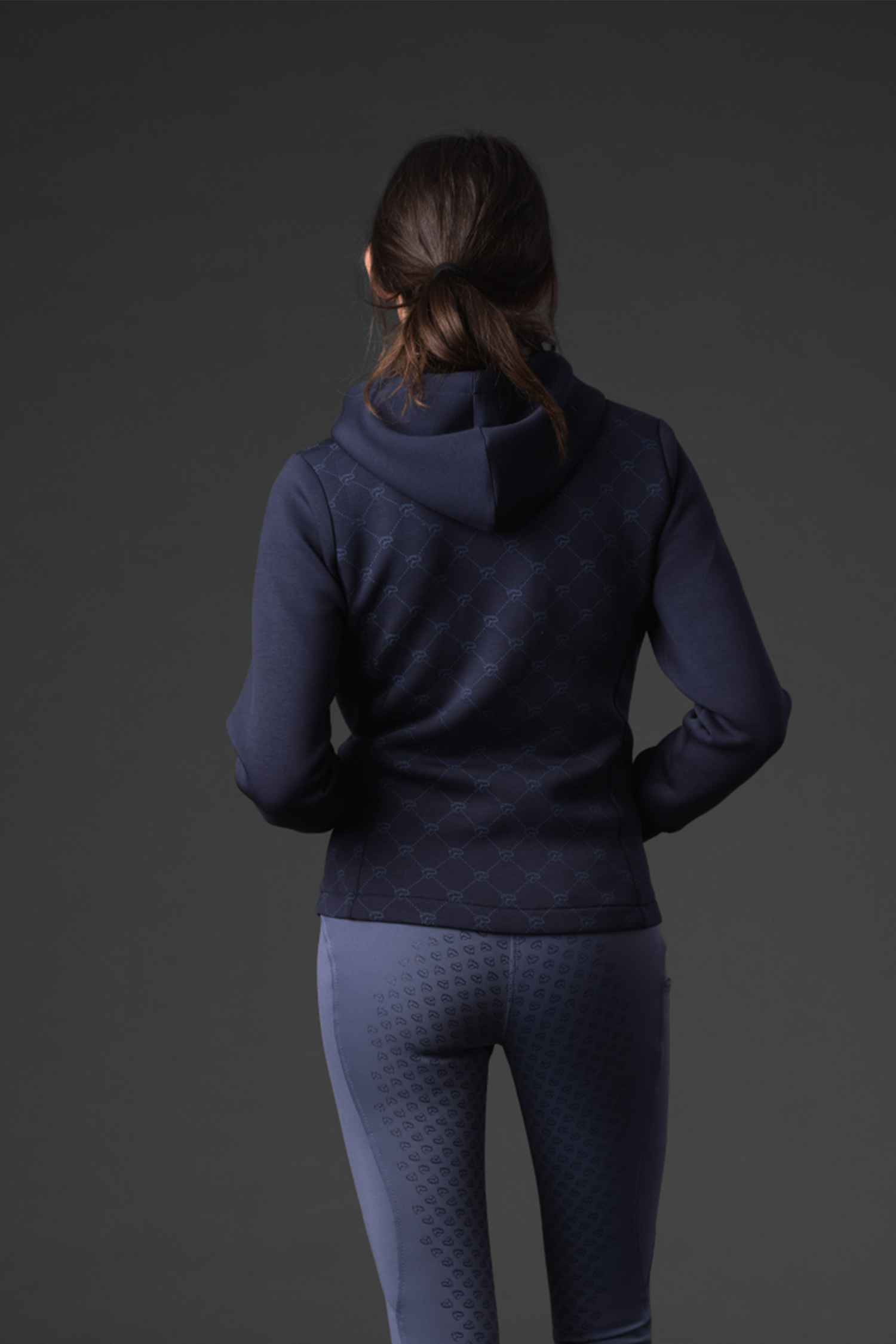 Färgvalet navy – den variant som finns dokumenterad – gör att hoodien passar smidigt ihop med andra ridkläder eller fritidskläder.