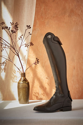 Ett par dressyrstövlar ska sitta stadigt och nära benet, utan att klämma. Eftersom de ofta är något stelare än hoppstövlar, formar de sig gradvis efter ryttarens ben med användning. Rätt passform är avgörande för att få stöd utan att förlora rörlighet, och därför erbjuder vi modeller i flera skaftbredder, höjder och storlekar – för en skräddarsydd känsla.