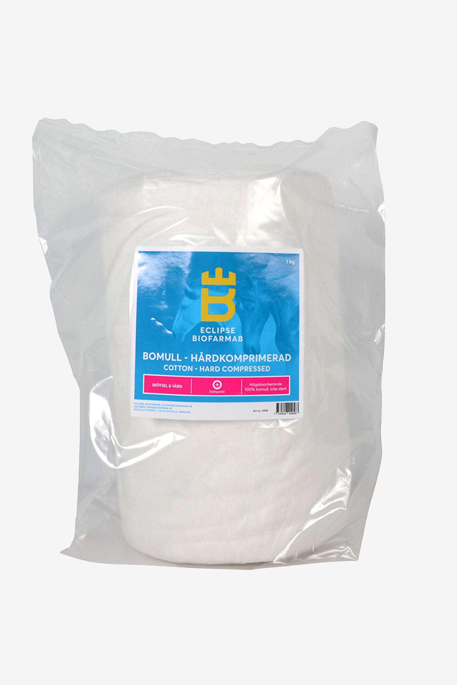 Högabsorberande 100% bomull, icke steril. Genomsnittlig fiberlängd 20 mm. Absorbtionskapacitet 23 g vatten/g bomull.