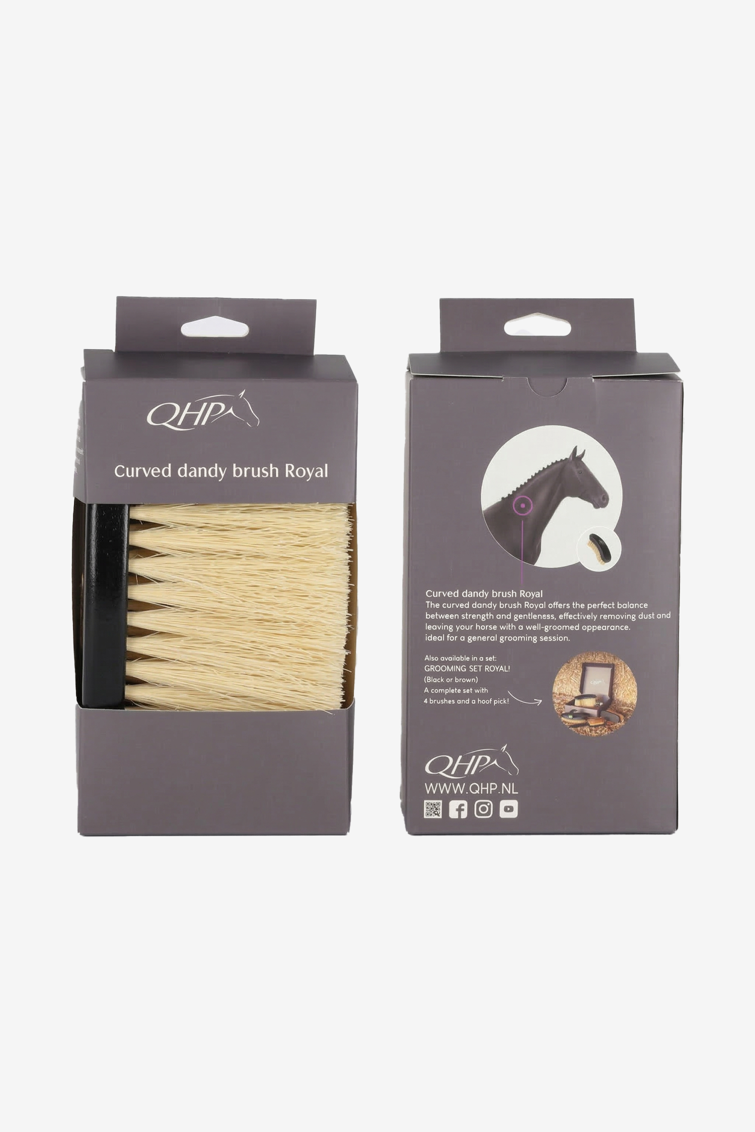 Borste Royal hård är en kraftigare borste som effektivt avlägsnar smuts, lera och intorkad jord från hästens päls. De fasta tampicofibrerna ger en grundlig rengöring och gör borsten särskilt lämplig när hästen är smutsig efter hage eller träning.