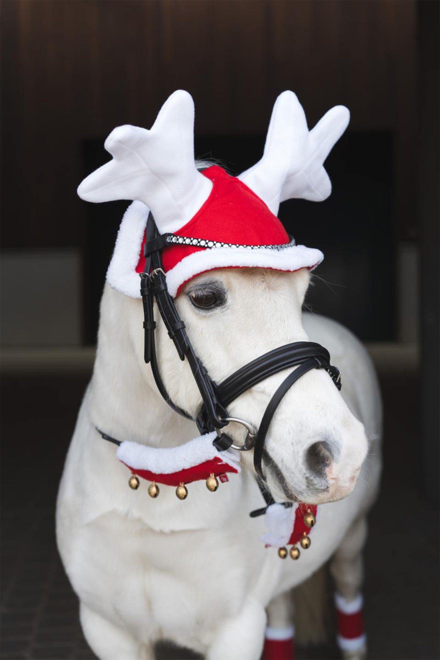Gör stallet redo för decembermys! Den här julutstyrseln förvandlar din häst till en söt ren på sekunder. Mjuk fleece i klassisk röd/vit design med två stadiga, vadderade renhorn i vitt. Bekväm, lätt och skonsam mot pälsen – perfekt för luciatåg, julfotografering och ponnyridning på gårdens julmarknad.