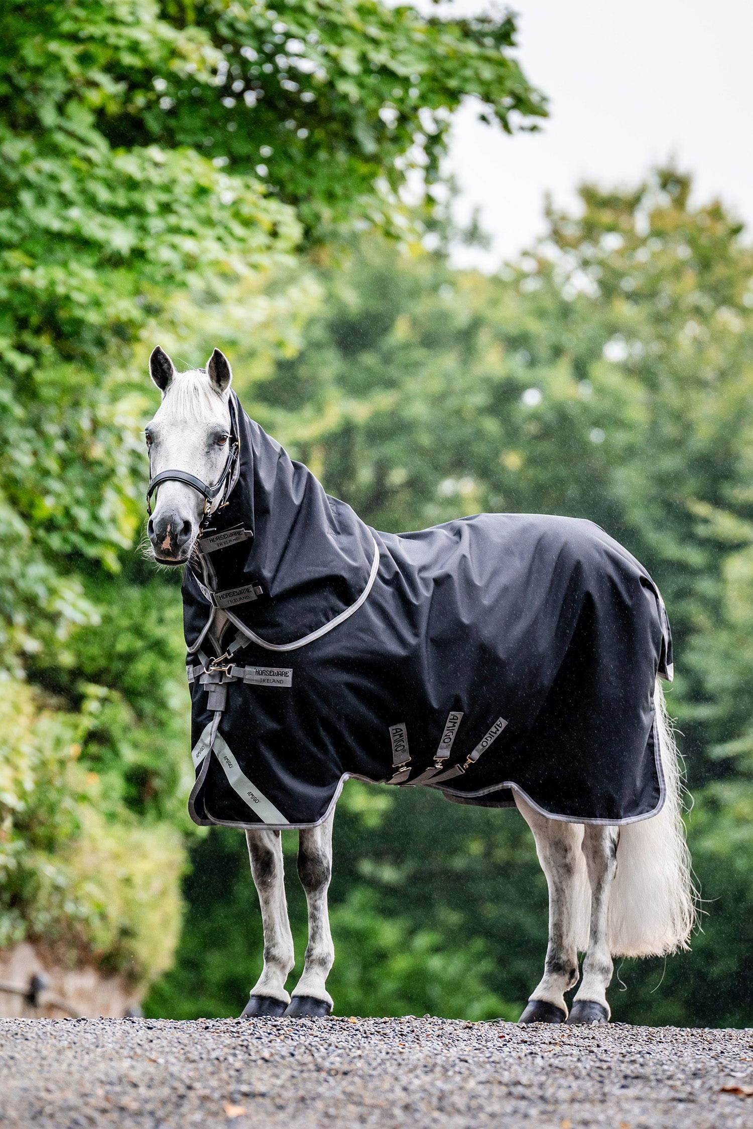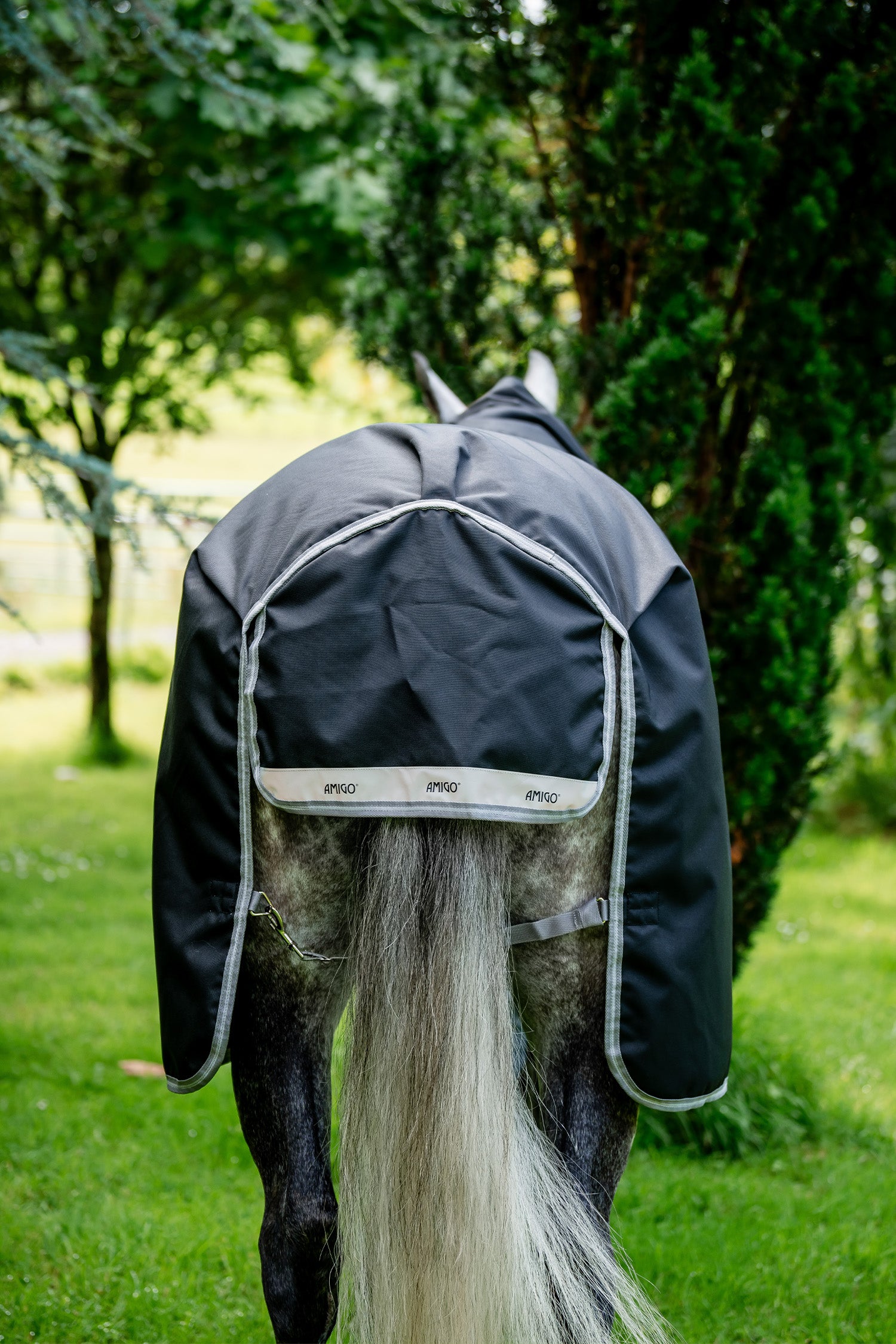 Horseware Amigo 1200D Plus 100g i färgen Svart/Titan Grey Silver är ett slitstarkt och pålitligt utetäcke som kombinerar funktion, komfort och stil. Tillverkat i ett kraftigt, vattentätt och andningsbart 1200 denier polyester-material som skyddar hästen mot vind och väta, samtidigt som det håller en jämn temperatur.