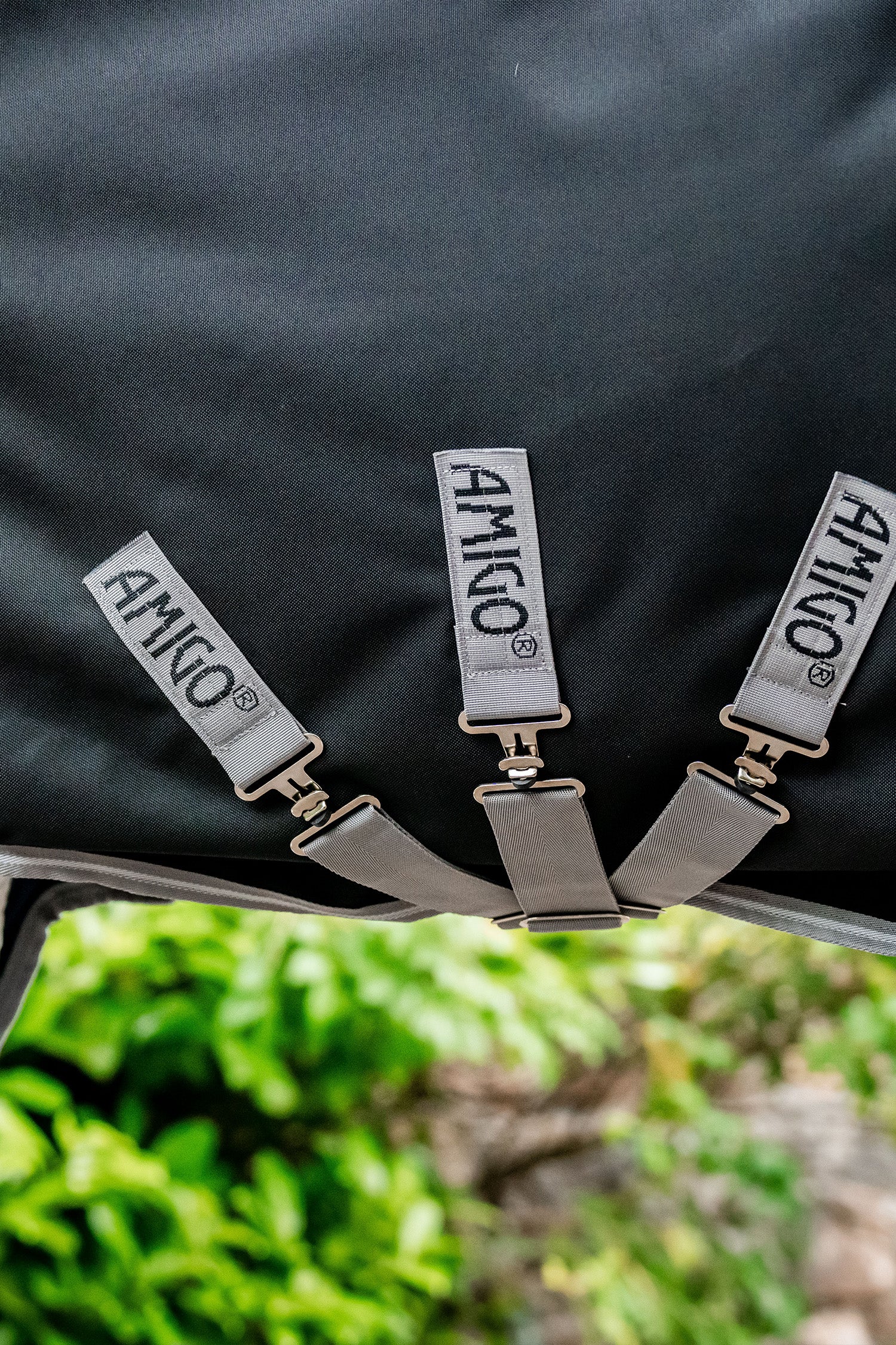 Amigo 1200D Plus är designat med säkra, justerbara knäppen fram, kryssgjordar under magen och svanssnöre för att täcket ska sitta stadigt på plats även under lek i hagen.