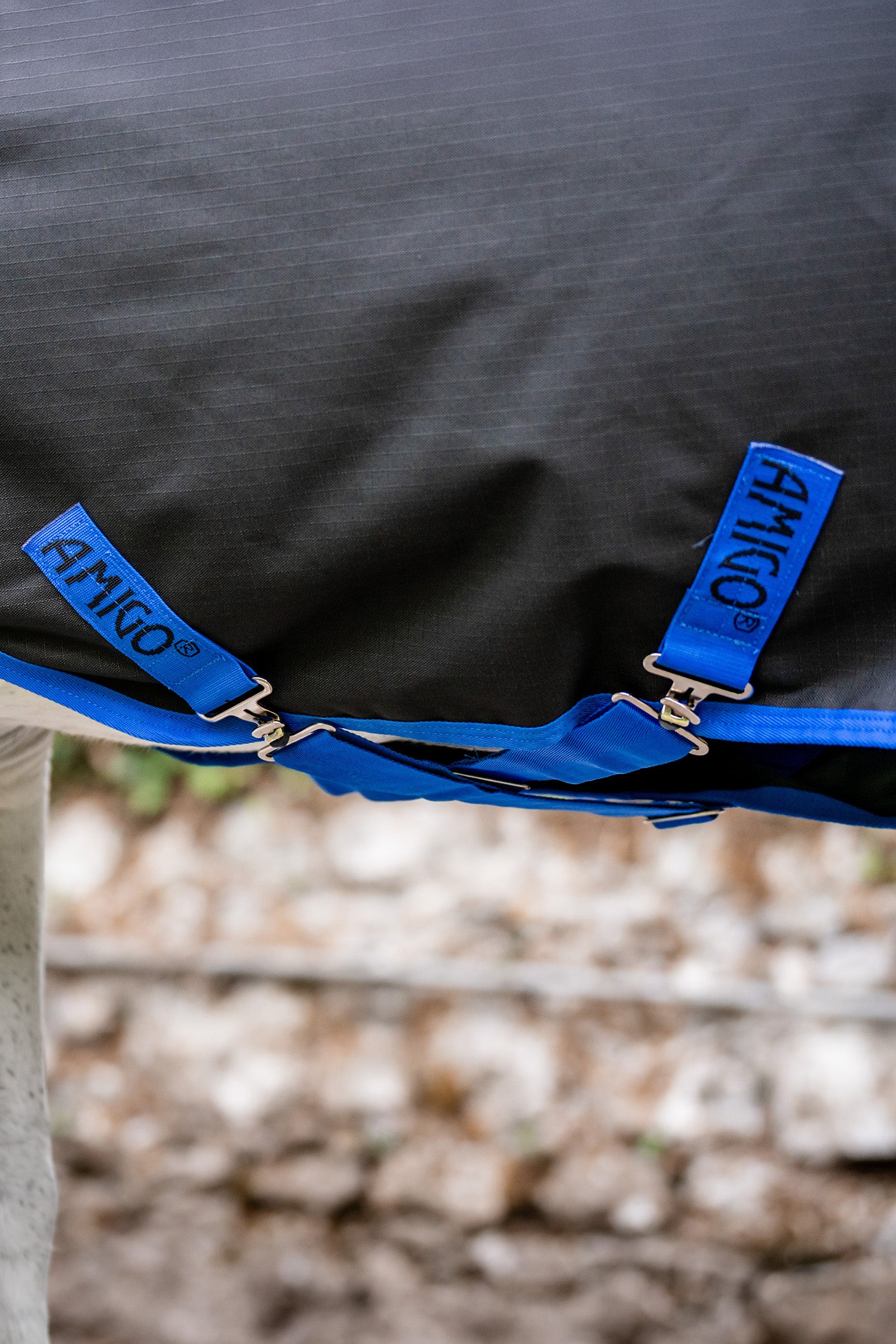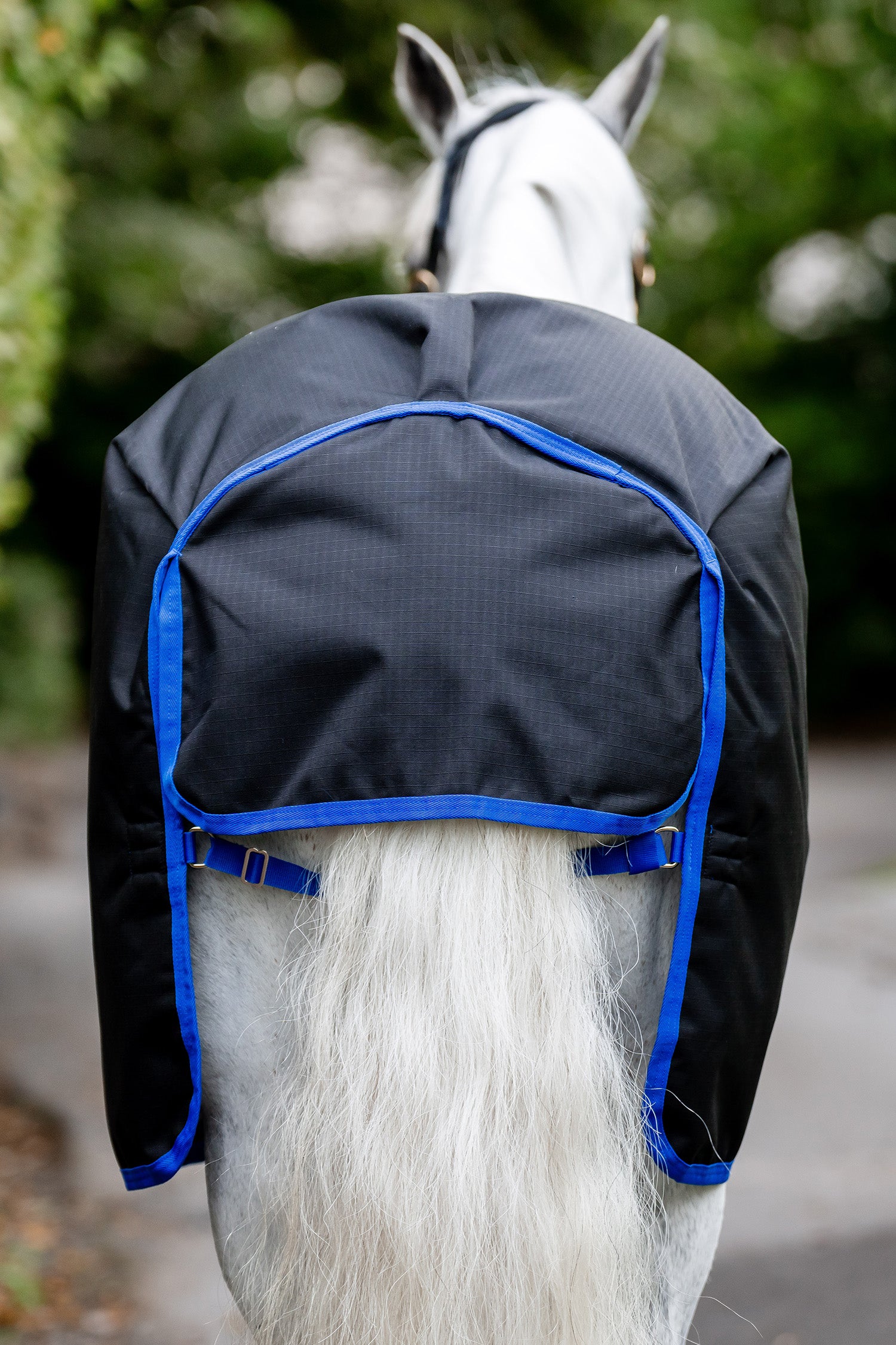 Det avtagbara halstäcket ger extra flexibilitet och skydd under kalla och blåsiga dagar, medan den 100 grams fyllningen ger lätt värme utan att täcket blir tungt. Fodrat med blankt innerfoder som motverkar skav och håller hästens päls glansig. De kontrasterande blå detaljerna ger ett stilrent, sportigt utseende.