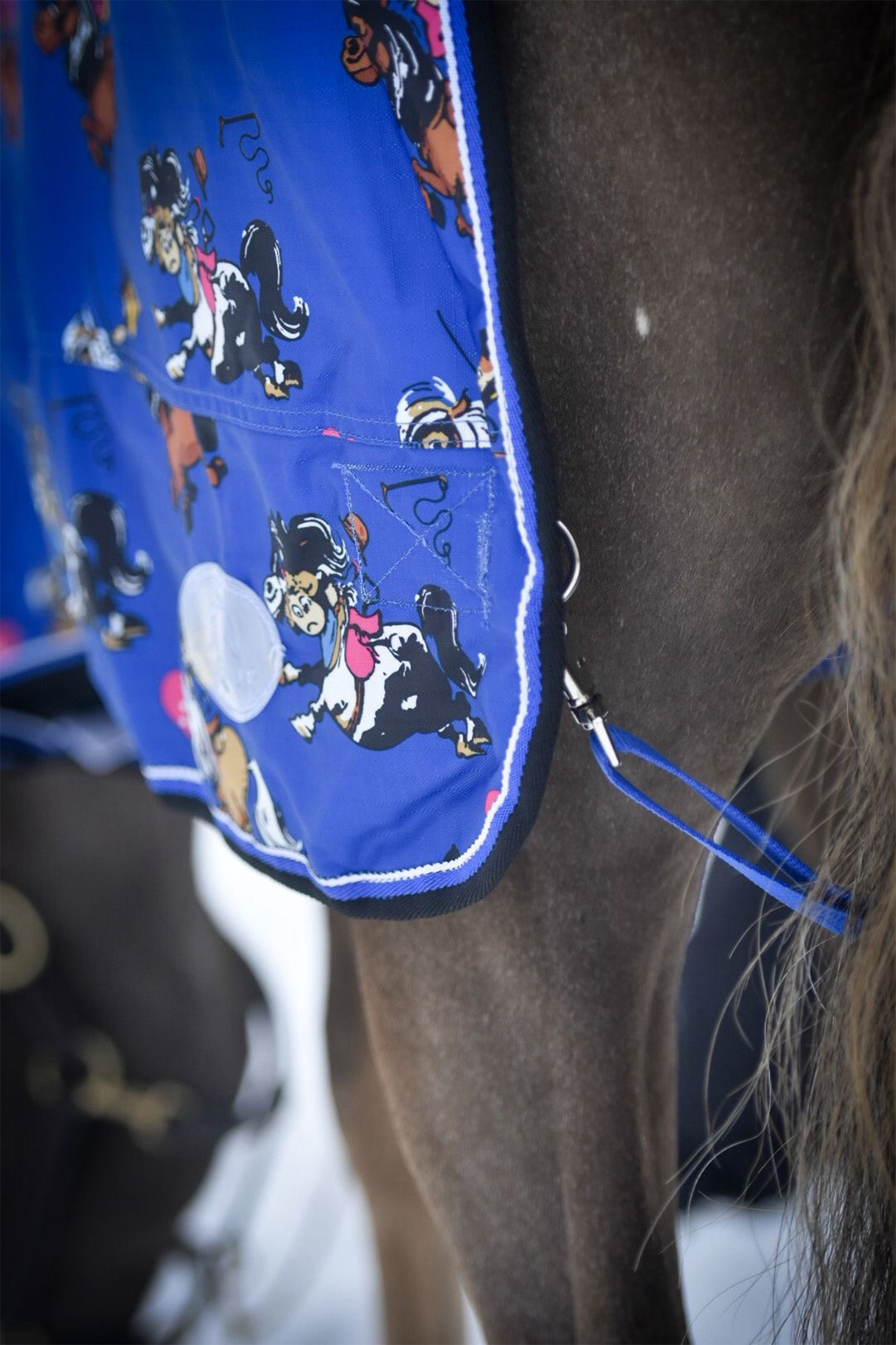 Täcket är ett blått ponnytäcke med lekfullt mönster, designat för att ge både komfort och rörelsefrihet. Den lätta 50 g fyllningen ger lagom isolering samtidigt som täcket fungerar utmärkt som skydd mot väder och vind vid utevistelse.