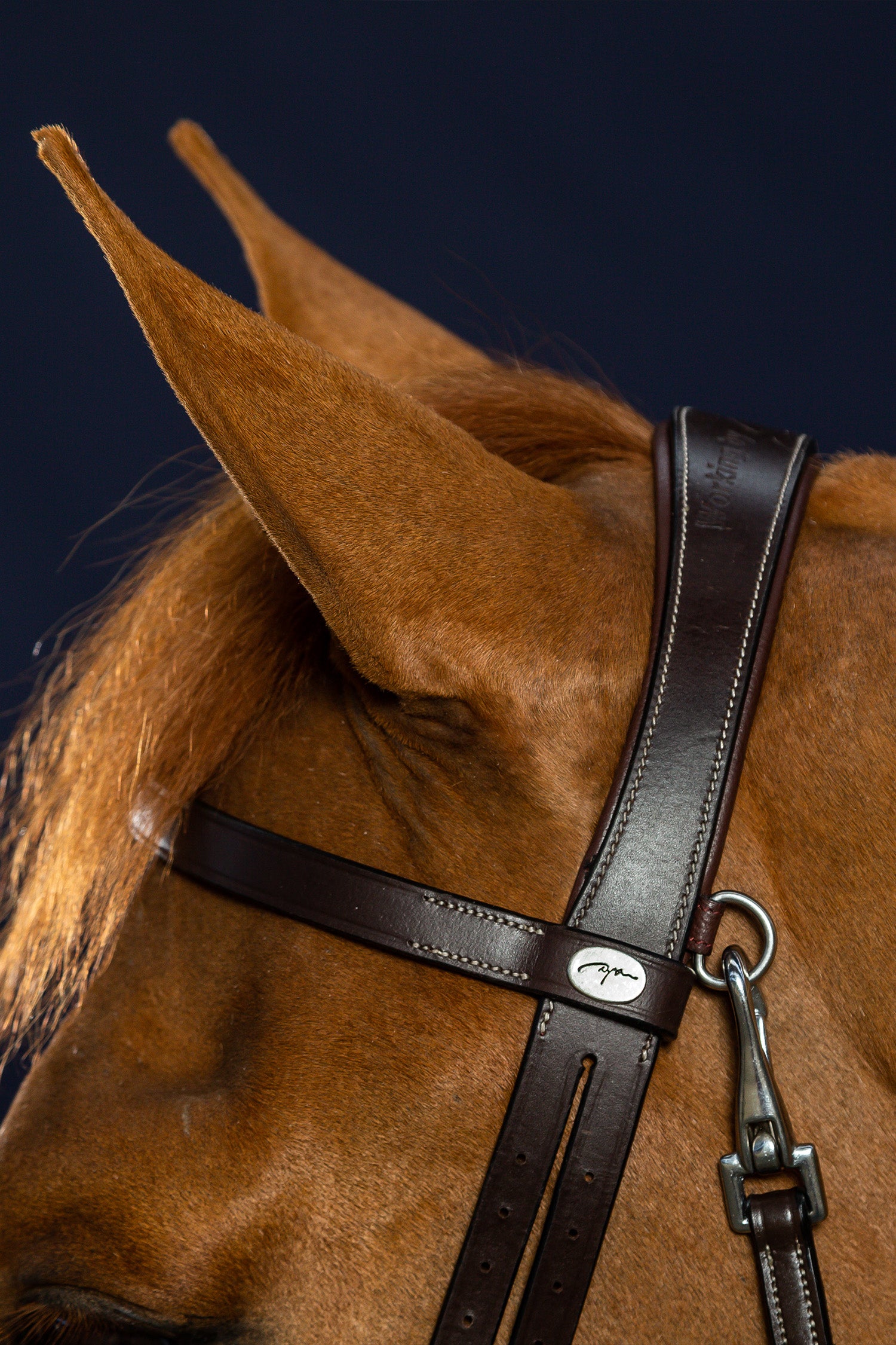 Den platta läderdesignen ger ett rent och minimalistiskt utseende, samtidigt som det ligger bekvämt mot hästens ansikte och minskar risken för tryckpunkter. Kombinationen av enkelhet, hållbarhet och komfort gör tränset till ett pålitligt val för både hemmaträning och lätta tävlingspass.