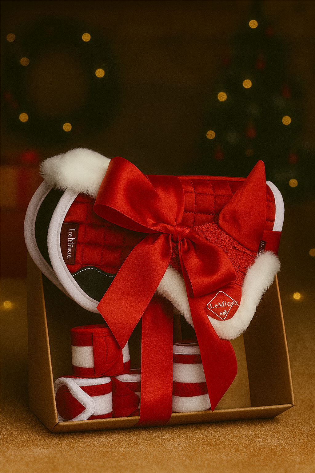 Setet är komplett och innehåller fyra rödvita bandage till benen, en julinspirerad rödvit huva samt en matchande rödvit schabrakpad för Toy Pony-sadeln. Tillsammans skapar de en enhetlig och stämningsfull look som gör din Toy Pony till julens självklara stjärna.