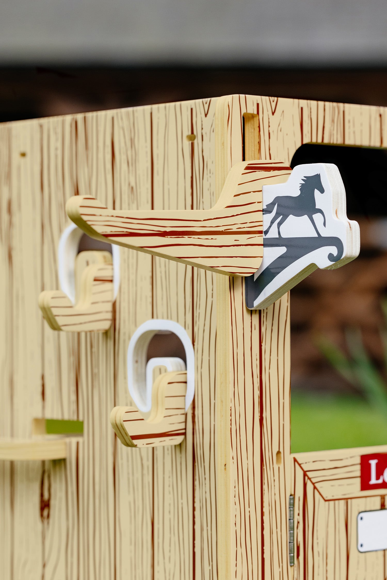 Stallet är fullt av funktionella detaljer, som en öppningsbar dörr med fungerande lås, gummigolv, avtagbar sadelhängare, tränskrokar och en täckeshängare. Allt är skapat för att efterlikna den riktiga stallvardagen.