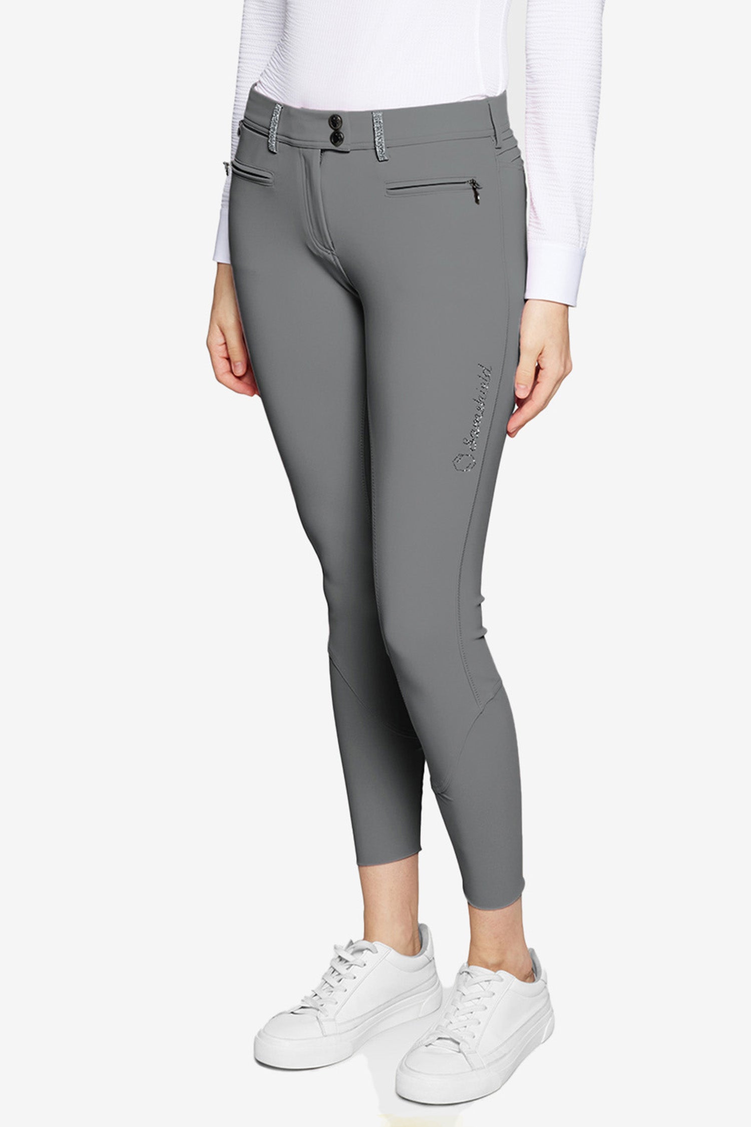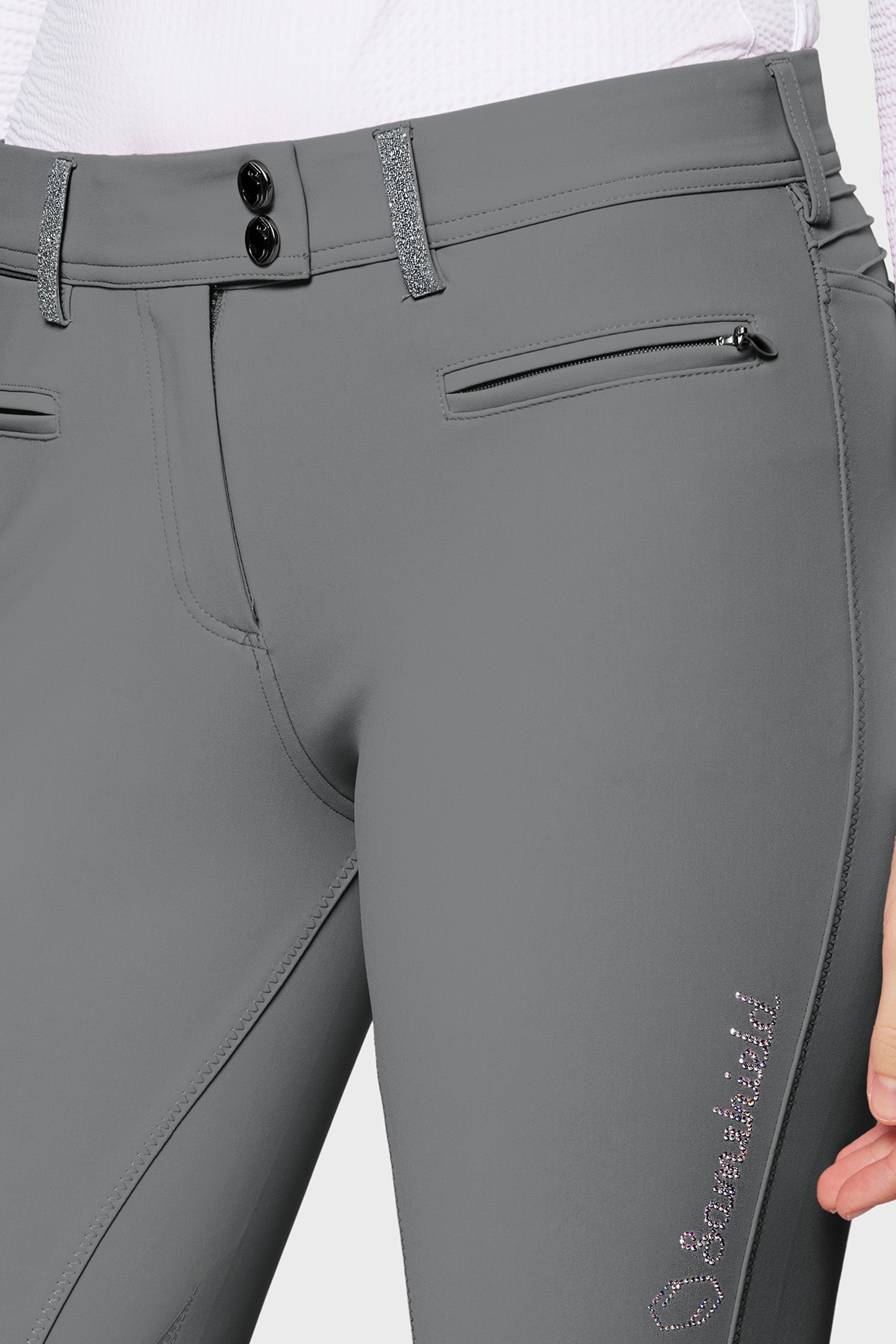 På insidan av linningen i midjan finns en silikontejp som förhindrar att tröjan/skjortan åker upp. Knäskoning med silikongrepp ger ett väldigt bra fäste i sadeln. På vänstra låret finns en elegant Samshield logga av Swarovski kristaller och bakfickorna är prydda med Crystal Fabric Swarovski som knyter ihop hela paketet.