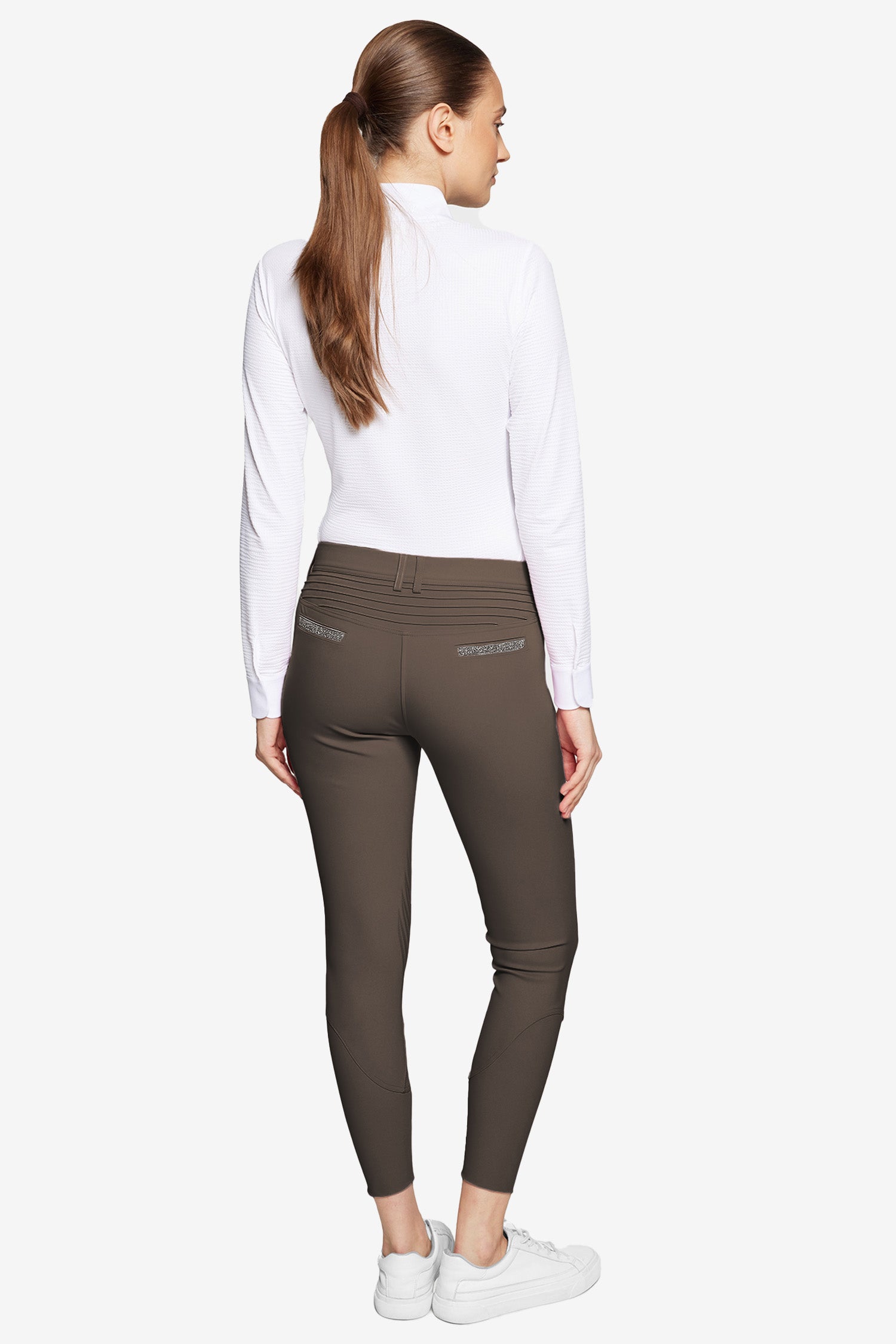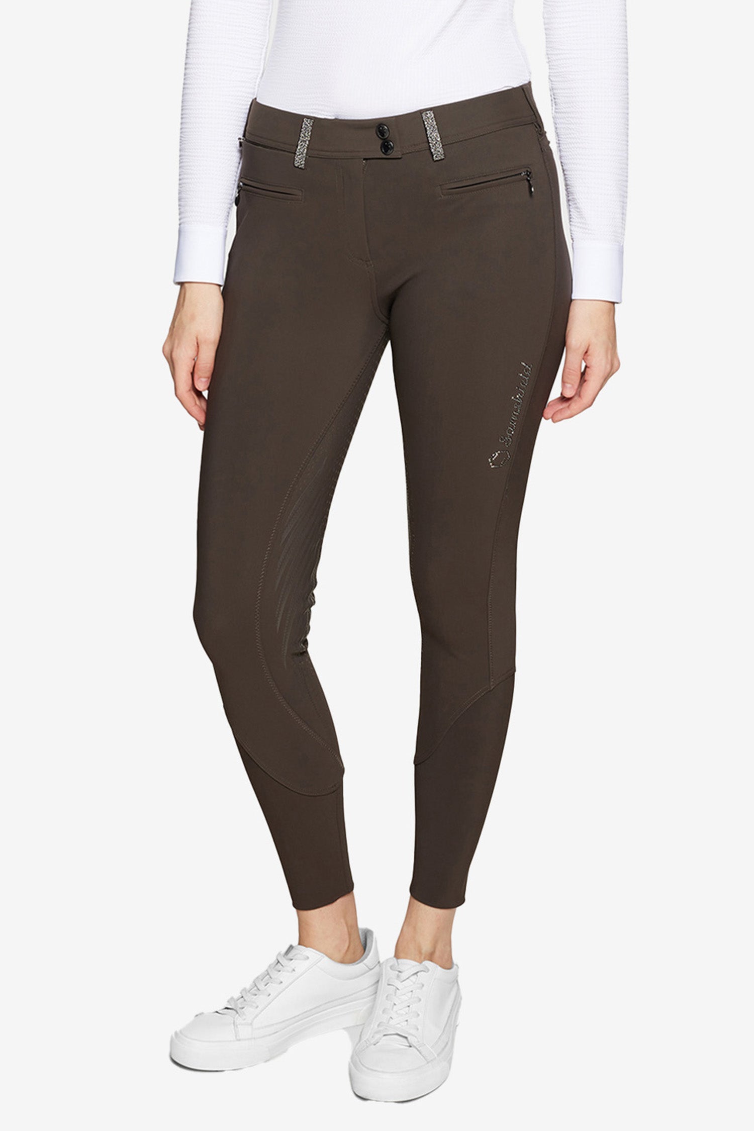 På insidan av linningen i midjan finns en silikontejp som förhindrar att tröjan/skjortan åker upp. Knäskoning med silikongrepp ger ett väldigt bra fäste i sadeln. På vänstra låret finns en elegant Samshield logga av Swarovski kristaller och bakfickorna är prydda med Crystal Fabric Swarovski som knyter ihop hela paketet.