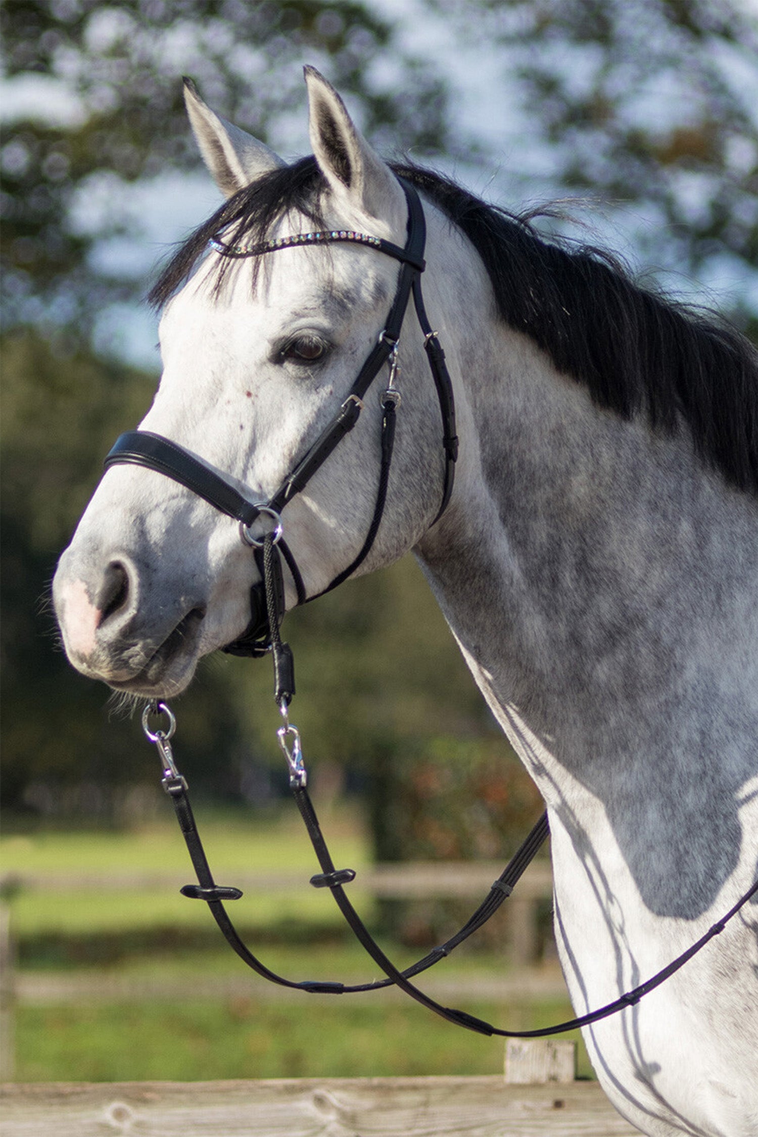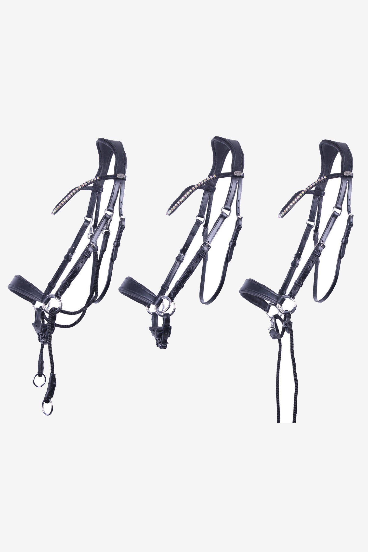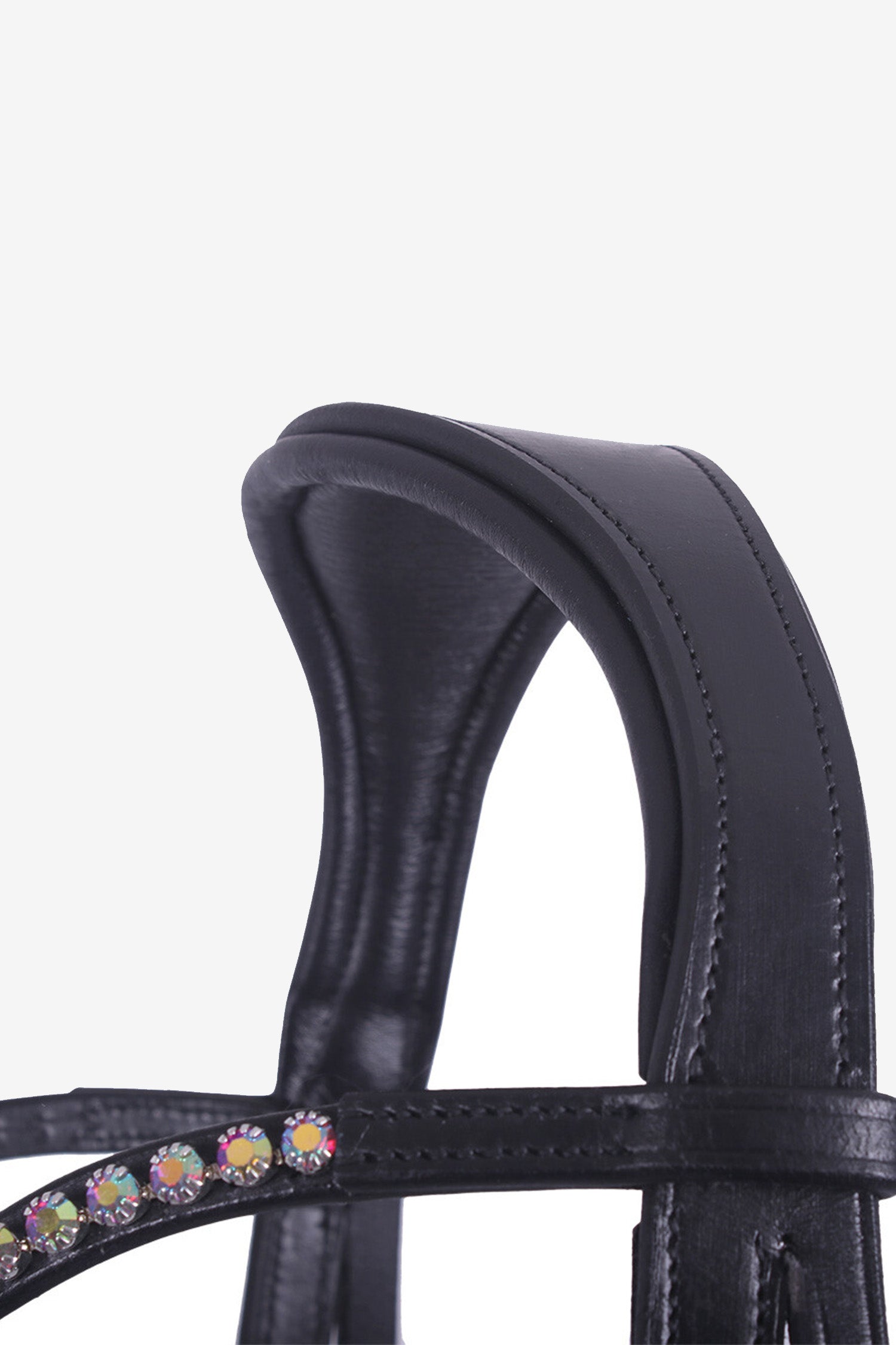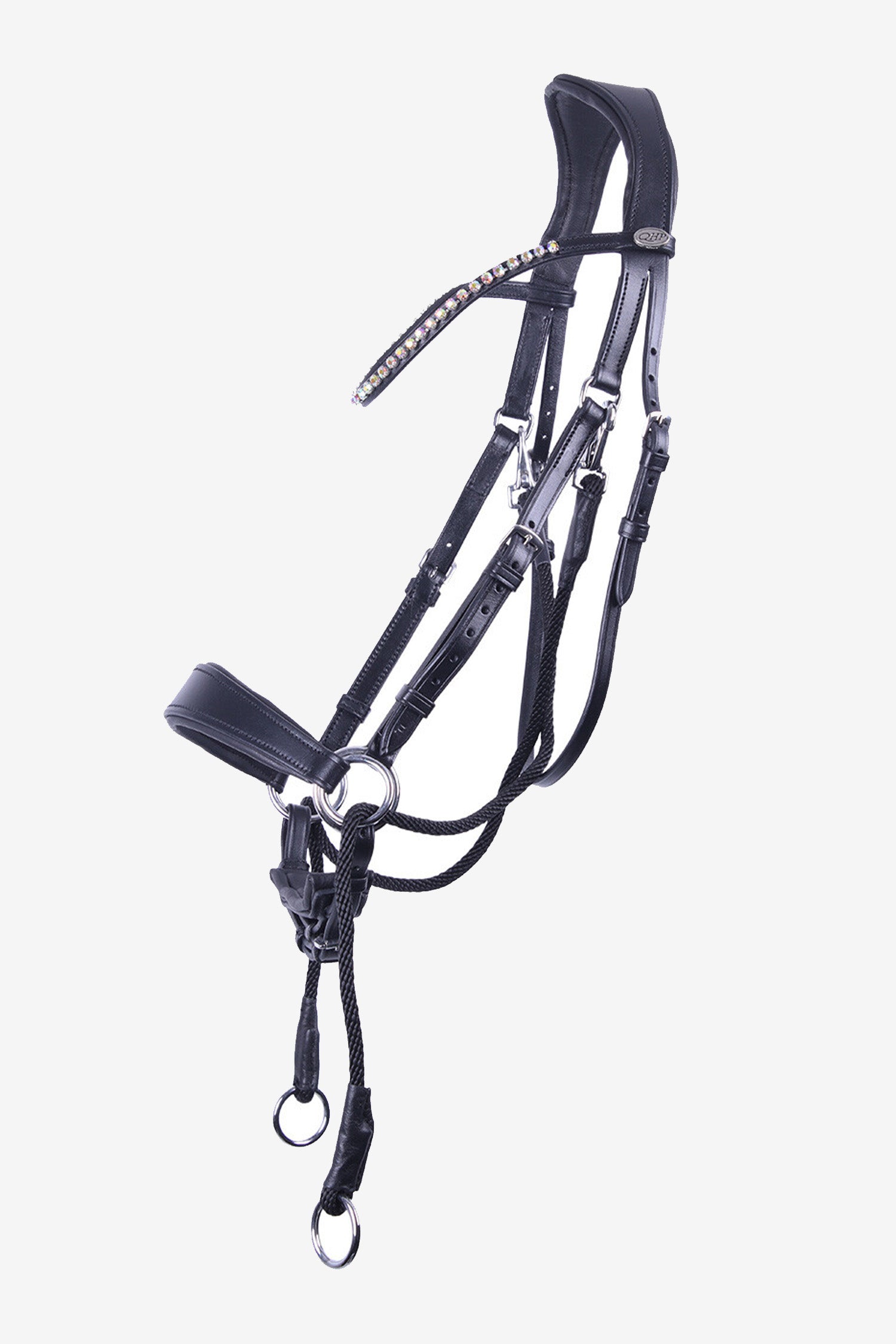 Upptäck ett träns som kombinerar funktion, komfort och elegans – ett bettlöst träns i läder med ett stilfullt pannband dekorerat med gnistrande rhinestones i regnbågsskimrande färger. Perfekt för dig som vill rida bettlöst och samtidigt ha möjlighet att variera mellan olika alternativ.