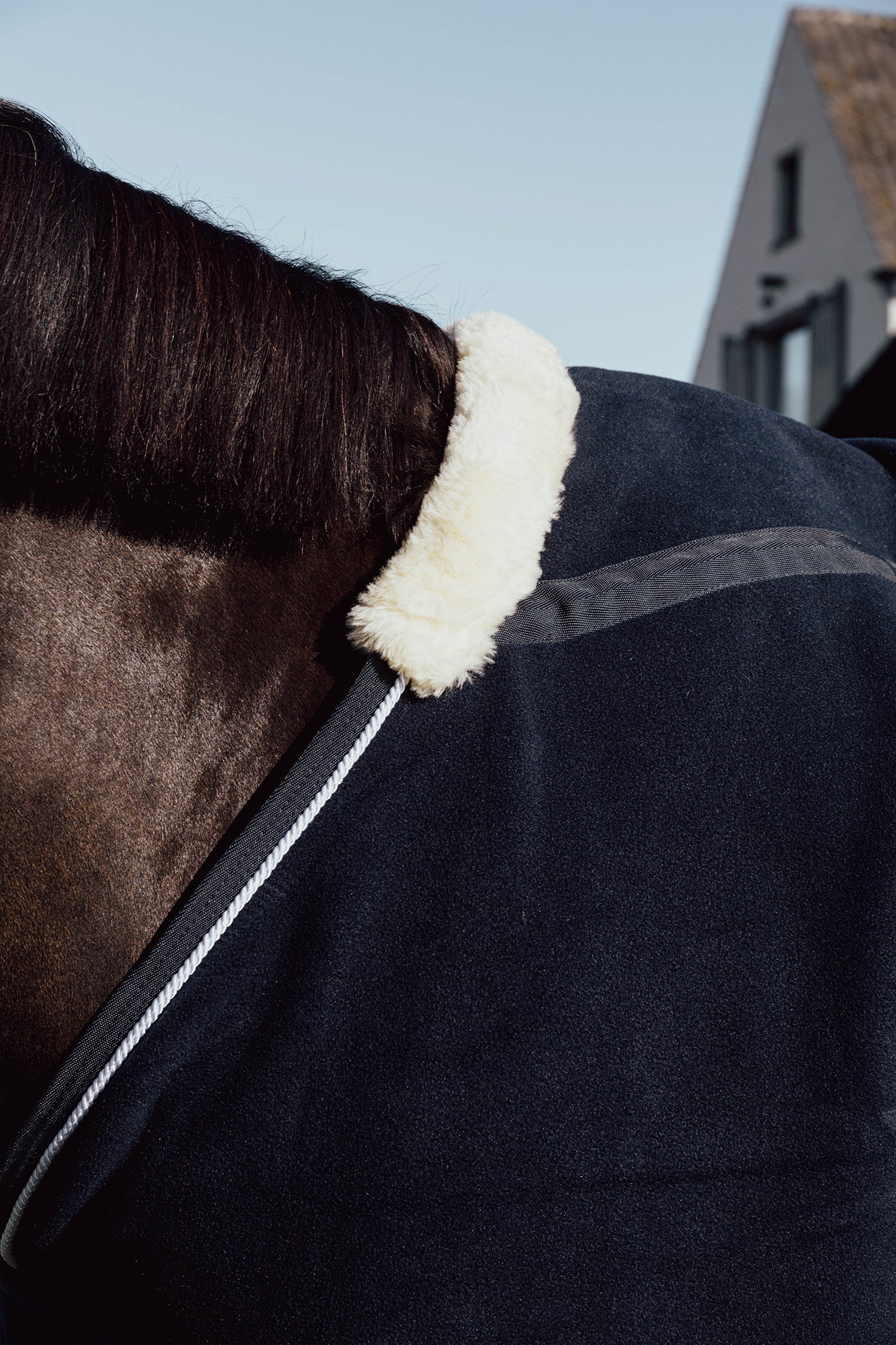 För extra komfort har täcket sheepskin-detalj vid manken och ingen söm längs kragen, vilket eliminerar tryckpunkter och ökar hästens välbefinnande. Till skillnad från ull fastnar inte spån lika lätt i materialet, och dessutom är täcket maskintvättbart – en kombination av lyx och praktisk användning.