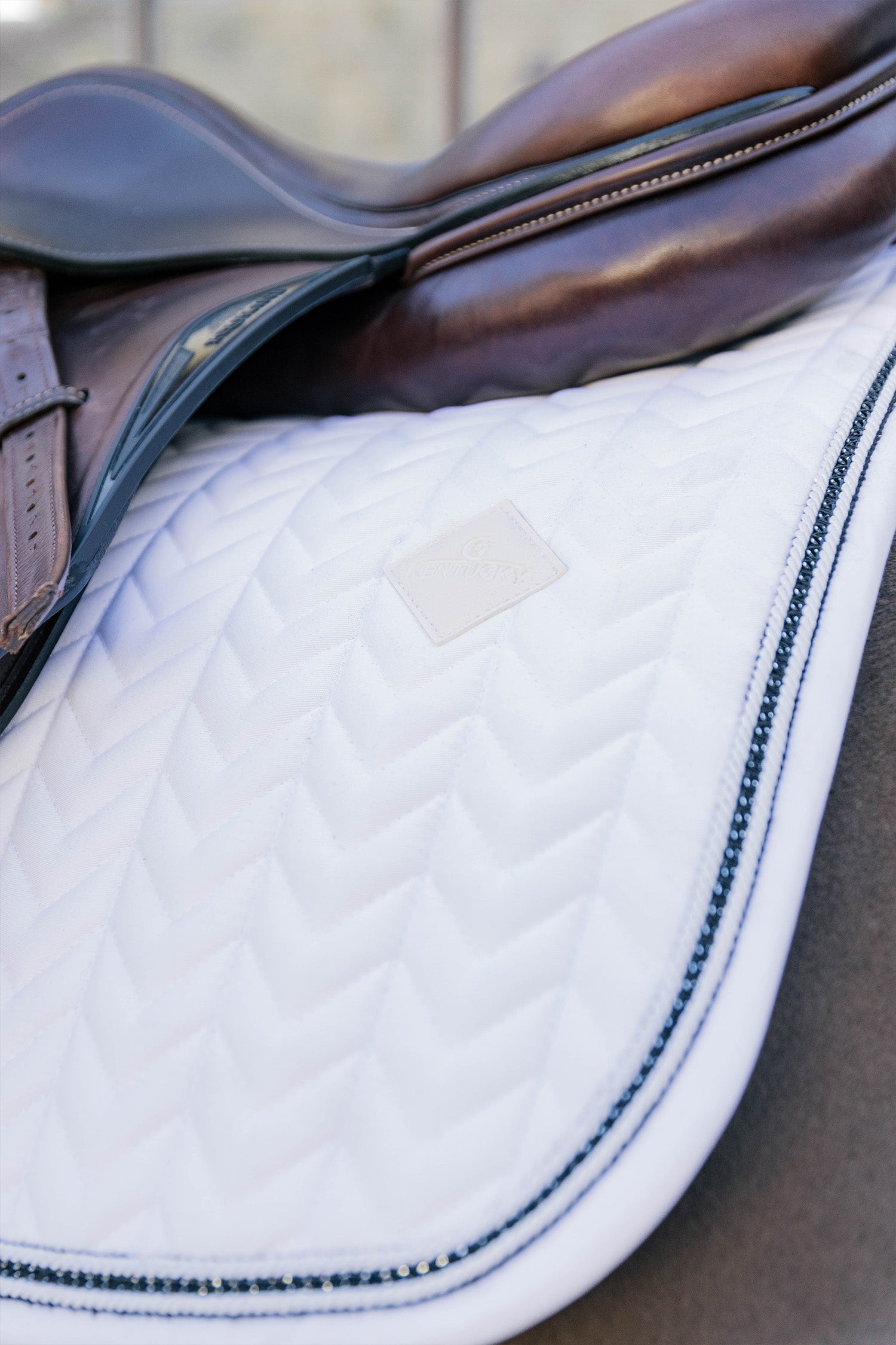 Schabraket har en mjuk vaddering i fishbone-mönster som ger optimal stötdämpning mellan sadel och häst. Materialet är mycket andningsbart och fuktabsorberande, vilket håller hästens rygg torr och bekväm även under längre ridpass.