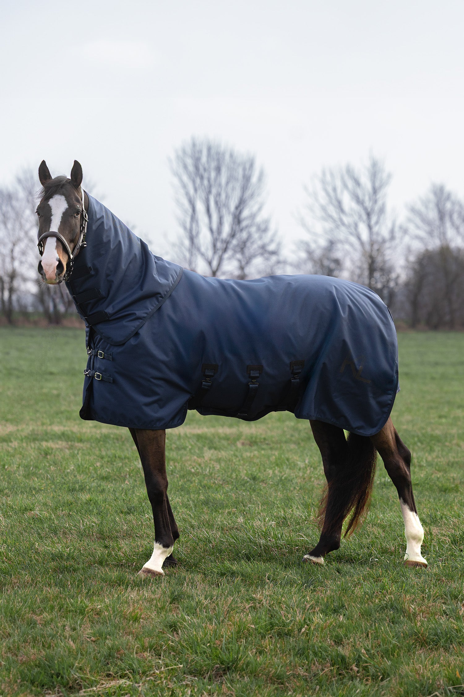 Täcket har en elegant navyblå design med klassiska Kingsland-detaljer, vilket gör det lika snyggt som praktiskt – perfekt både i stallet och under transport.