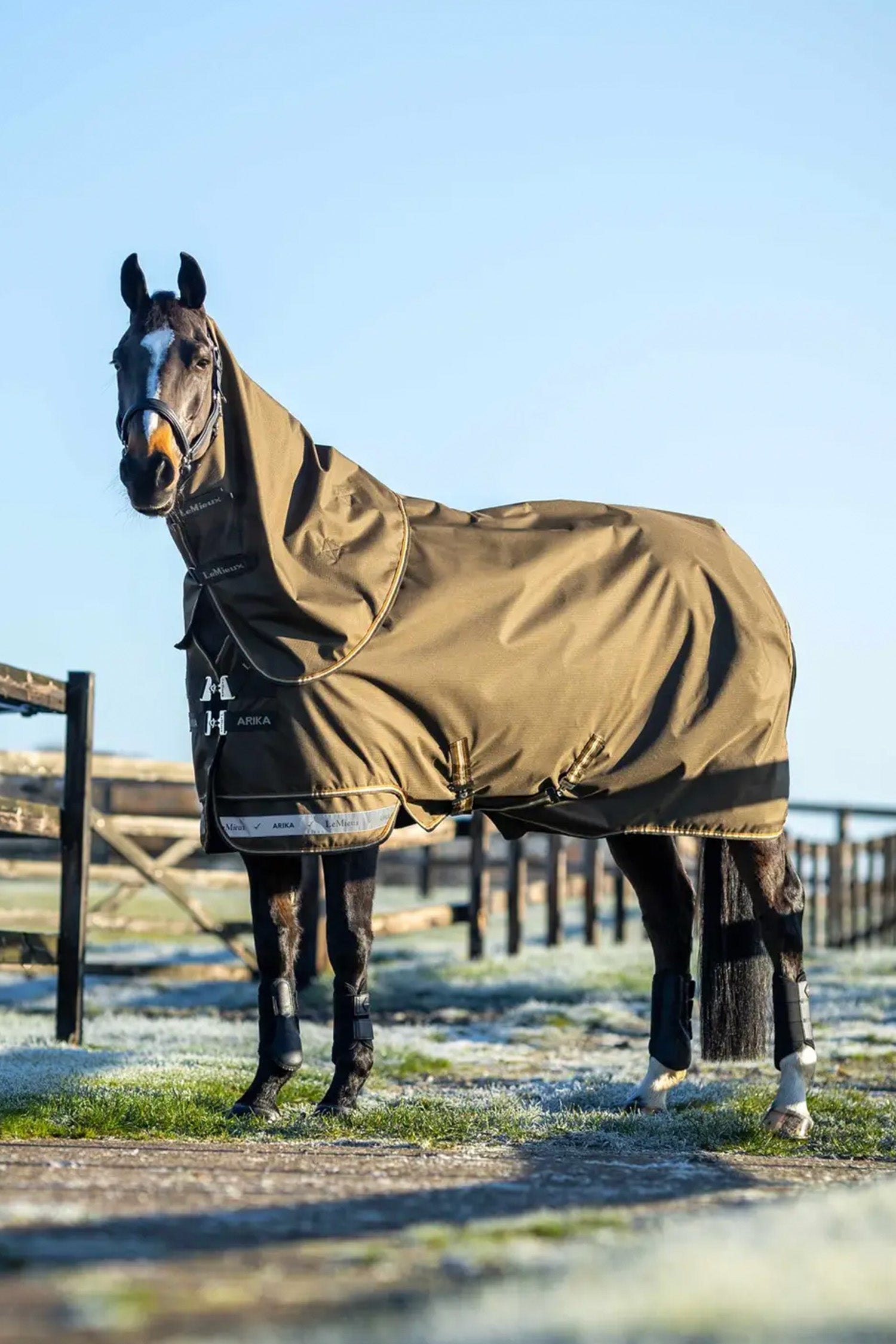 Genomtänkta detaljer gör täcket extra praktiskt i vardagen: reflexpartier gör hästen lättare att se i mörker, en PVC-beklädd svansrem är enkel att torka av och hålla ren, kryssgjordar och elastiska bensnören håller täcket stabilt på plats. Den avtagbara halsen ger flexibelt skydd beroende på väder, och fästen för Arika liners vid hals och bakdel gör det enkelt att bygga ett mångsidigt lager-på-lager system året runt.
