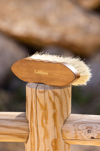 Med en kombination av naturligt tagel och syntetiska borst är LeMieux Artisan Combi Body Brush en pålitlig vardagsborste för känsliga hästar, smutsiga huvuden och ben.