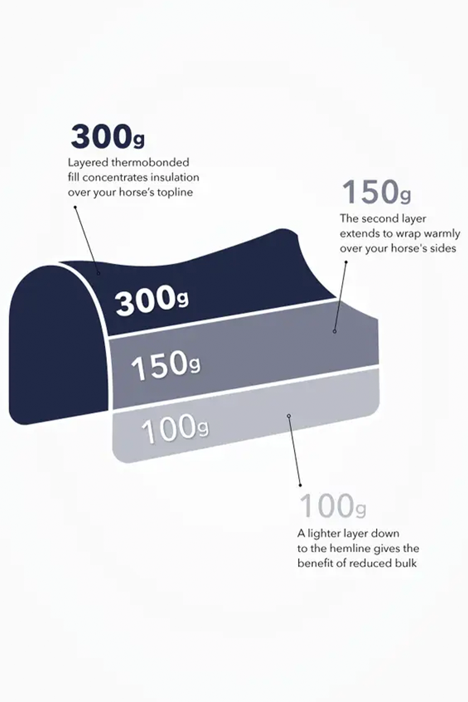 Täcket har en 300 g thermoblandad fyllning med graderad quiltning som koncentrerar isoleringen över hästens överlinje. Det ger extra värme över bog, rygg och bakdel, där musklerna ofta blir stela av kyla. En dubbel fyllning fortsätter ned över sidorna för ökad värme, medan en enkel fyllning längre ned mot nederkanten minskar klumpigheten och ger en smidigare känsla.
