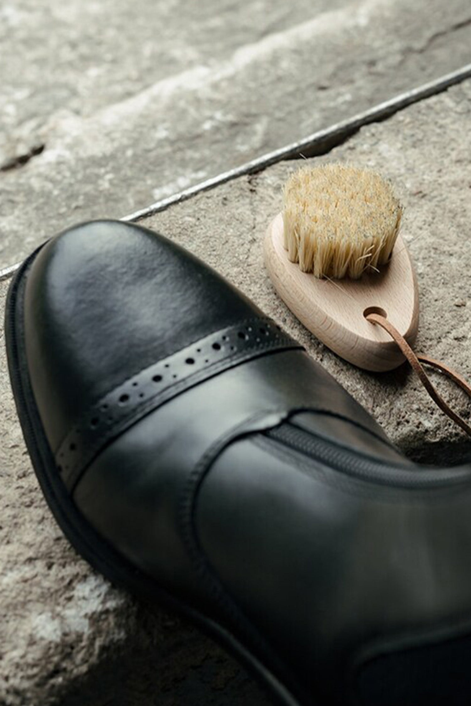De naturliga Mex-fiberborsten avlägsnar effektivt damm, sand och smuts från stövlar, skor, stigbyglar eller hovar, utan att skada ytan. En liten detalj som gör stor skillnad för en välputsad och professionell look.
