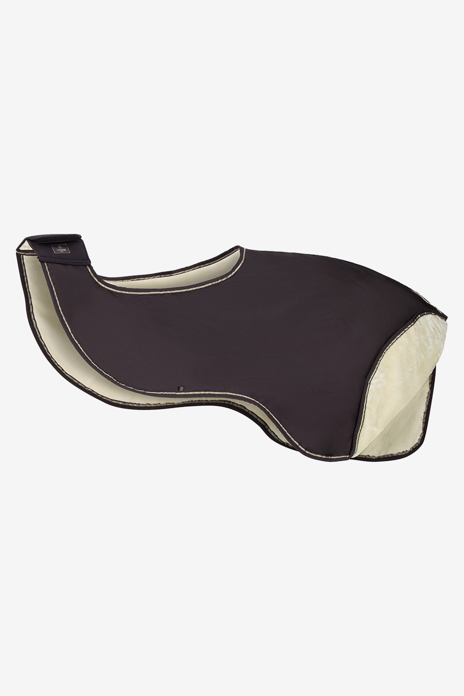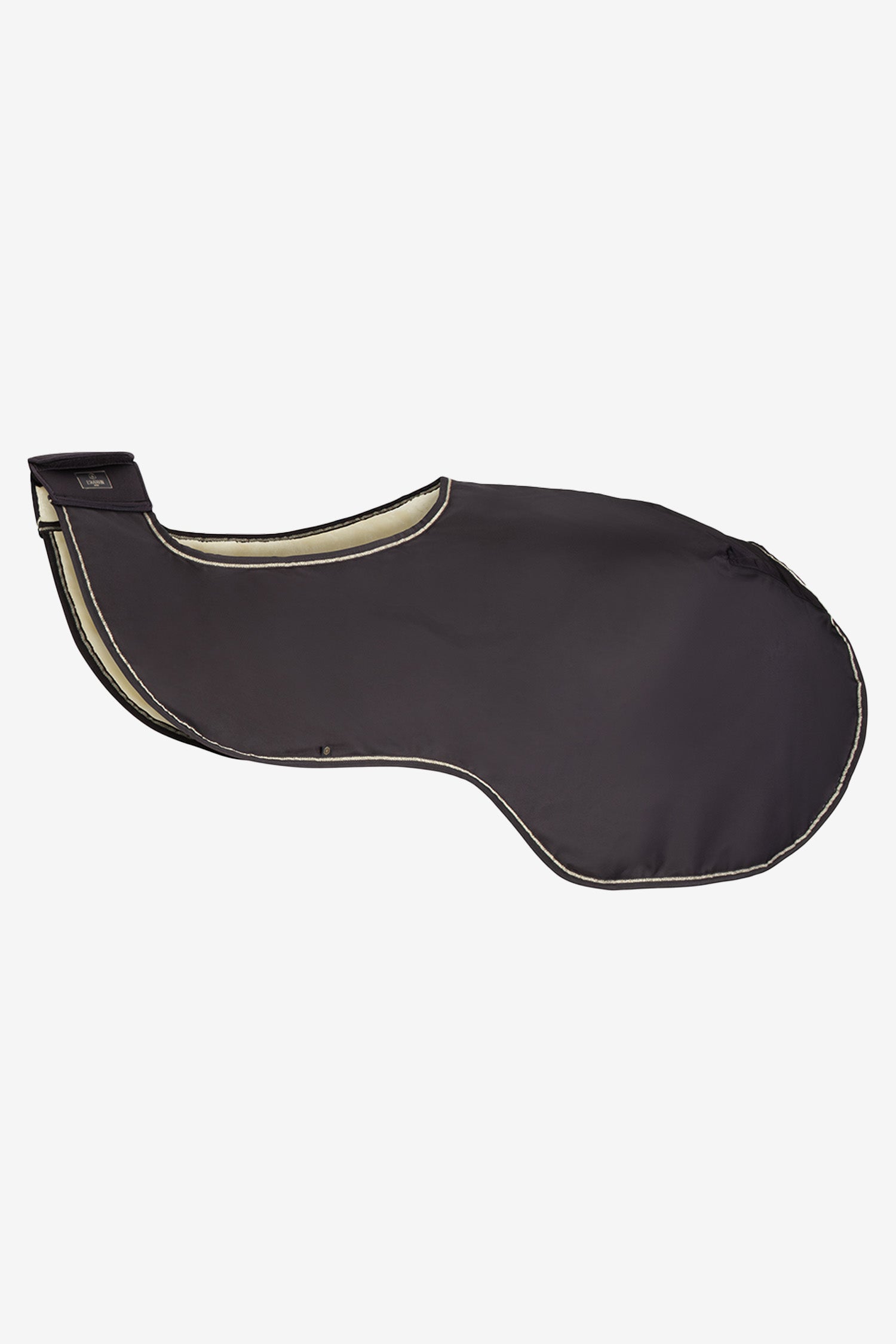 Täcket har ett praktiskt urtag för sadeln, neoprenvaddering vid manken med kardborreknäppning för optimal passform samt integrerad svansrem som håller täcket på plats. Den glansiga kantningen med lurex-detalj ger en sofistikerad finish.