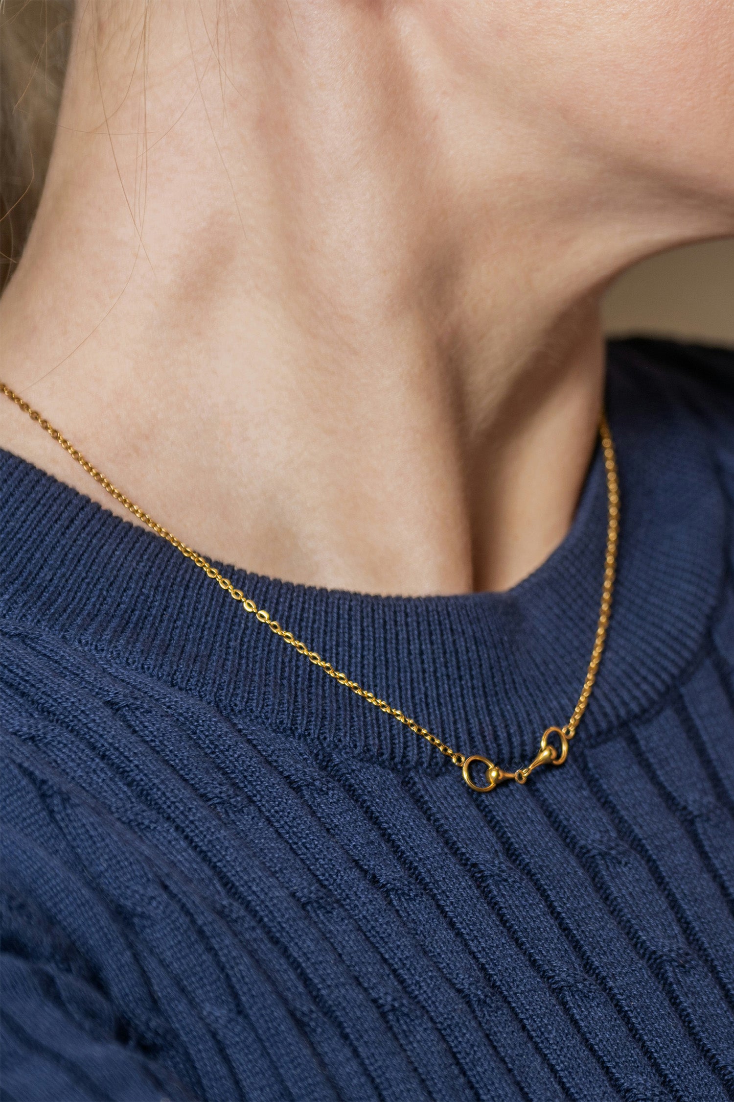 Den tunna och eleganta kedjan kombineras med ett litet, stilfullt bett i guldpläterat rostfritt stål som ger hög hållbarhet och långvarig glans utan skötsel. Smycket tål vatten och är gjort för att följa med i vardagen.