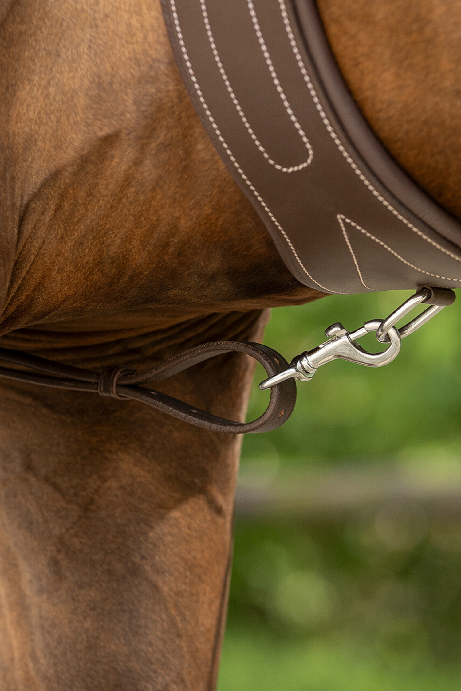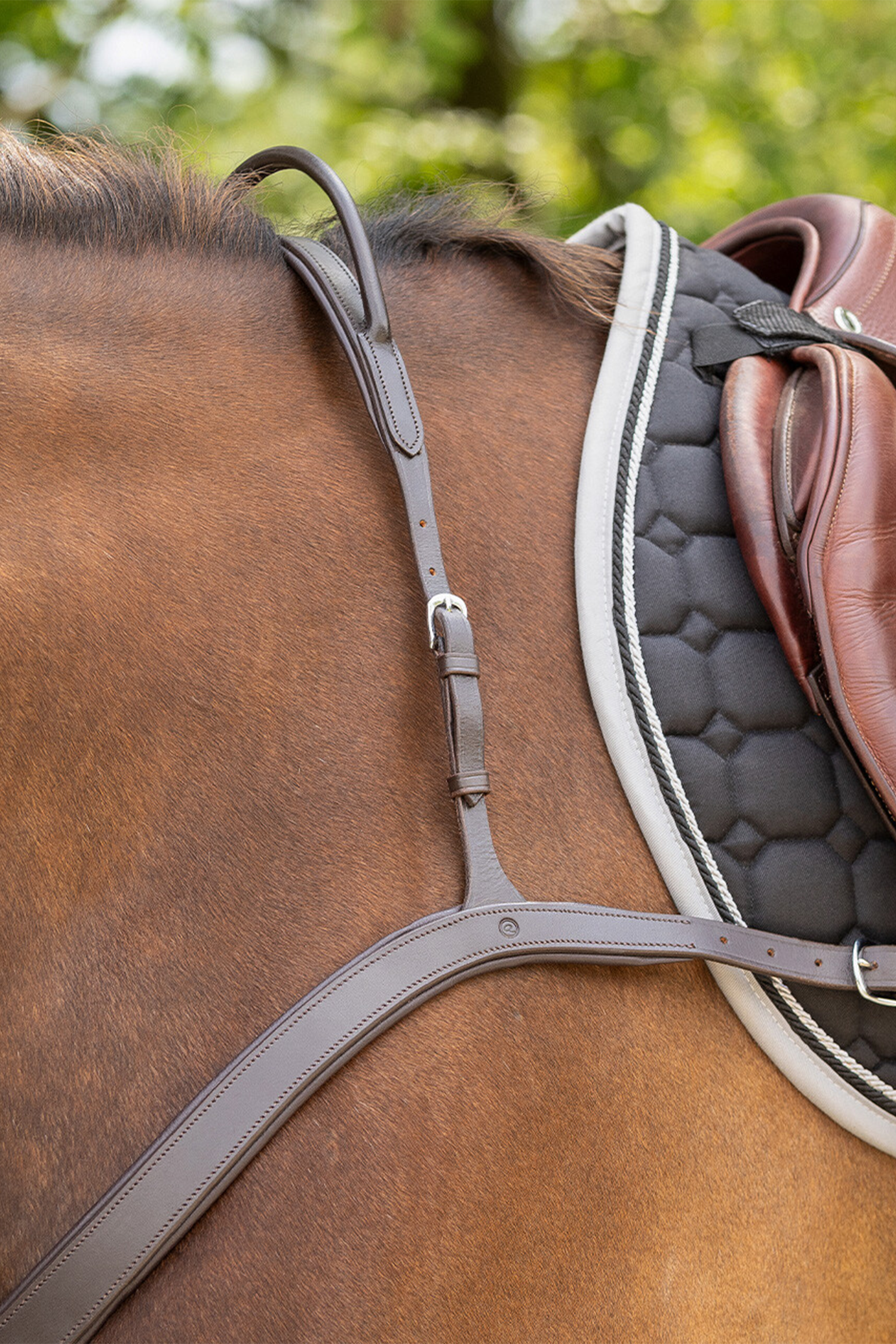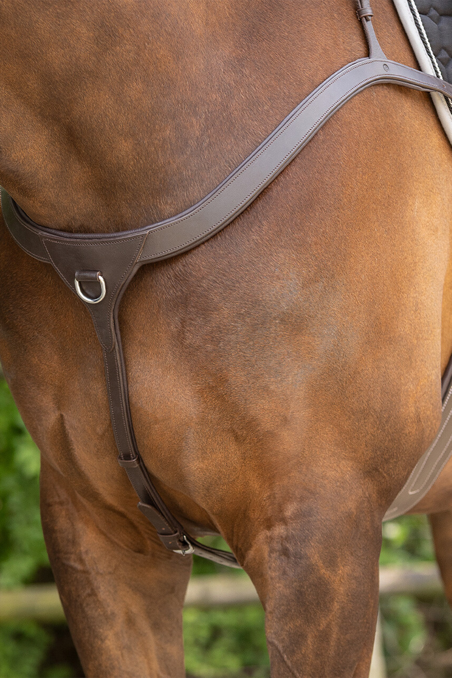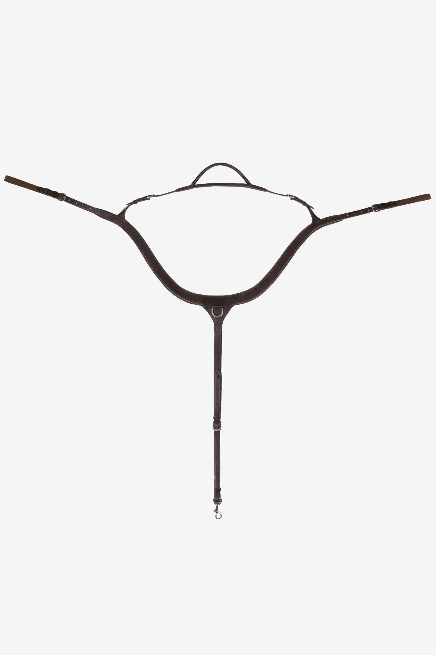 Det integrerade handtaget är rundsytt för ett bekvämt och säkert grepp och placerat så att ryttaren enkelt kan använda det vid behov, exempelvis vid plötsliga rörelser eller obalans. Förbygelns konstruktion hjälper till att fördela trycket jämnt över hästens bröst, vilket bidrar till ökad komfort och minskar risken för skav.