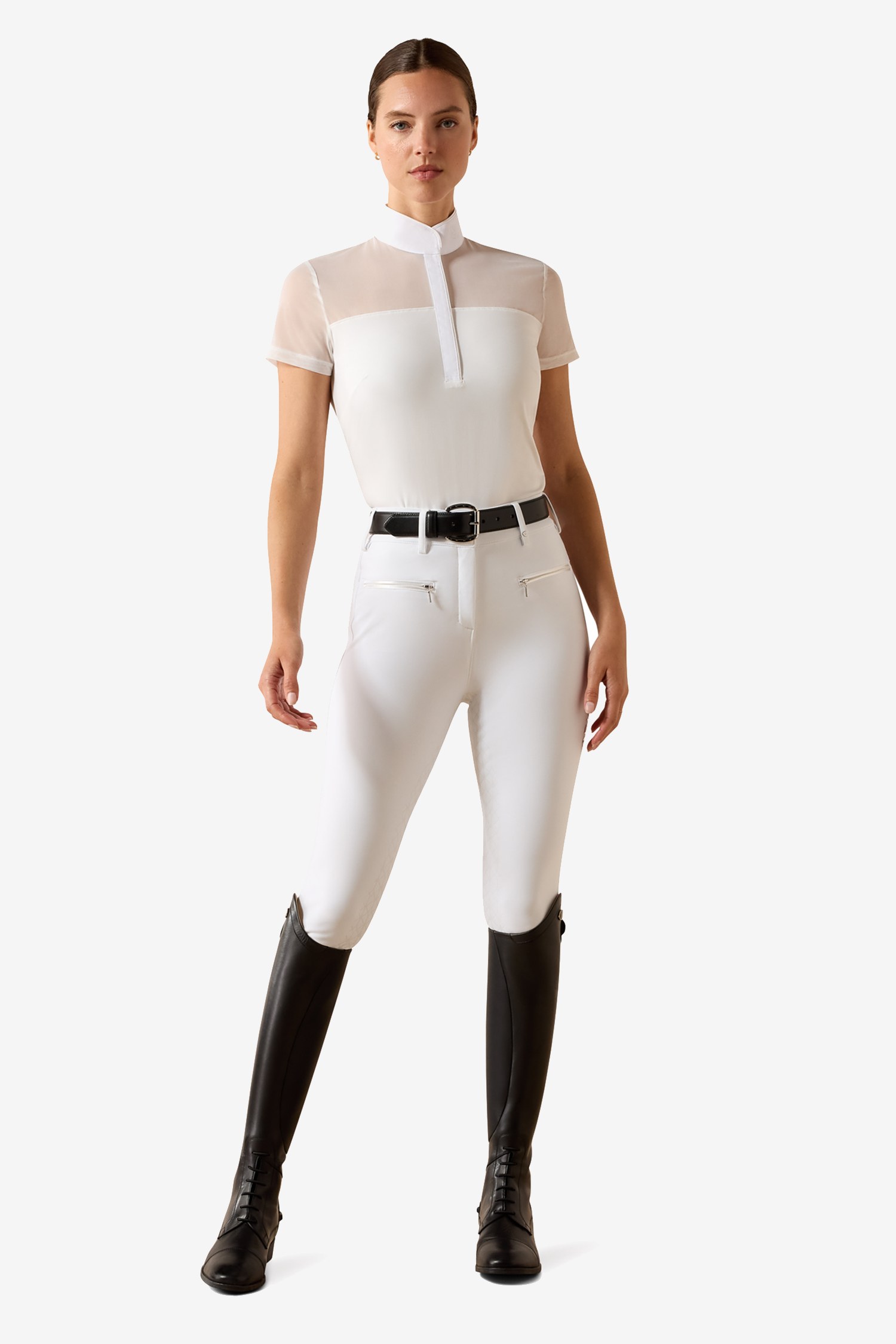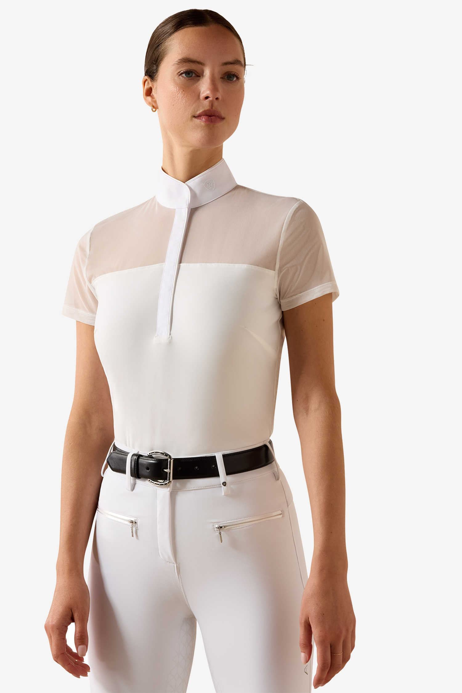Den kroppsnära passformen är anpassad för tävlingsryttare och ger ett smickrande intryck samtidigt som den erbjuder full rörelsefrihet i sadeln. Det tekniska materialet hjälper till att reglera kroppstemperaturen under intensiva moment och håller dig sval när det blir varmt. Den luktreglerande funktionen bidrar till en fräsch känsla under långa tävlingsdagar, medan den smutsavvisande ytan gör plagget lättare att hålla rent.
