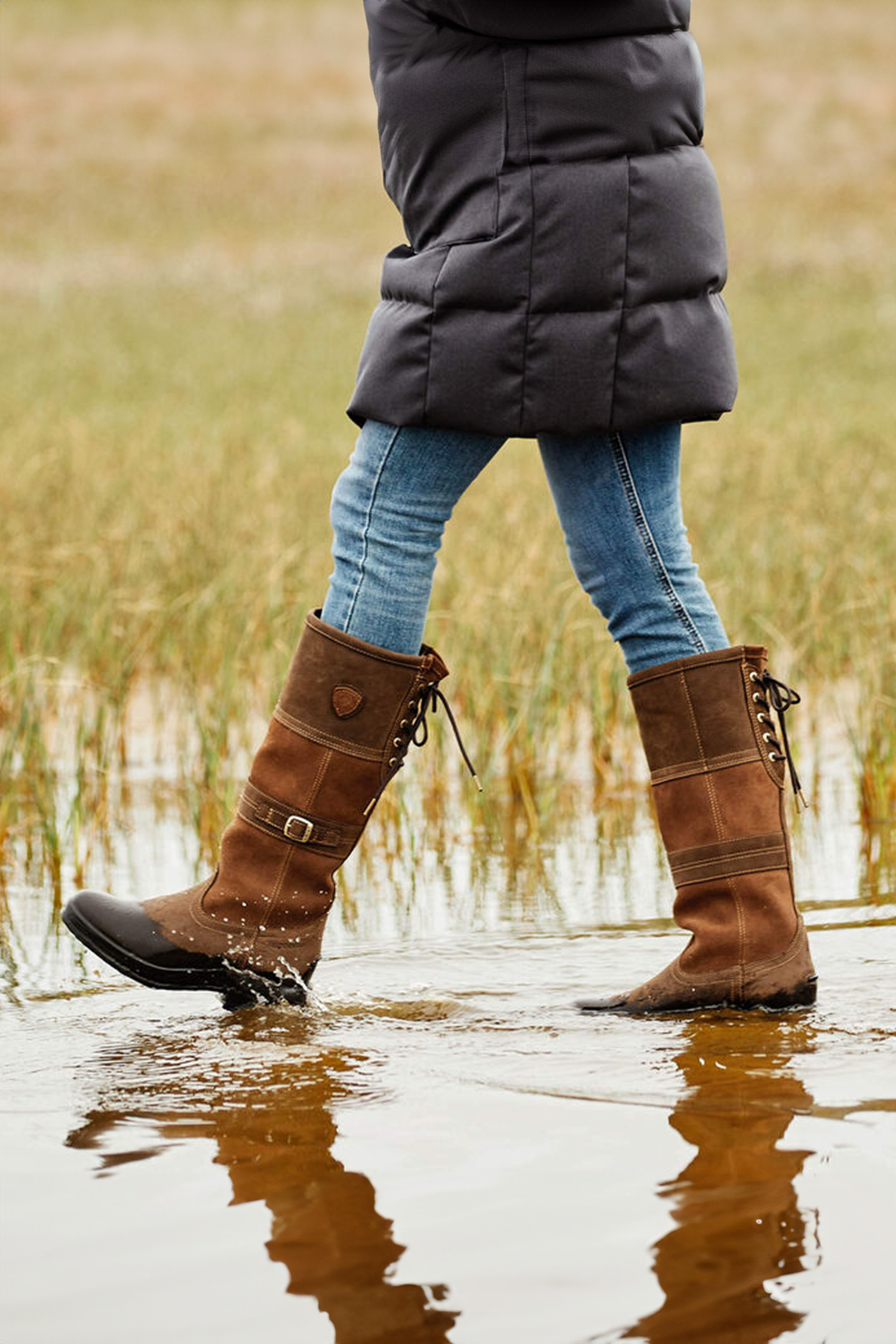Yttersulan är slitstark och greppvänlig, anpassad för varierande underlag som stallgångar, grusvägar och våta ytor. Färgen Java ger ett tidlöst och lättmatchat uttryck som passar både ridkläder och vardagsoutfits.