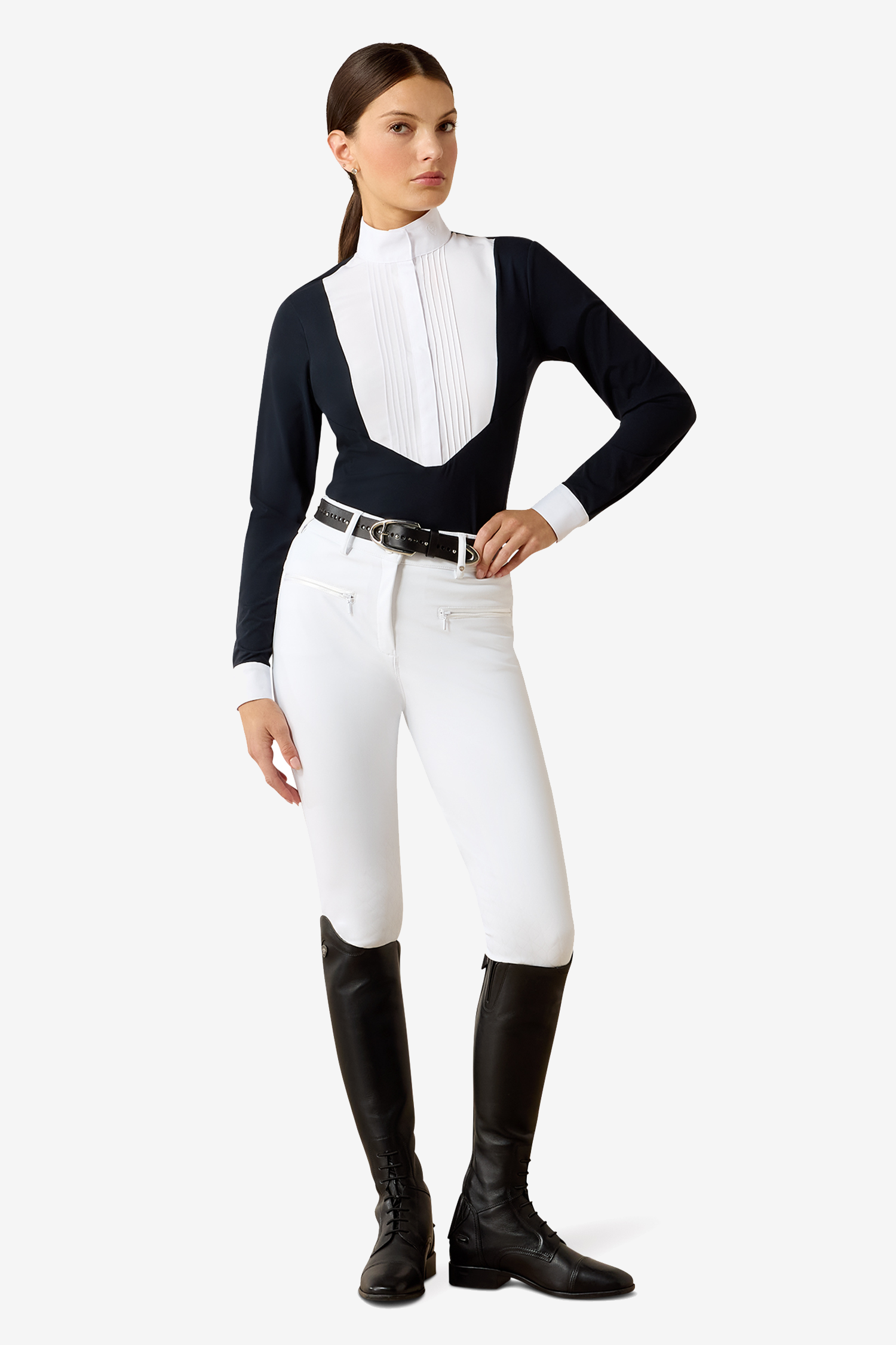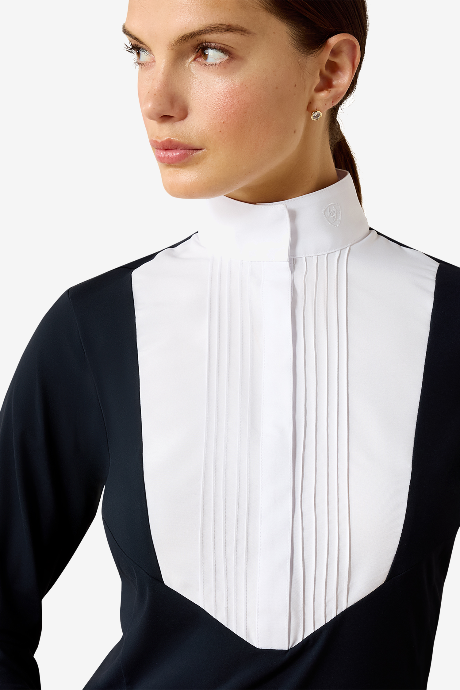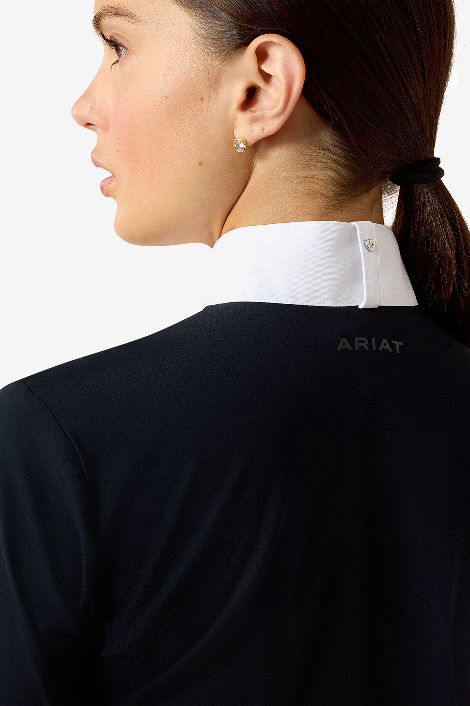 Ariat tävlingströja med solskydd är en exklusiv showtröja som kombinerar elegant design med avancerad funktion. Den dekorativa fronten med veckade detaljer ger ett klassiskt och sofistikerat uttryck, samtidigt som den lätta silhuetten gör plagget perfekt för soliga tävlingsdagar.