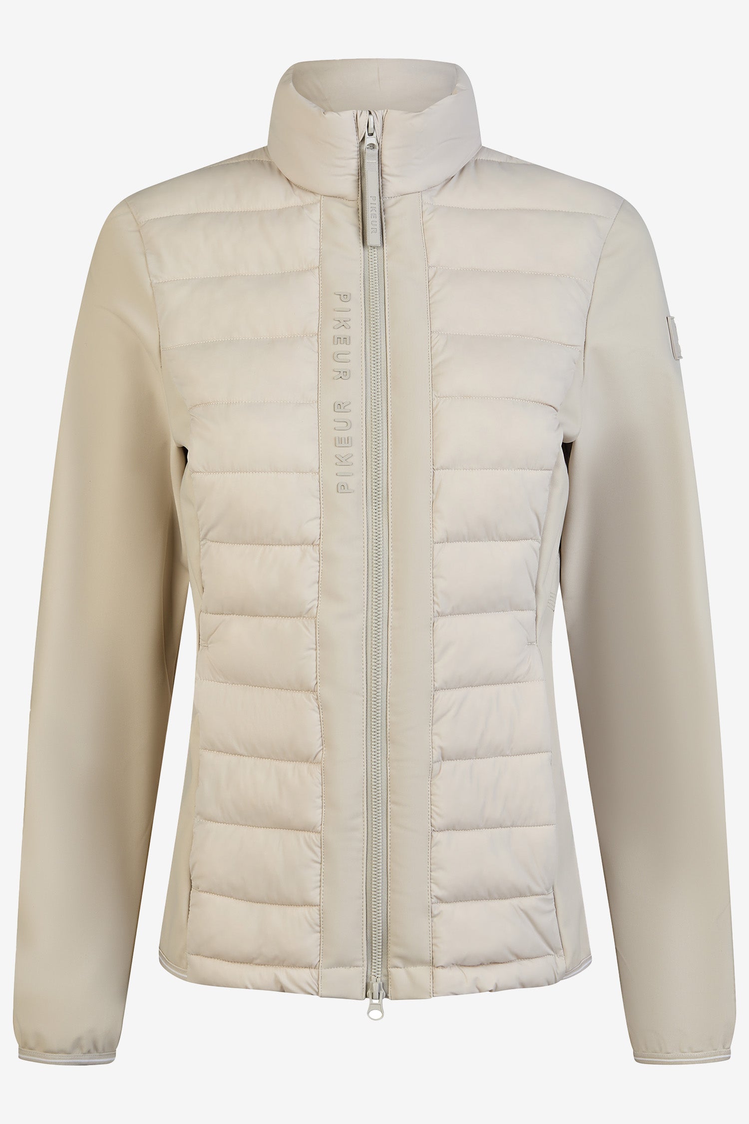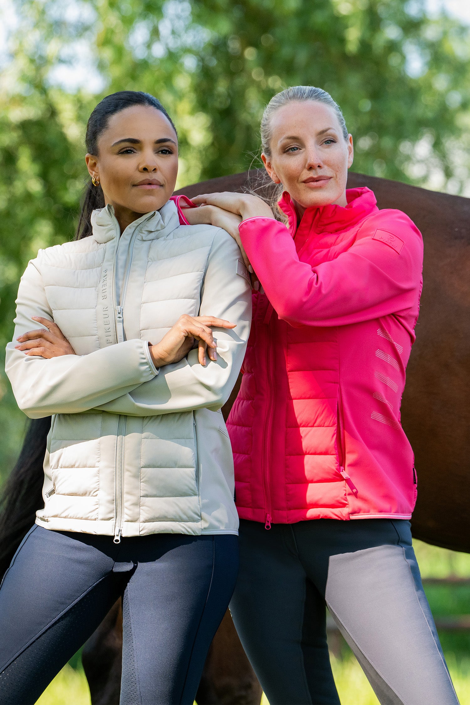 Jackan är utrustad med tvåvägsdragkedja framtill och dolda sidfickor med dragkedja som ger praktisk förvaring utan att störa designen. Kantade ärmslut med diskreta vita ränder, ton-i-ton Pikeur-print ger en exklusiv helhet. Jackan är testad och certifierad för användning tillsammans med FREEJUMP AIRBAG.