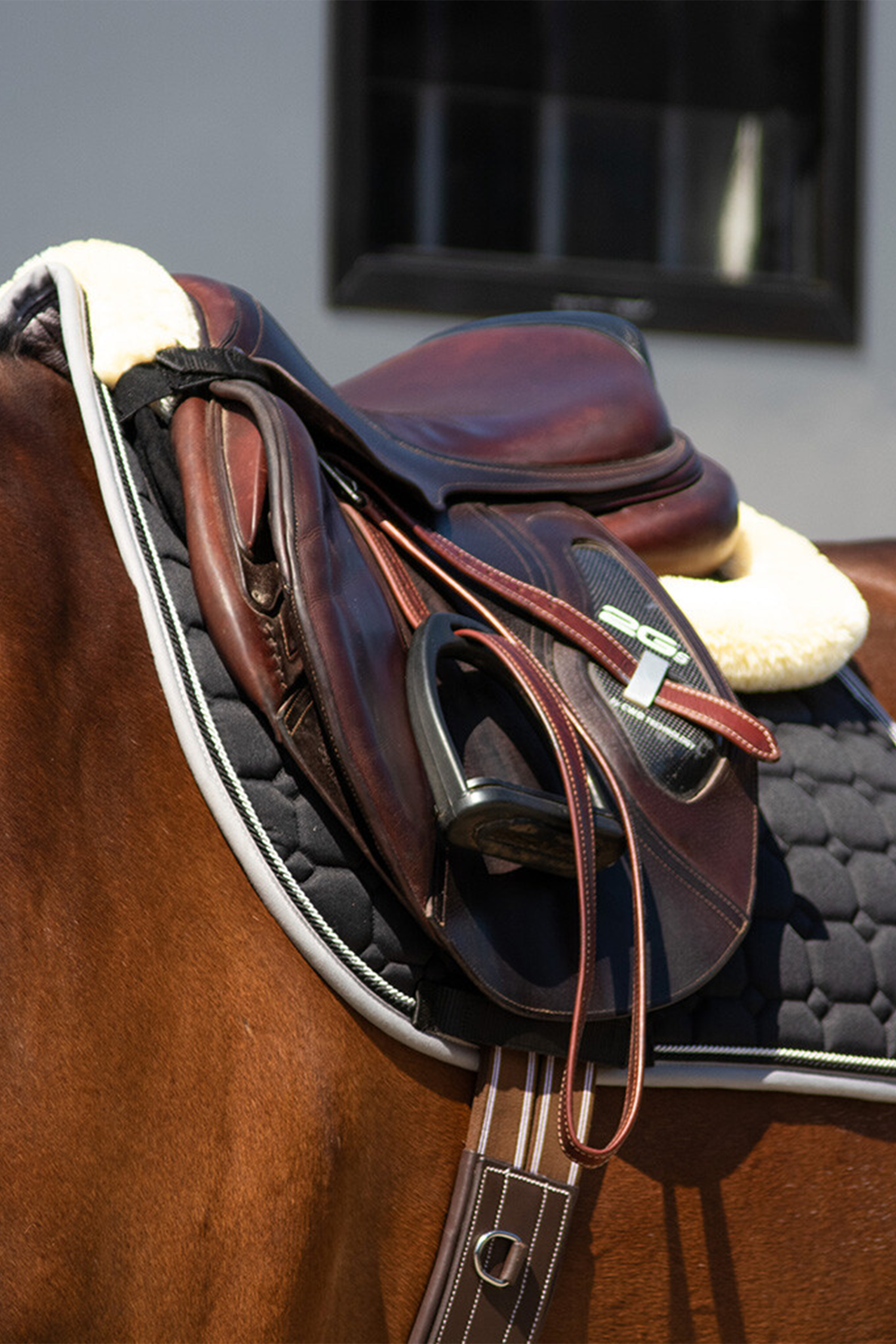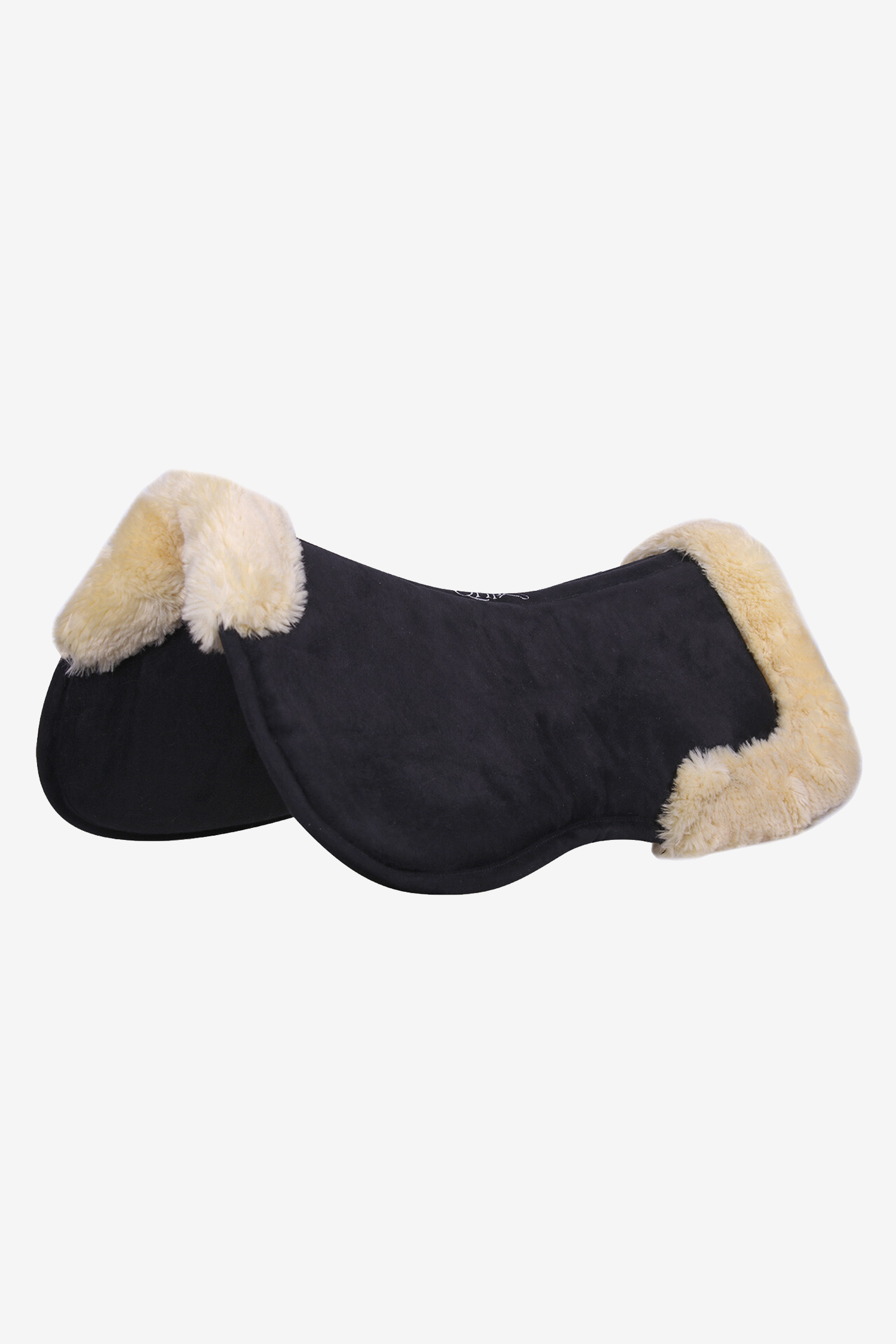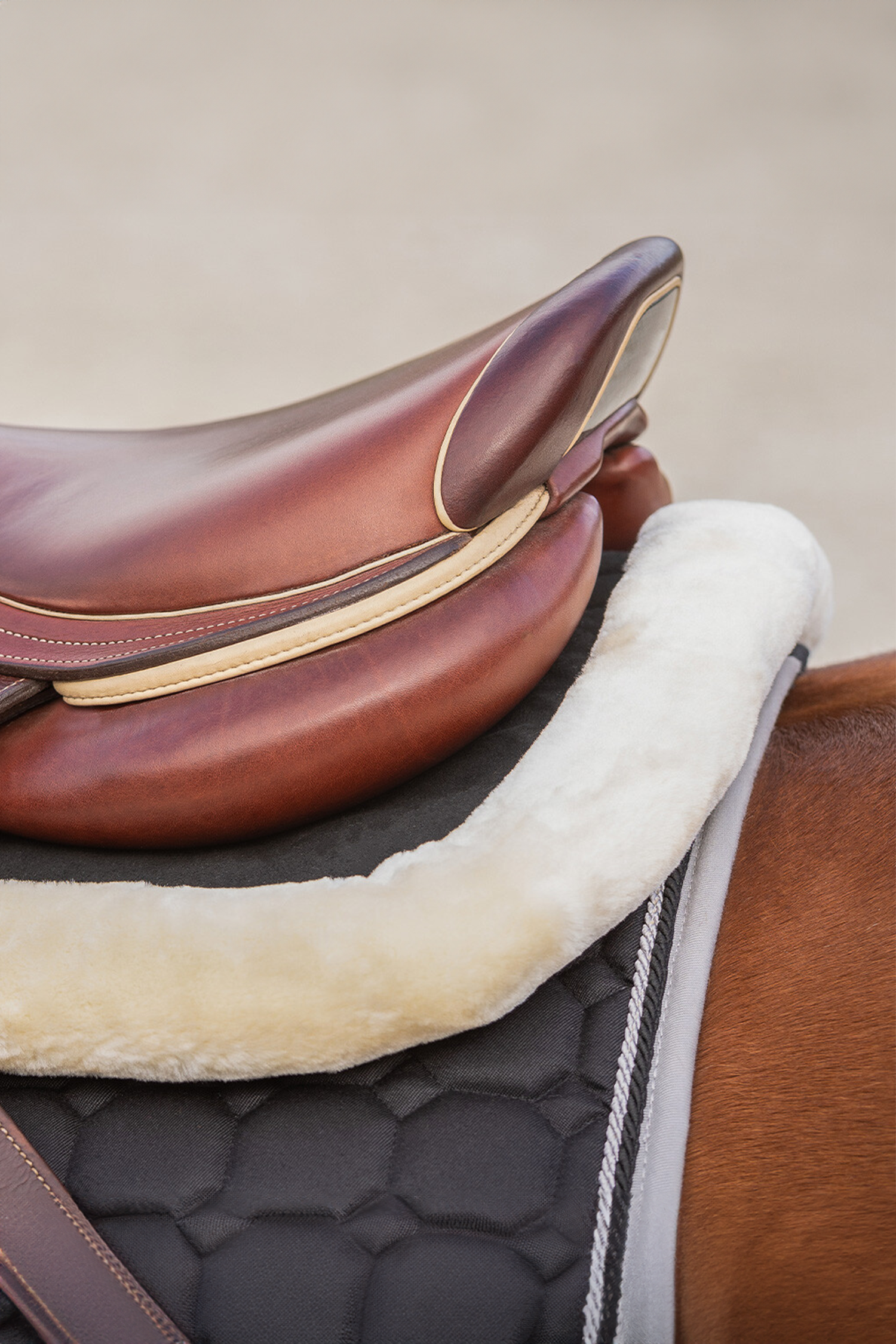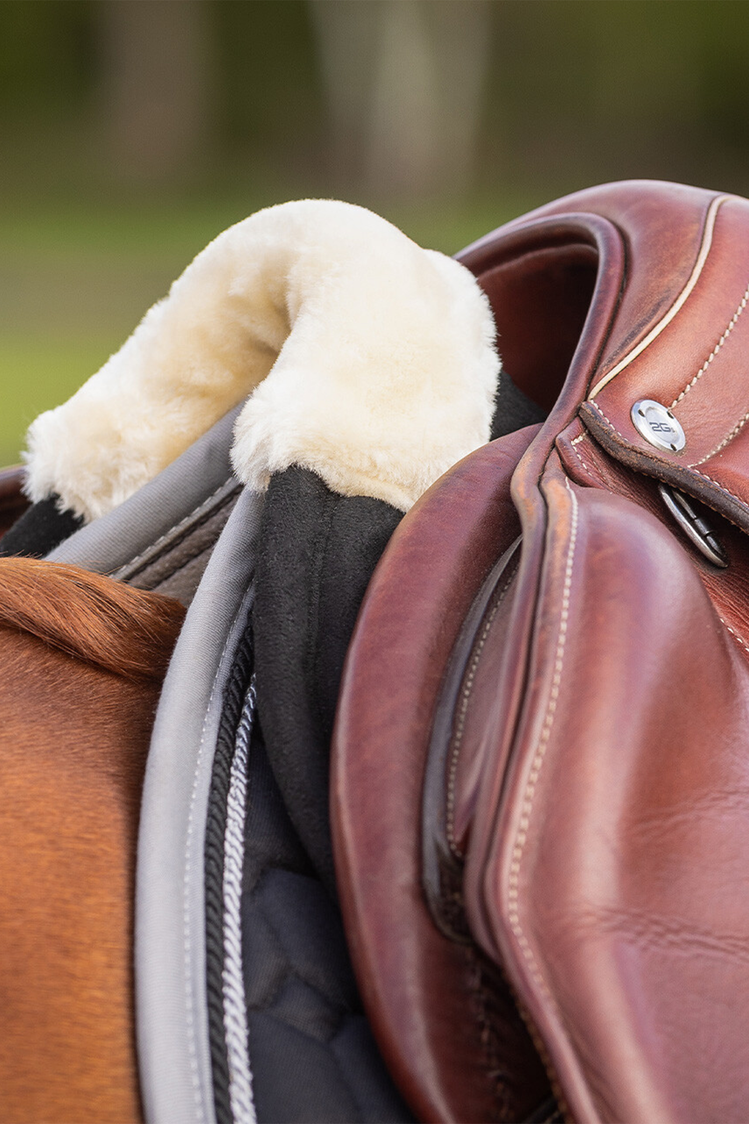 Ovansidan i mockaliknande material ger ett bra grepp mot sadeln, medan undersidan i fleece hjälper till att hålla padden stabil på plats. Den mjuka kanten i syntetpäls vid manken och baktill bidrar till ökad komfort och minskar risken för tryck.
