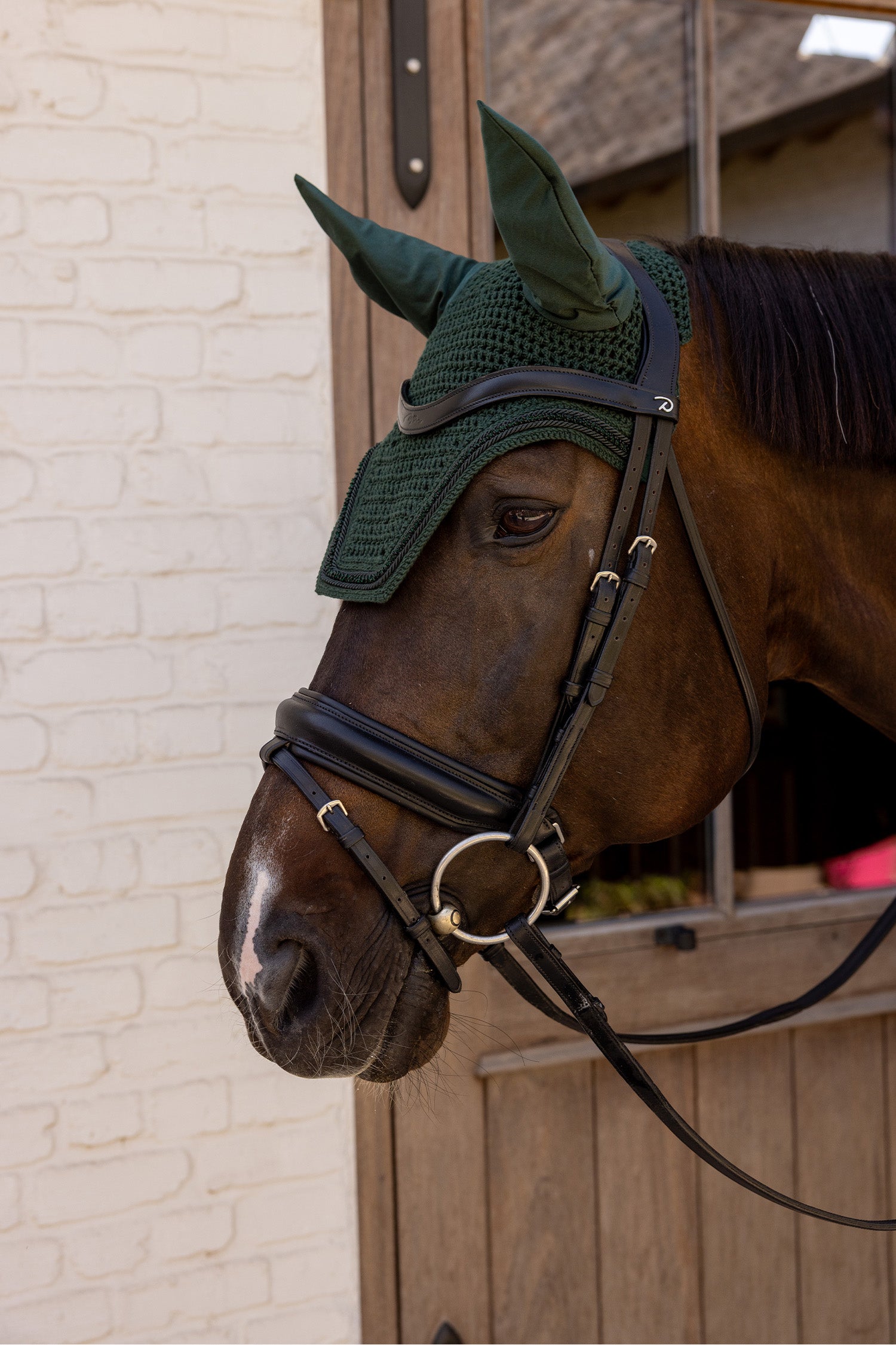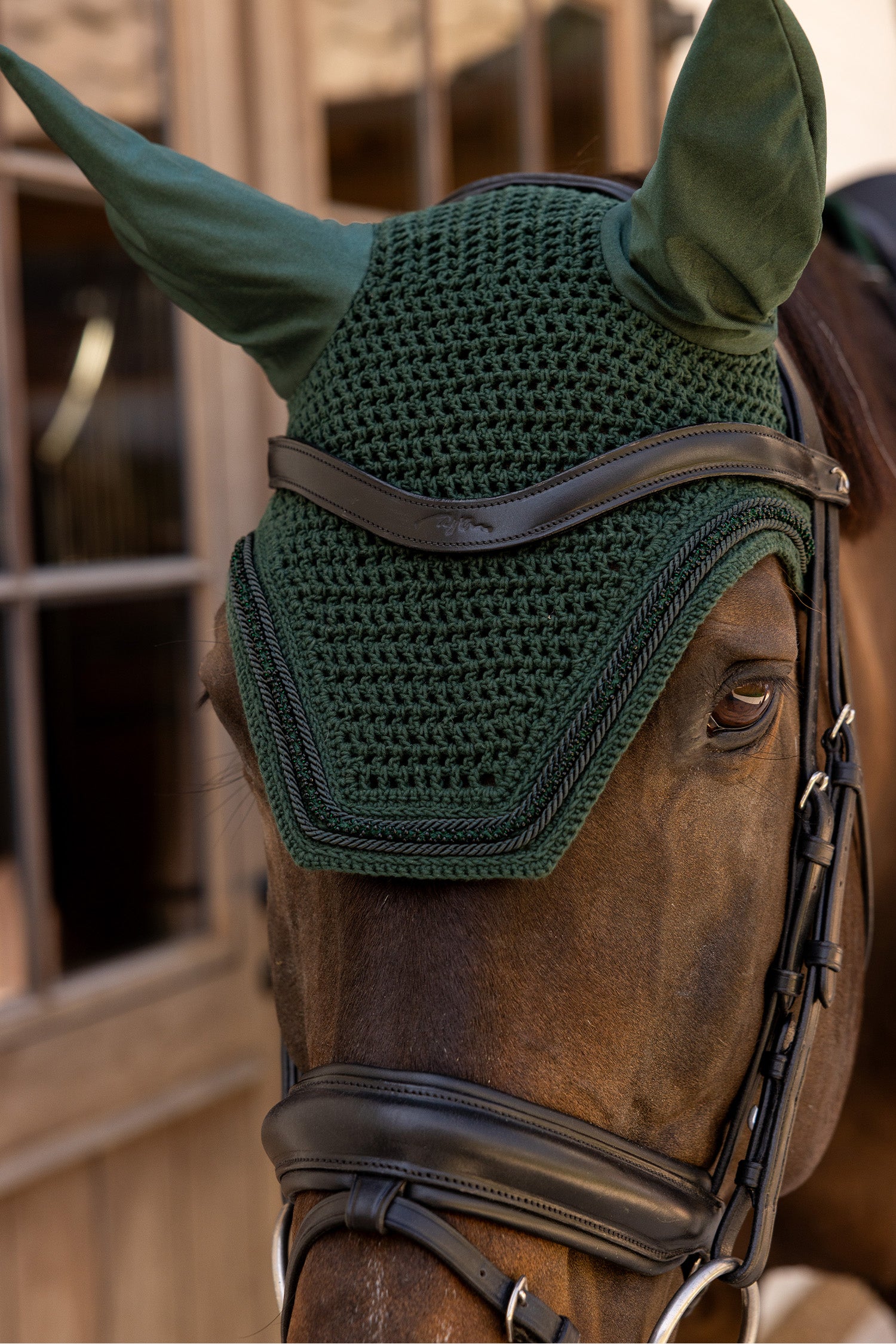 Den matchande huvan kombinerar funktion och elegans. Den skyddar hästens öron från insekter och störande ljud, samtidigt som den sitter bekvämt tack vare det mjuka och elastiska virkade materialet. Även huvan är dekorerad med den exklusiva pärldetaljen, vilket skapar en enhetlig och stilfull look tillsammans med schabraket.