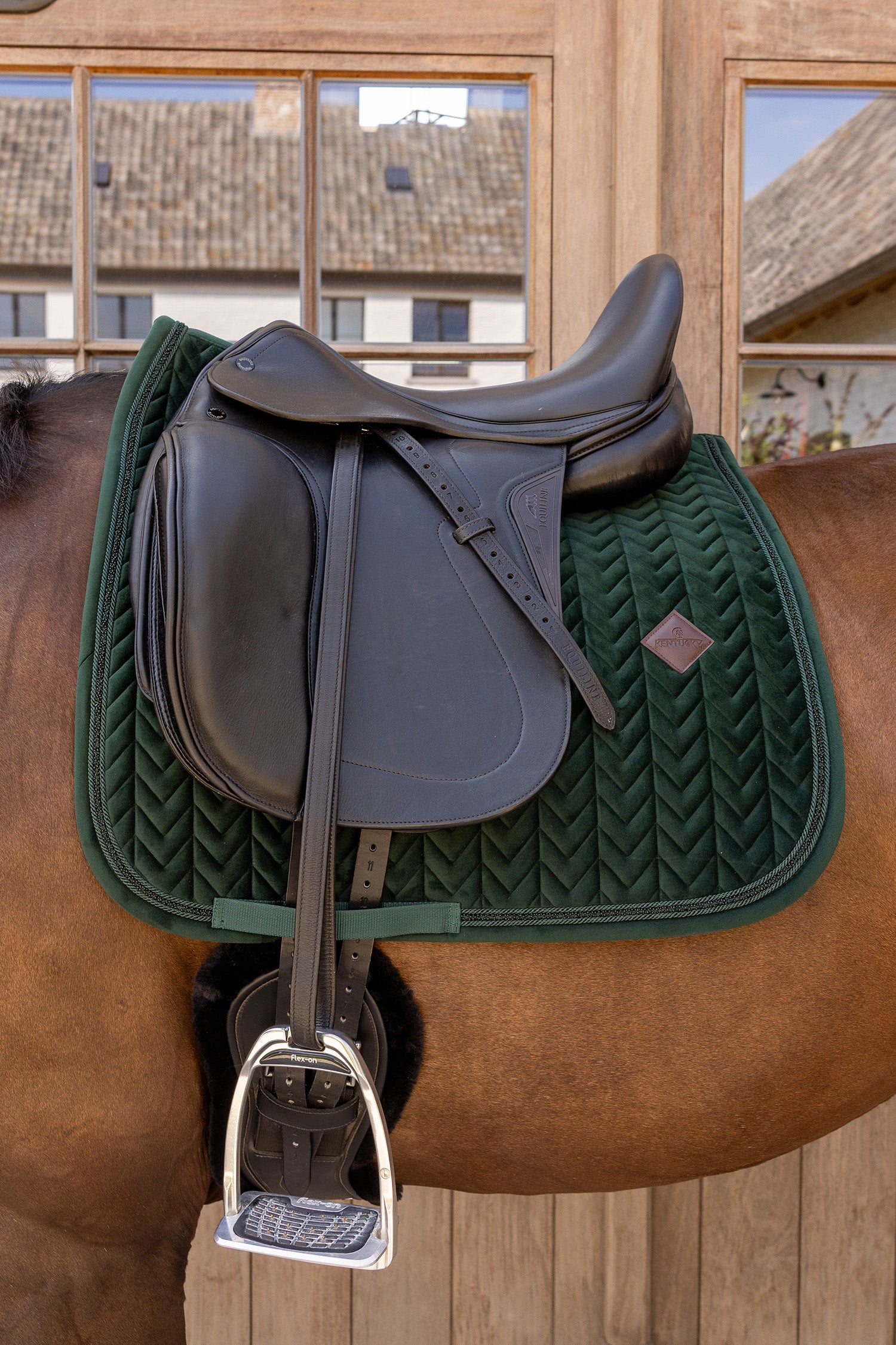 Dressyrschabraket är anatomiskt format för att ge en tryckfri passform vid manken och samtidigt ligga stabilt under sadeln. Det är tillverkat i högkvalitativt material med andningsförmåga och fukttransporterande egenskaper, vilket håller din häst torr och bekväm även under intensiva ridpass. De dekorativa pärlorna ger en sofistikerad finish och gör att schabraket verkligen sticker ut på banan eller träningen.