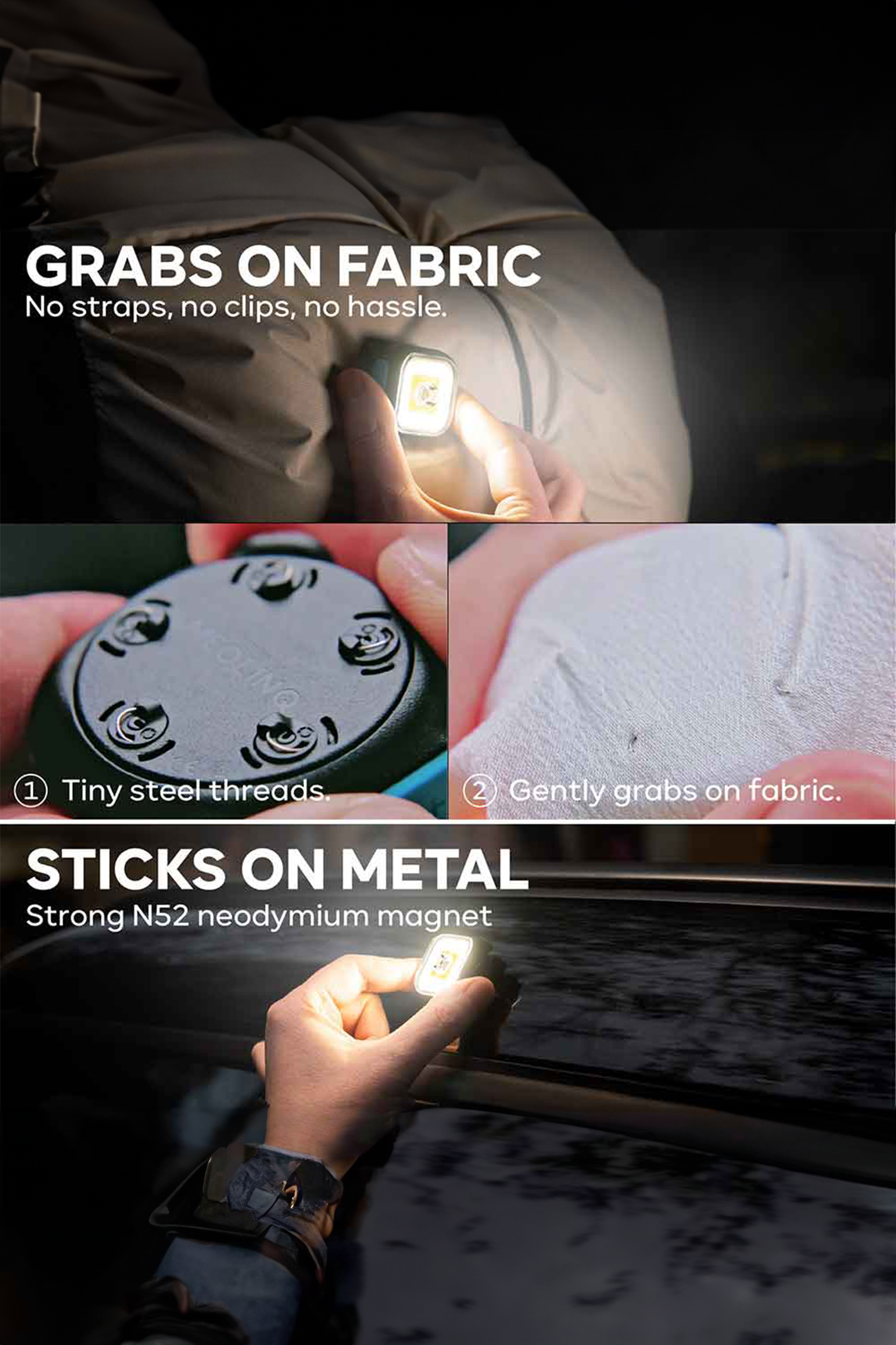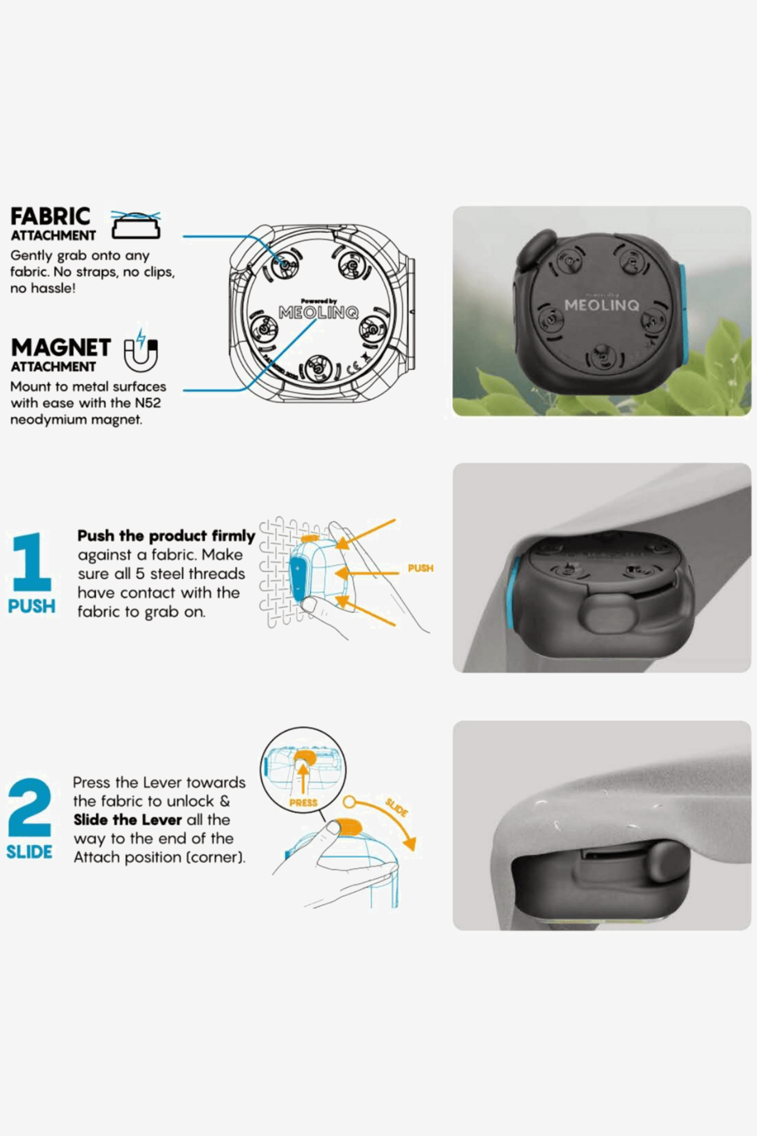 Lampan är utrustad med ett patenterat ståltrådsfästsystem – en svensk uppfinning från MEOLINQ – som gör det möjligt att snabbt och säkert fästa lampan på alla typer av tyger utan remmar, skador eller märken. Dessutom kan den fästas på magnetisk metall för ännu fler användningsområden.