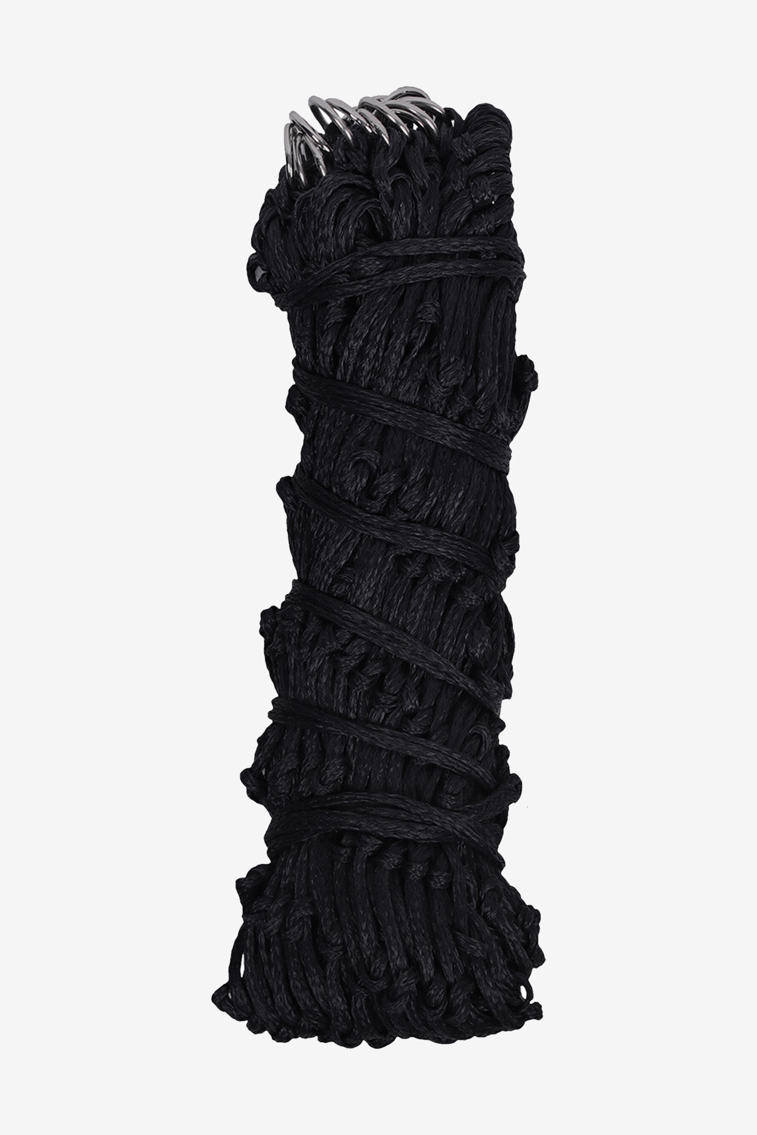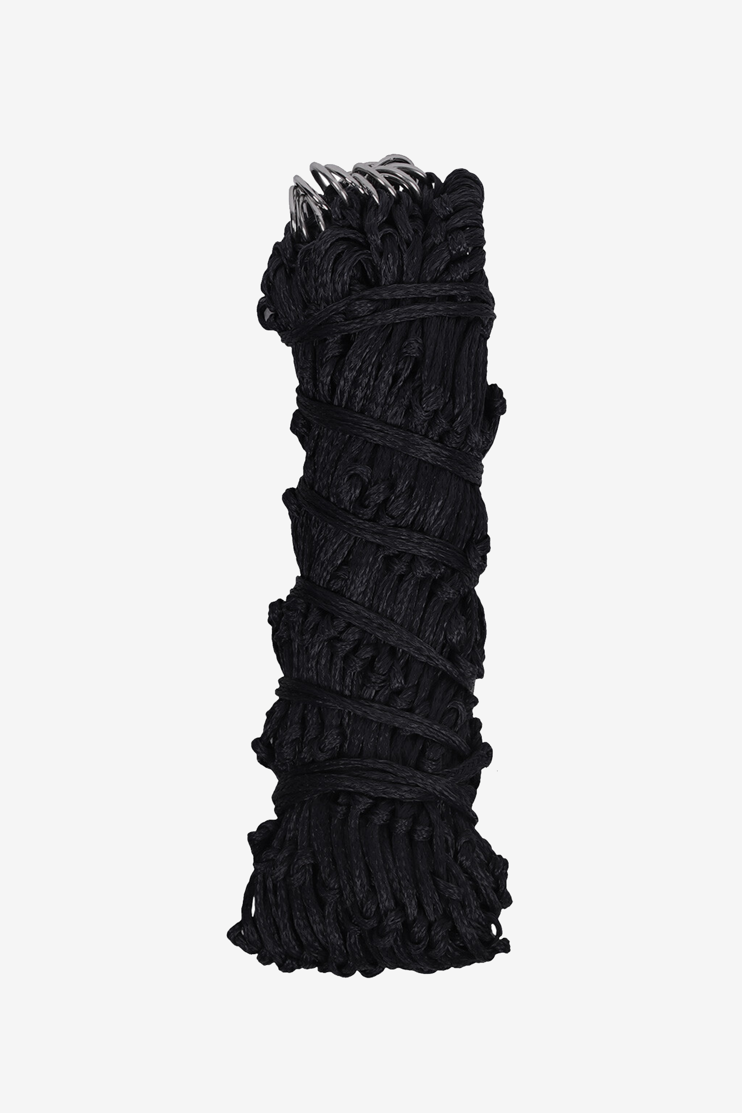 Hönätet har 22 ringar upptill och en ring i botten, vilket ger en jämn fördelning av höet och håller formen snyggt. Den långa knytlinan gör det enkelt att hänga upp nätet nästan var som helst – i stallet, hästbussen eller hagen.