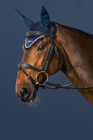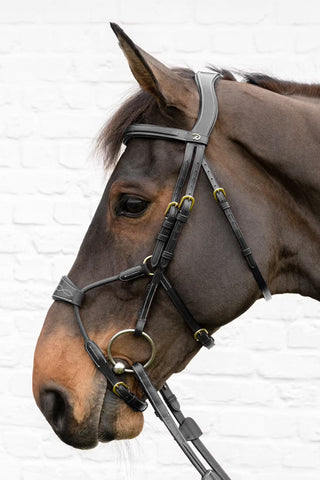Tillverkad i fint läder med inåtvända spännen i mässing. Tygeln har en vit mönstersöm och läckert designade martingalstoppar. Tjockleken på tygeln är 16 mm.