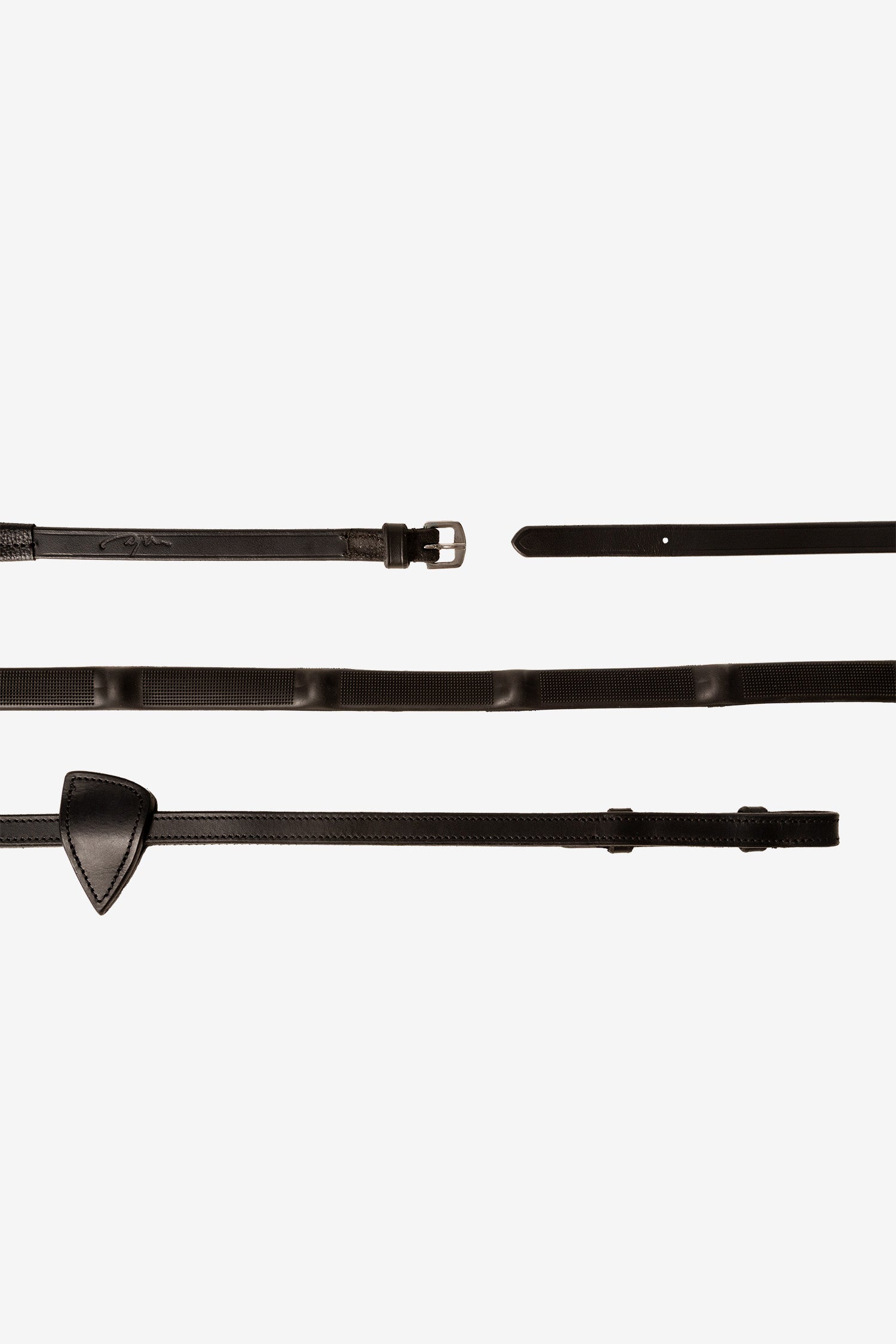 Tillverkade i extra mjukt gummi ger de en följsam känsla och hög komfort i handen, samtidigt som de erbjuder optimal flexibilitet. De sju integrerade stoppen är strategiskt placerade för att ge ett säkert grepp och förhindra att tyglarna glider, vilket garanterar jämn kontakt och stabilitet under ridningen. Den ultra-grip-texturerade ytan ser dessutom till att tyglarna ligger stadigt i handen även vid regn, svett eller fuktiga förhållanden.