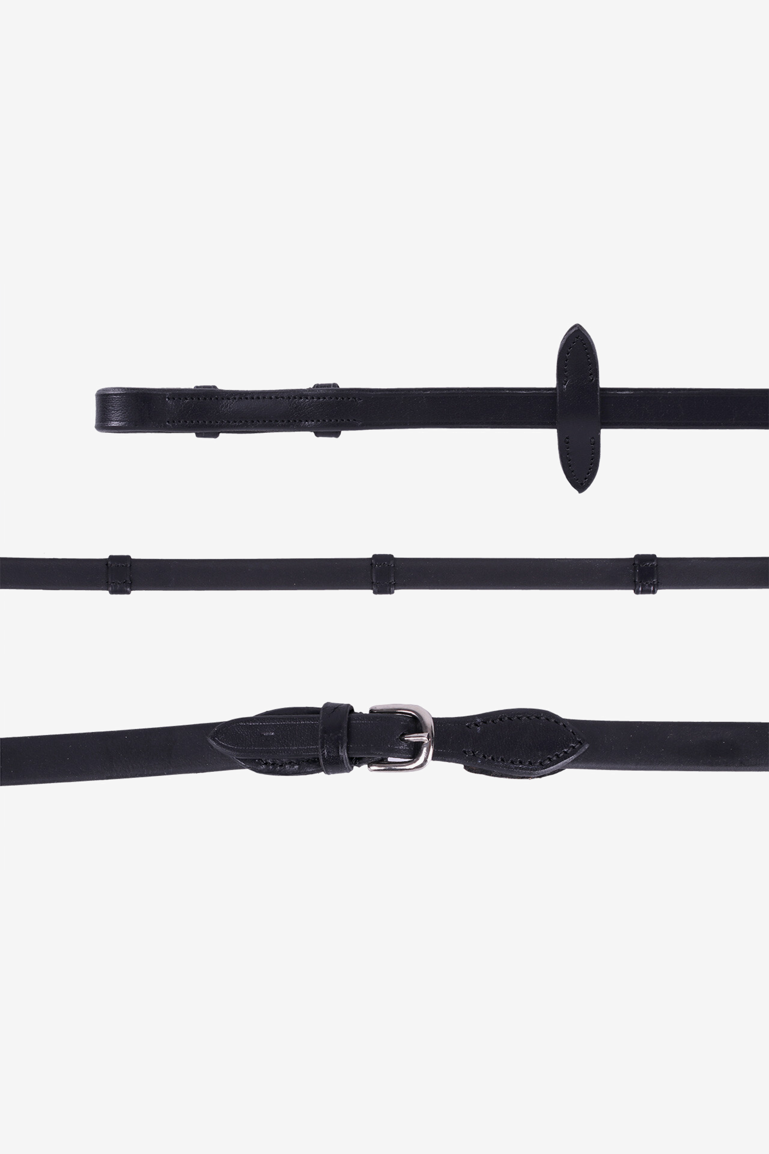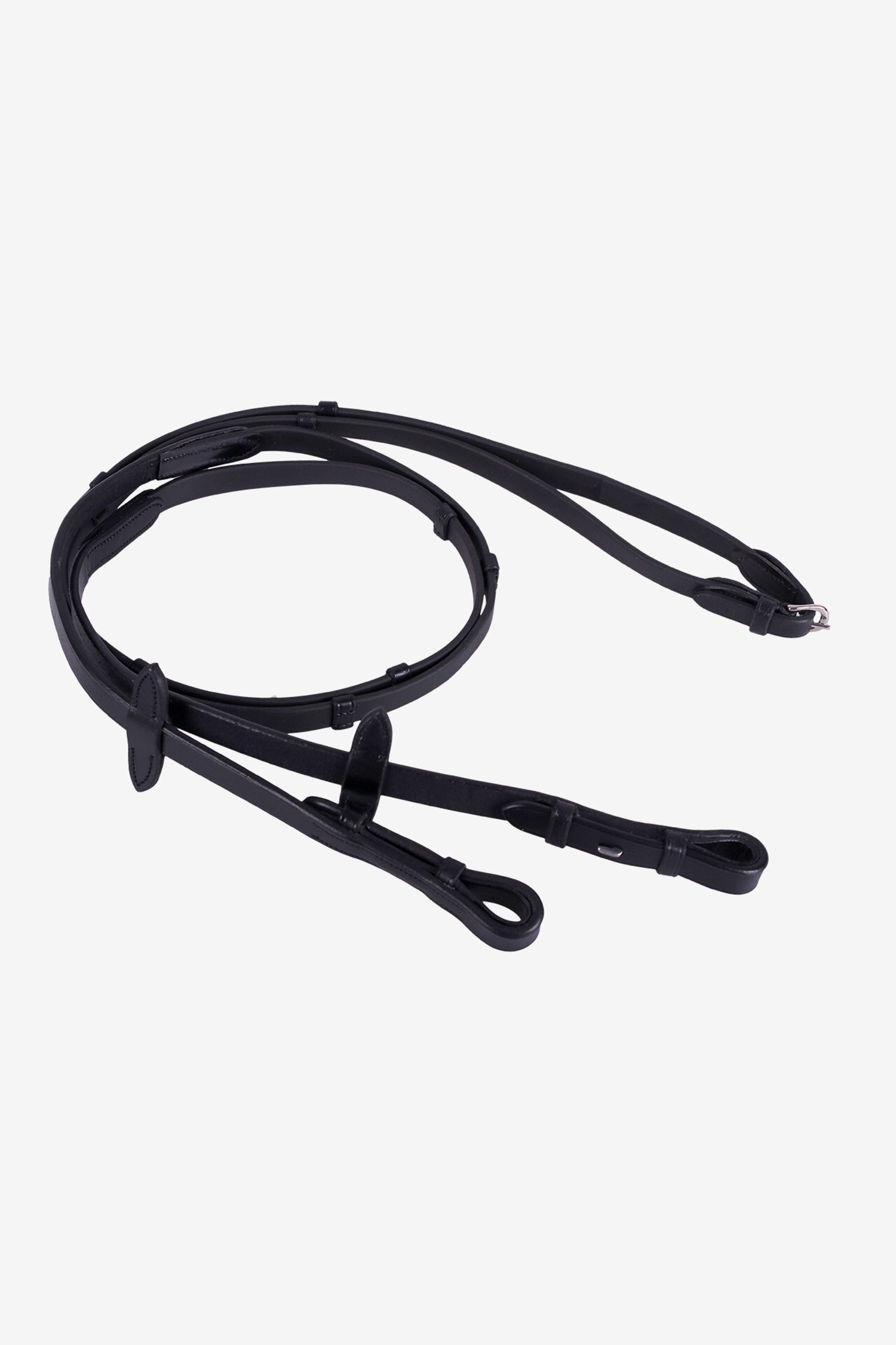 Tyglarna är flexibla och bekväma i handen, utrustade med läderstopp för bra grepp och martingalstopp i samma eleganta stil. De fästs enkelt med hakspännen i rostfritt stål och har en bredd på 15 mm – perfekt balans mellan grepp och känsla.