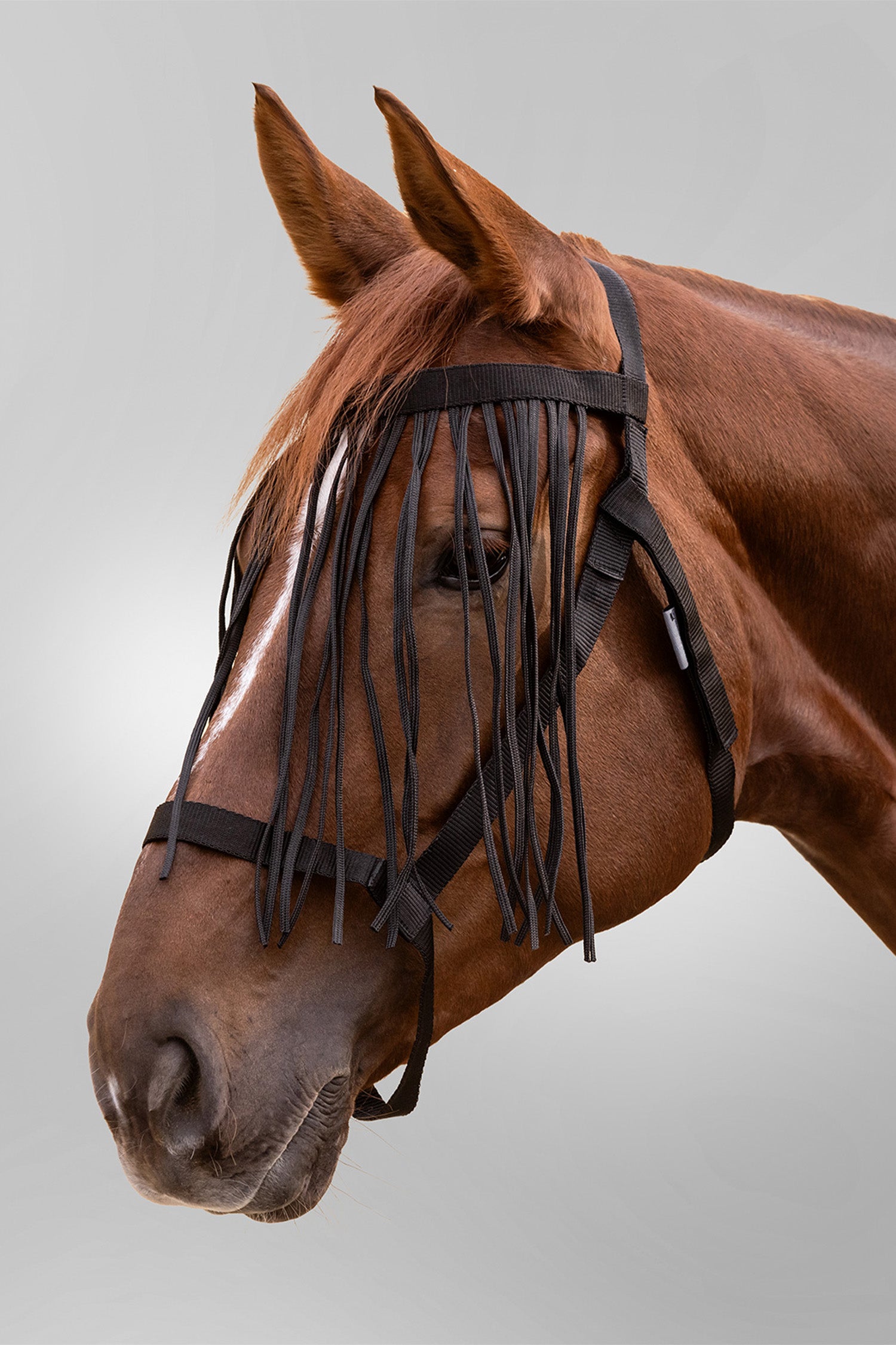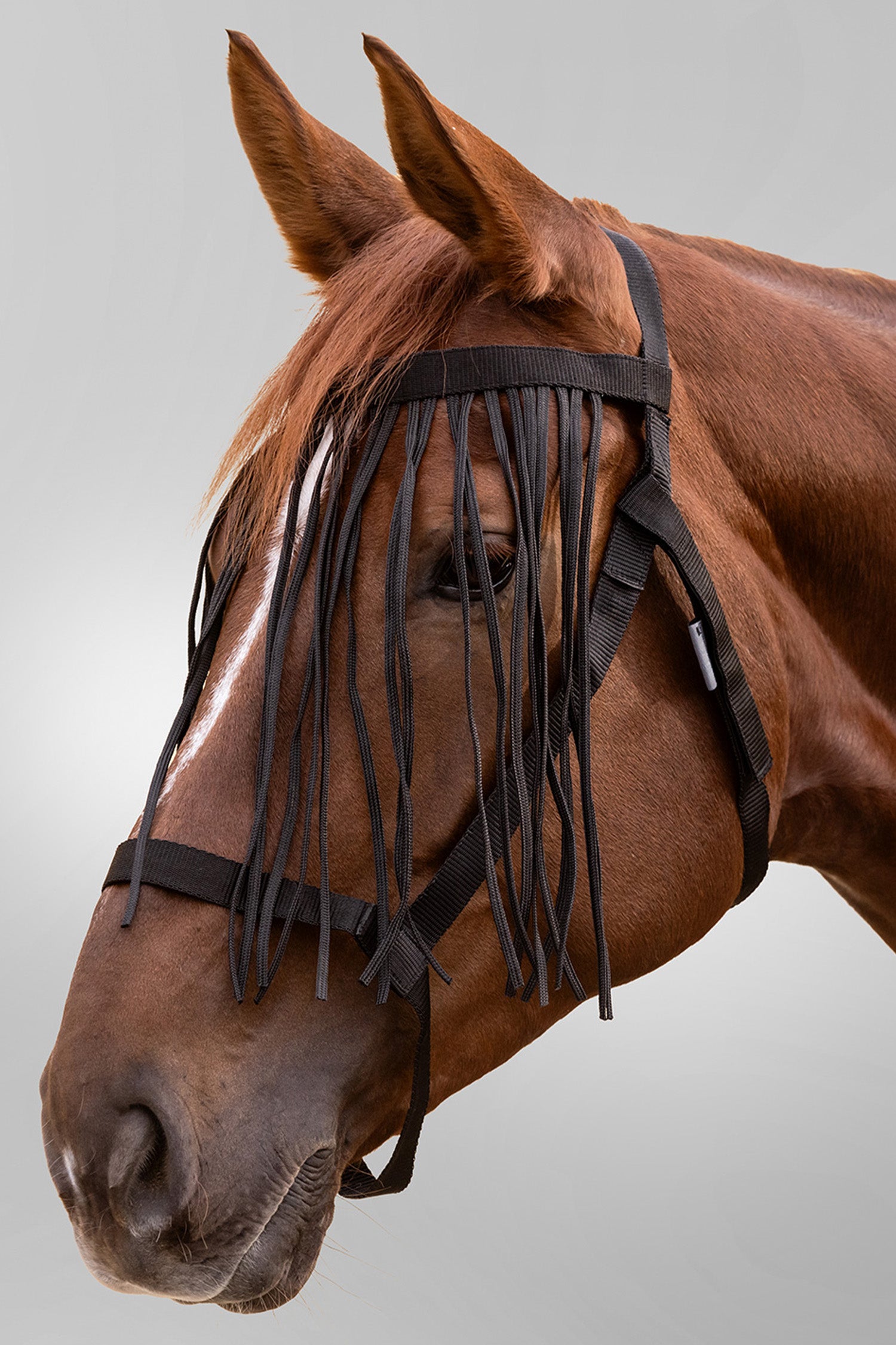 De mjuka fransarna skyddar ögonen från irriterande insekter, samtidigt som den lätta designen utan metallbeslag minskar risken för skav. Ett kardborrefäste på nackstycket gör att grimman löser ut vid tryck – vilket ger en extra säkerhetsfunktion om hästen skulle fastna. Även käkremmen stängs smidigt med kardborre.