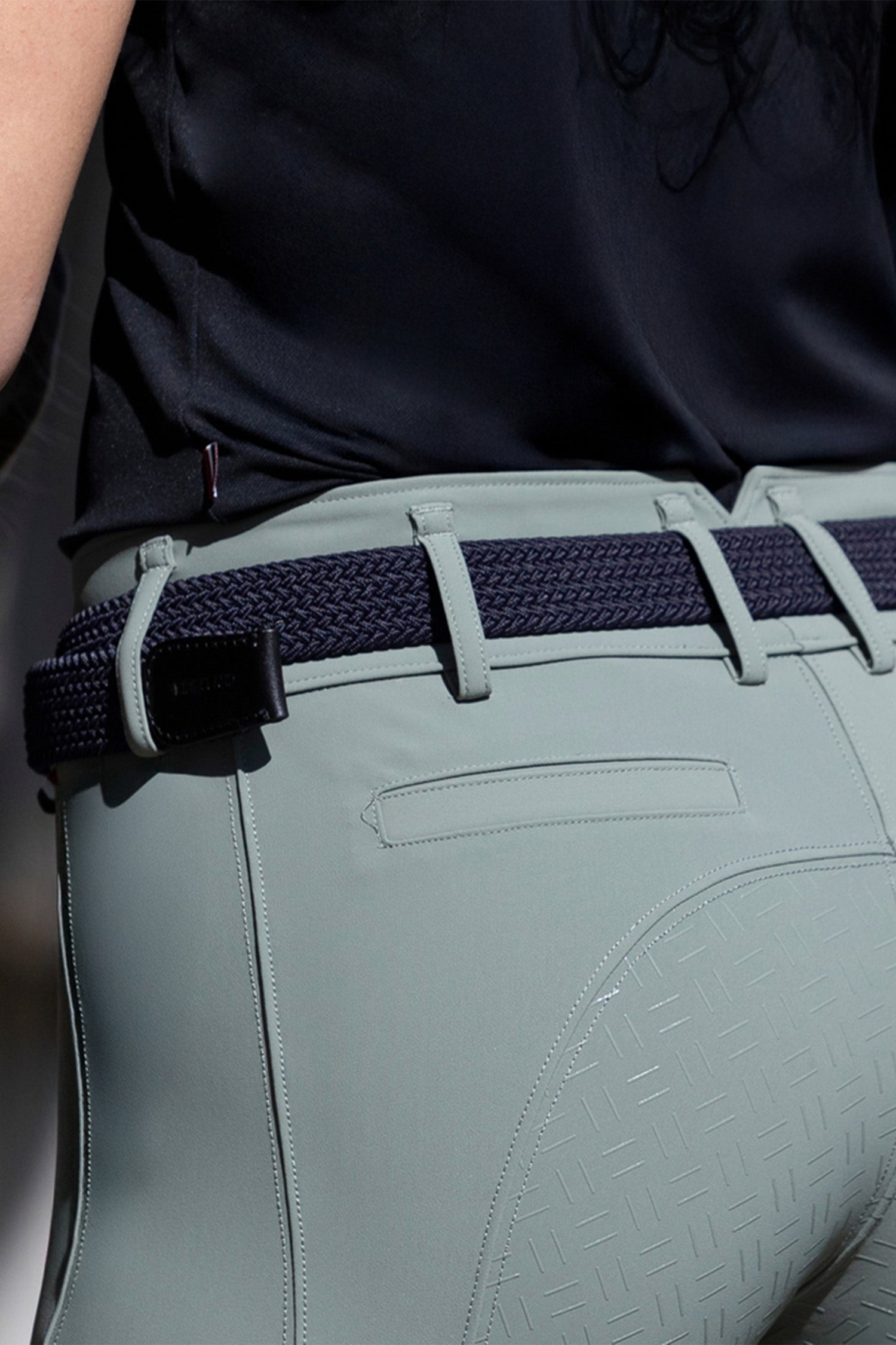 Det elastiske materiale giver sikker, men behagelig støtte i taljen og bevarer samtidig sin form over tid. Takket være den fleksible struktur kan bæltet nemt justeres for en perfekt pasform, hvilket gør det ideelt både til ridebukser og hverdagsbrug.