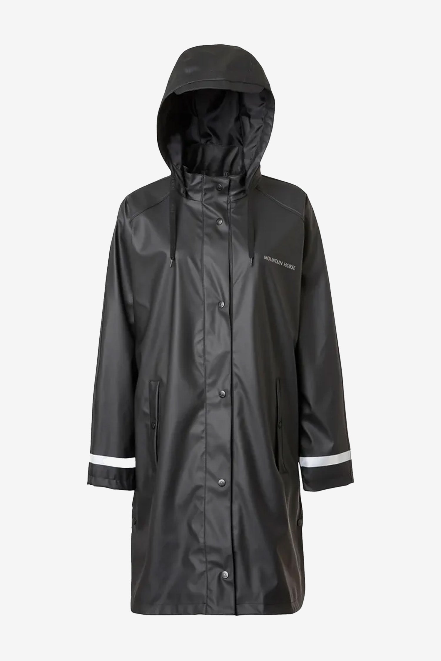 Mountain Horse rain poncho is a practical and protective garment that provides effective protection against rain and wind during riding and stable work. It is made of waterproof PU material with welded seams that keep moisture out even during heavy rain, making the poncho a reliable outer garment in wet weather conditions.