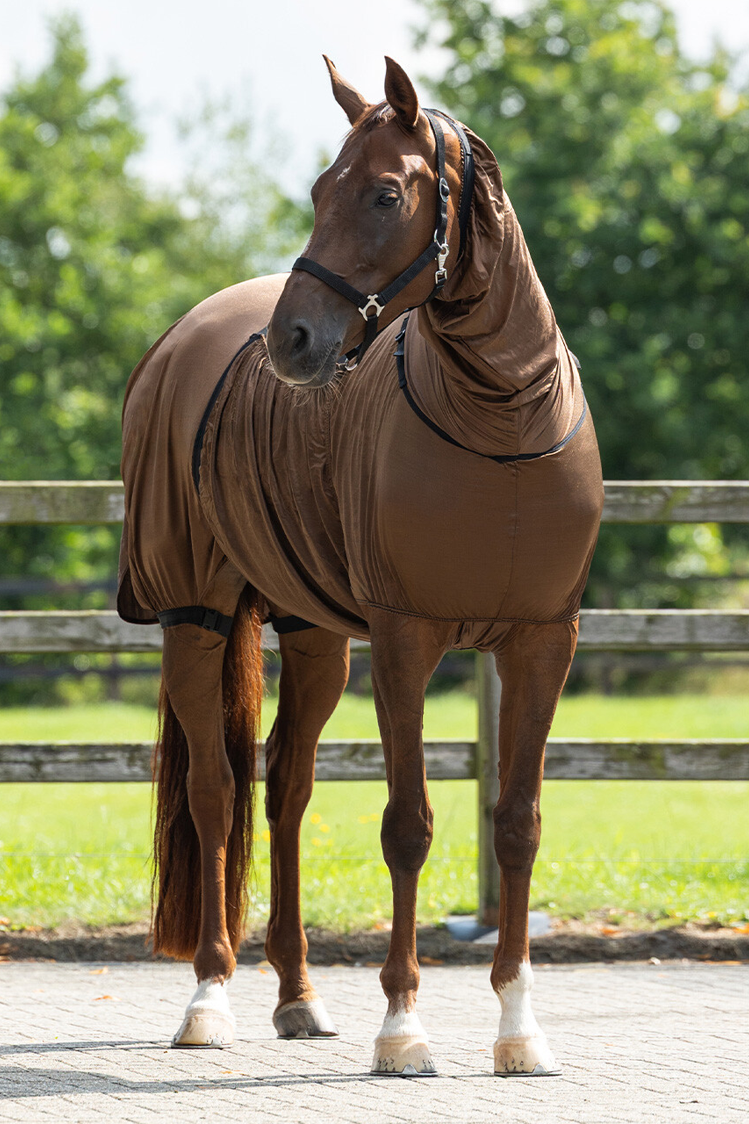 The fixed neck section has an elastic insert for a flexible fit. The wide belly flap with adjustable elastic straps provides extra protection over the belly, while the large tail flap protects the hindquarters. Elastic leg straps and elastic sections at the neck, belly, and legs help keep the rug stable and comfortable during movement.