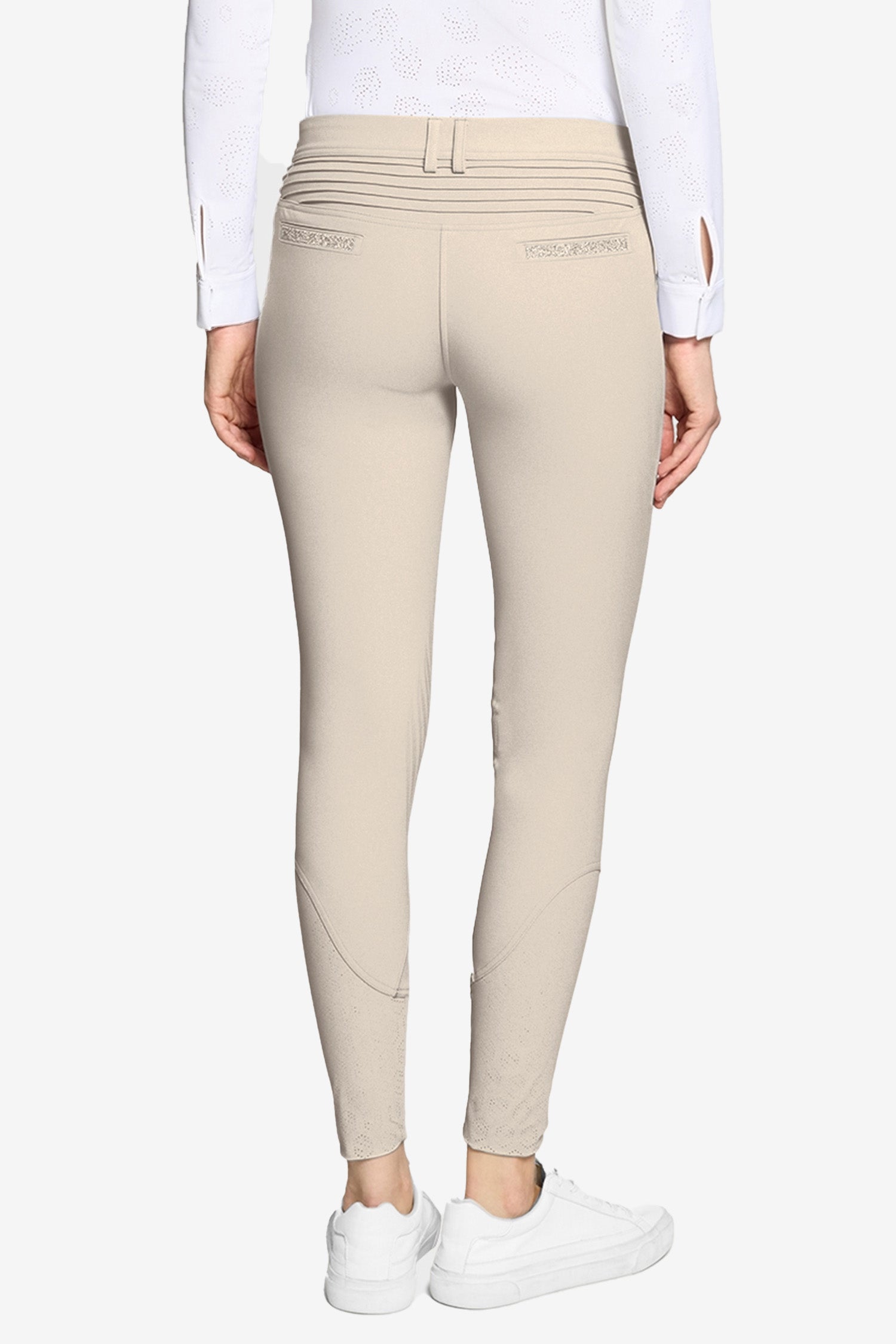 On the inside of the waistband, there is a silicone tape that prevents your shirt from riding up. Knee patches with silicone grip provide excellent hold in the saddle. On the left thigh, there is an elegant Samshield logo made of Swarovski crystals, and the back pockets are adorned with Crystal Fabric Swarovski, tying the whole look together.