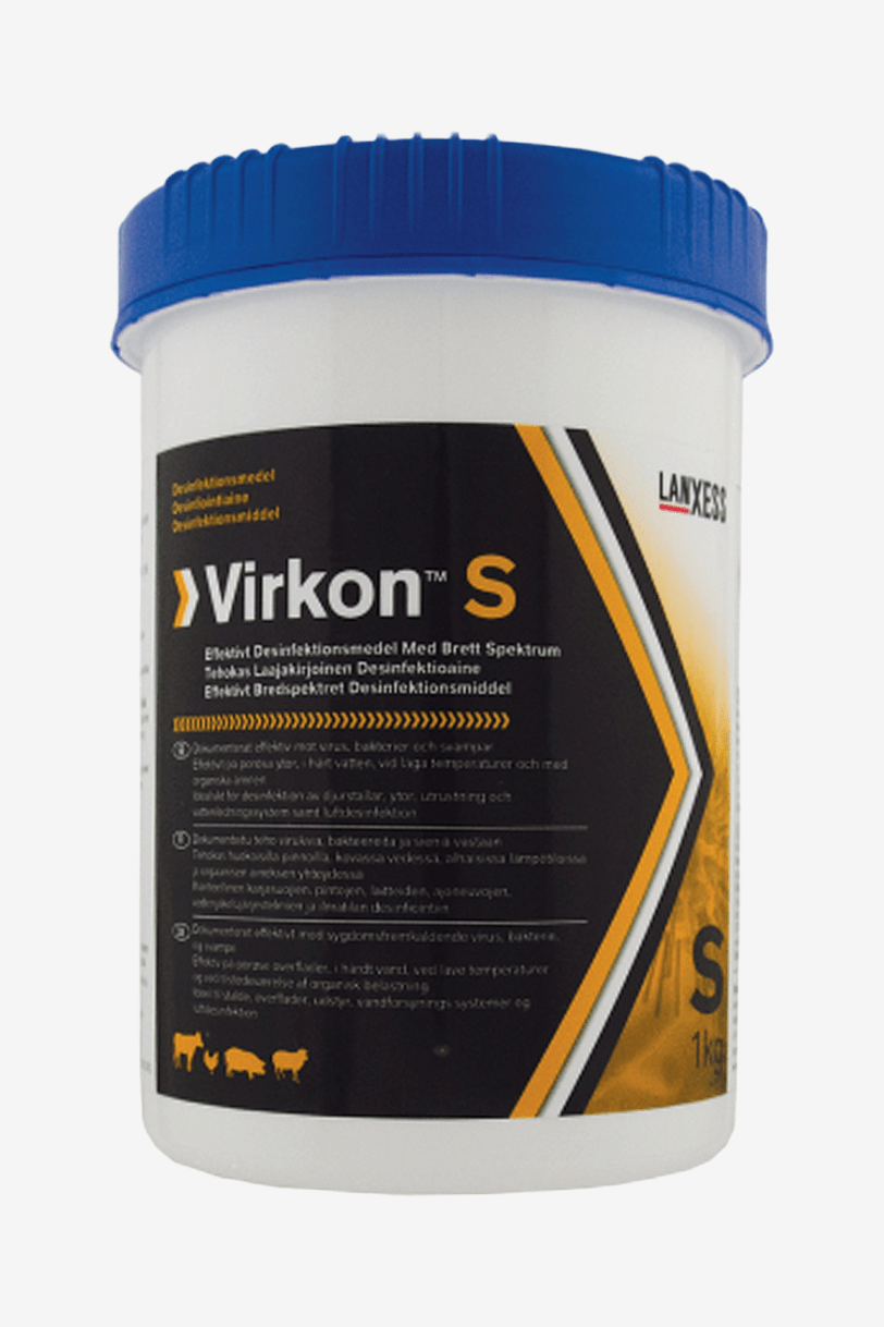 Virkon S är ett patenterat, biologiskt nedbrytbart desinfektionsmedel- effektivt mot virus, mykoplasma, bakterier, svamp och sporer. Använd till desinfektion av stallar, stövlar, instrument m.m.