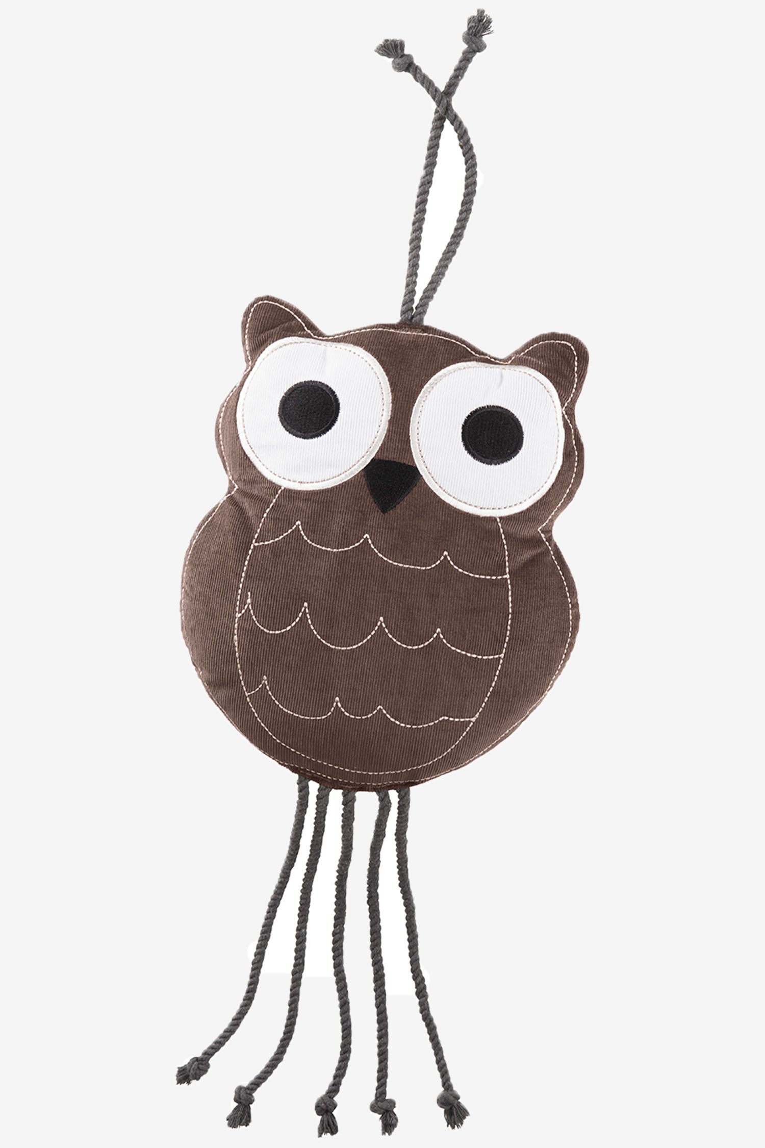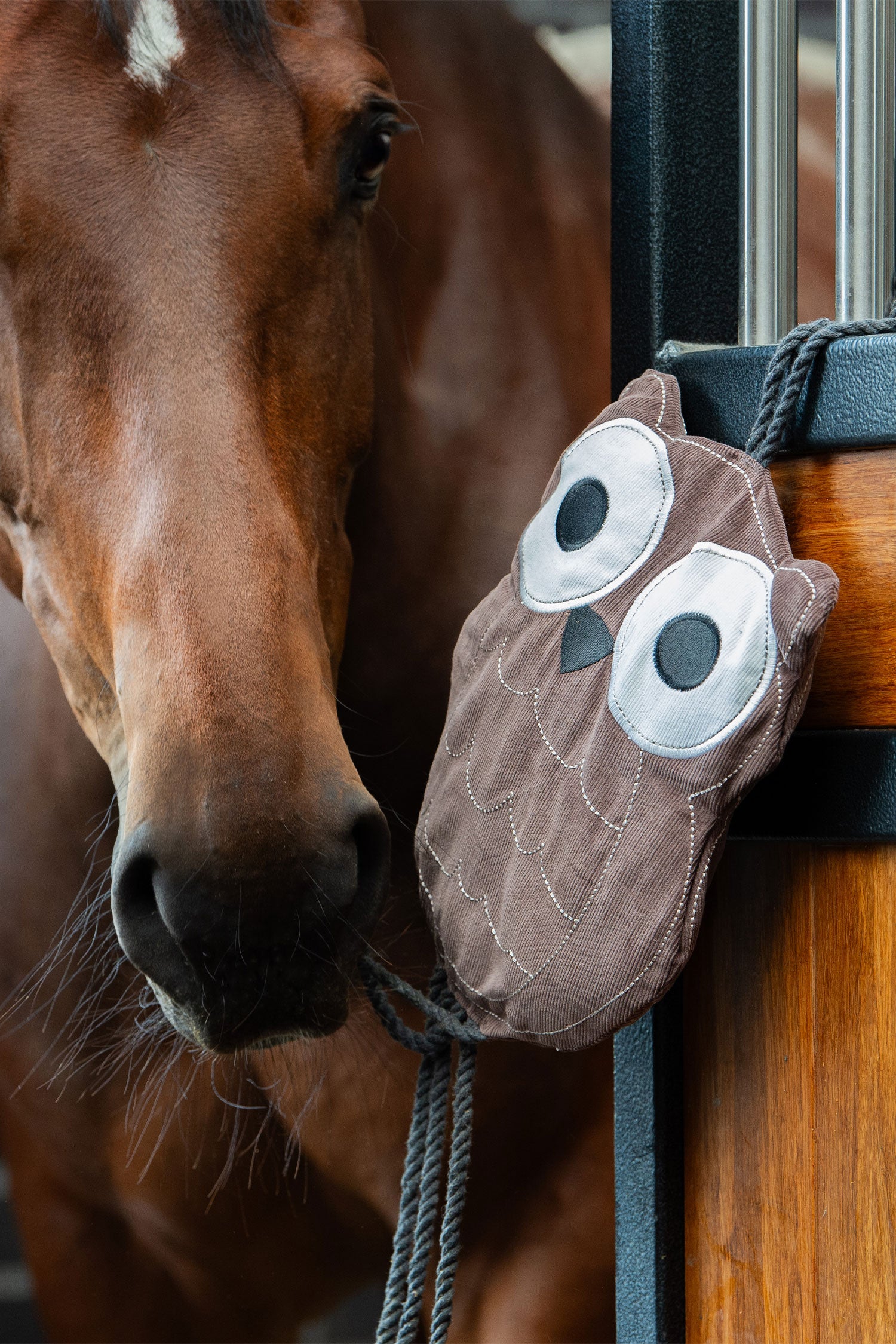 Hästleksak mot tristess i stallet eller hage i söt ugglelook från Eskadron. Manchesteryta. Rep att dra i och att knapra på. Jutefyllning.